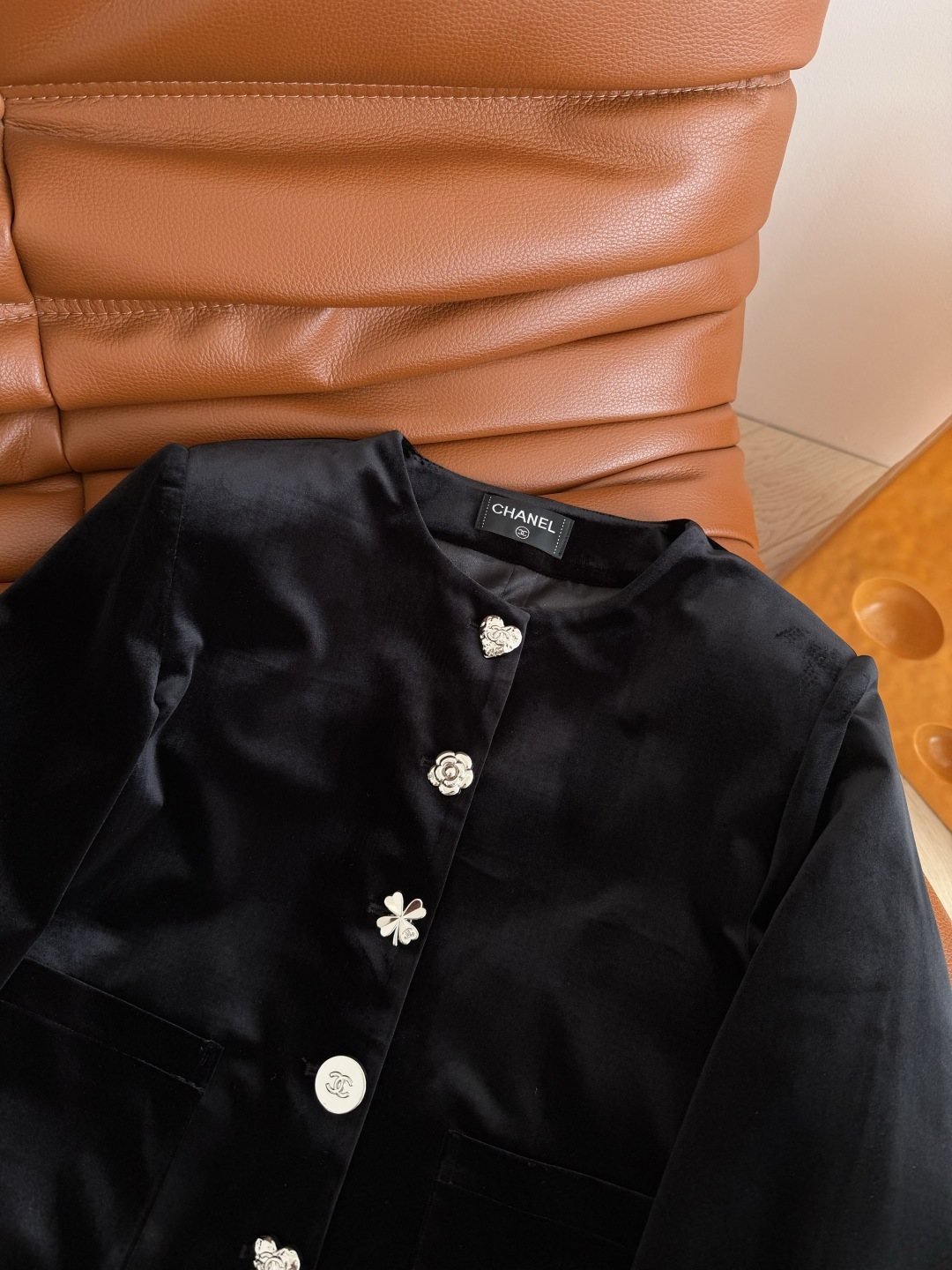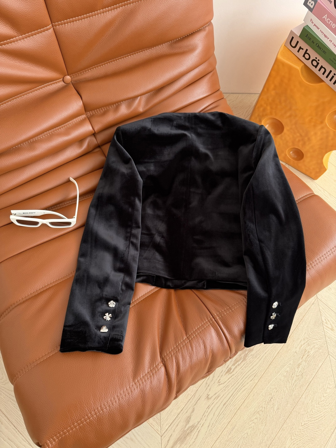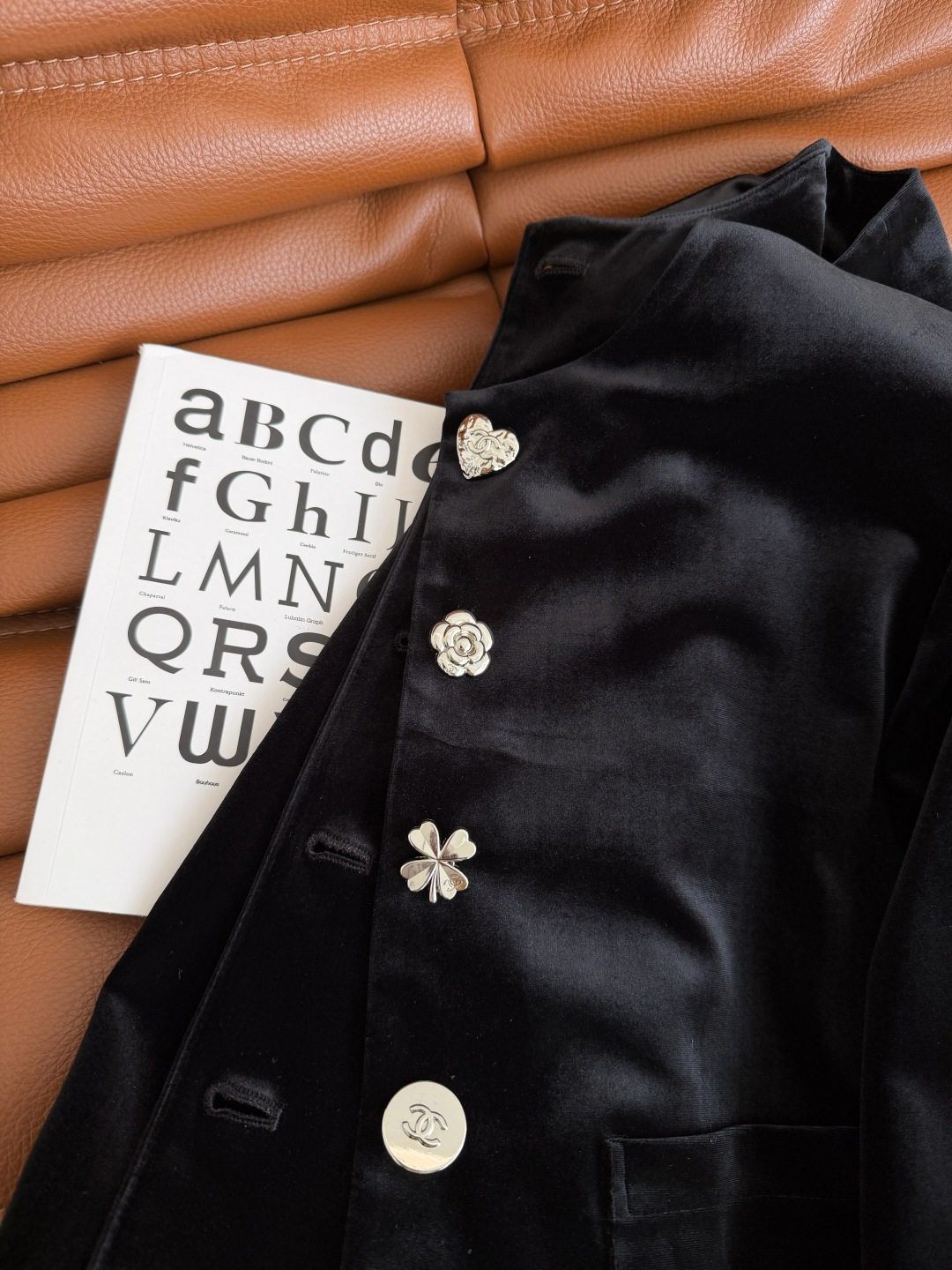 Details: Spring velvet coat with double C buttons, boxy style, suitable for all occasions.