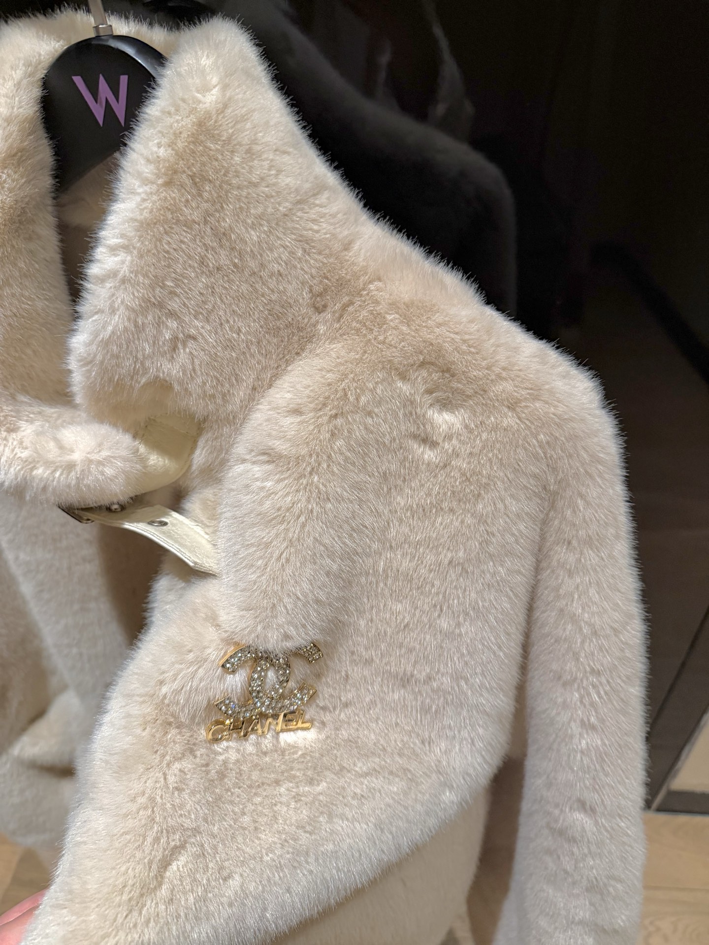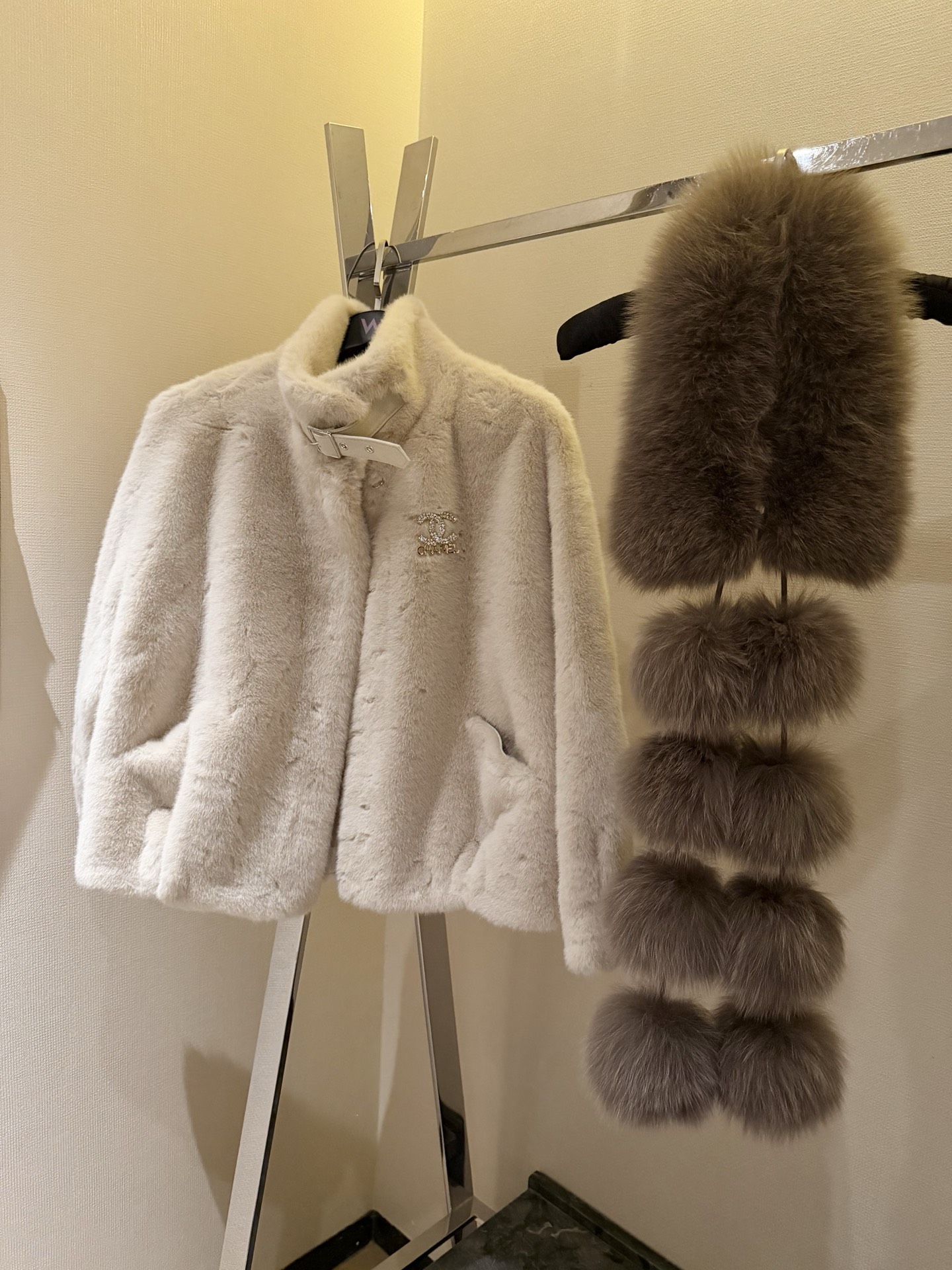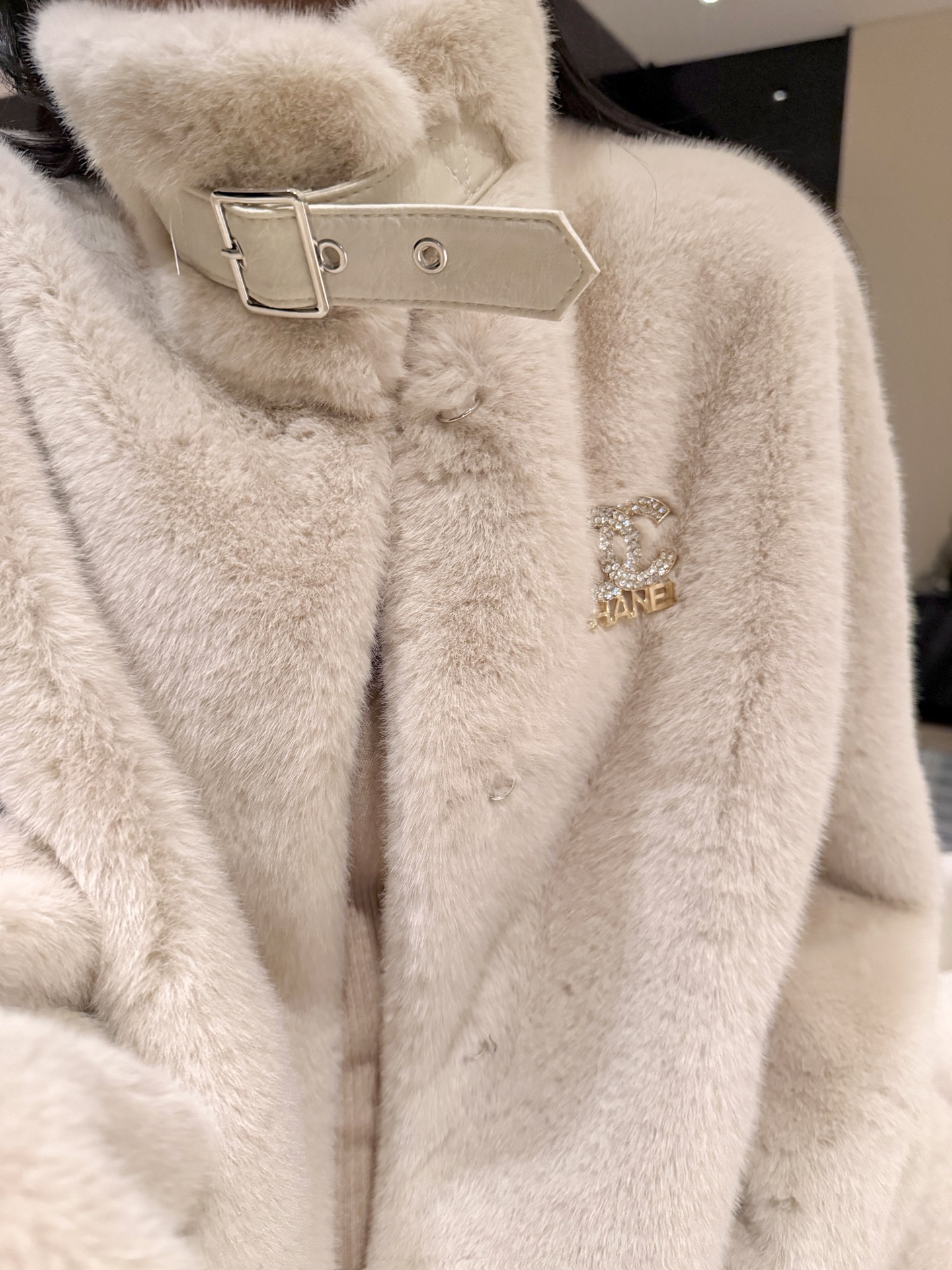 Details: New Year Party Fur Coat with Faux Fox Fur and Brooch, Elegant. High - end Custom, Fine Workmanship