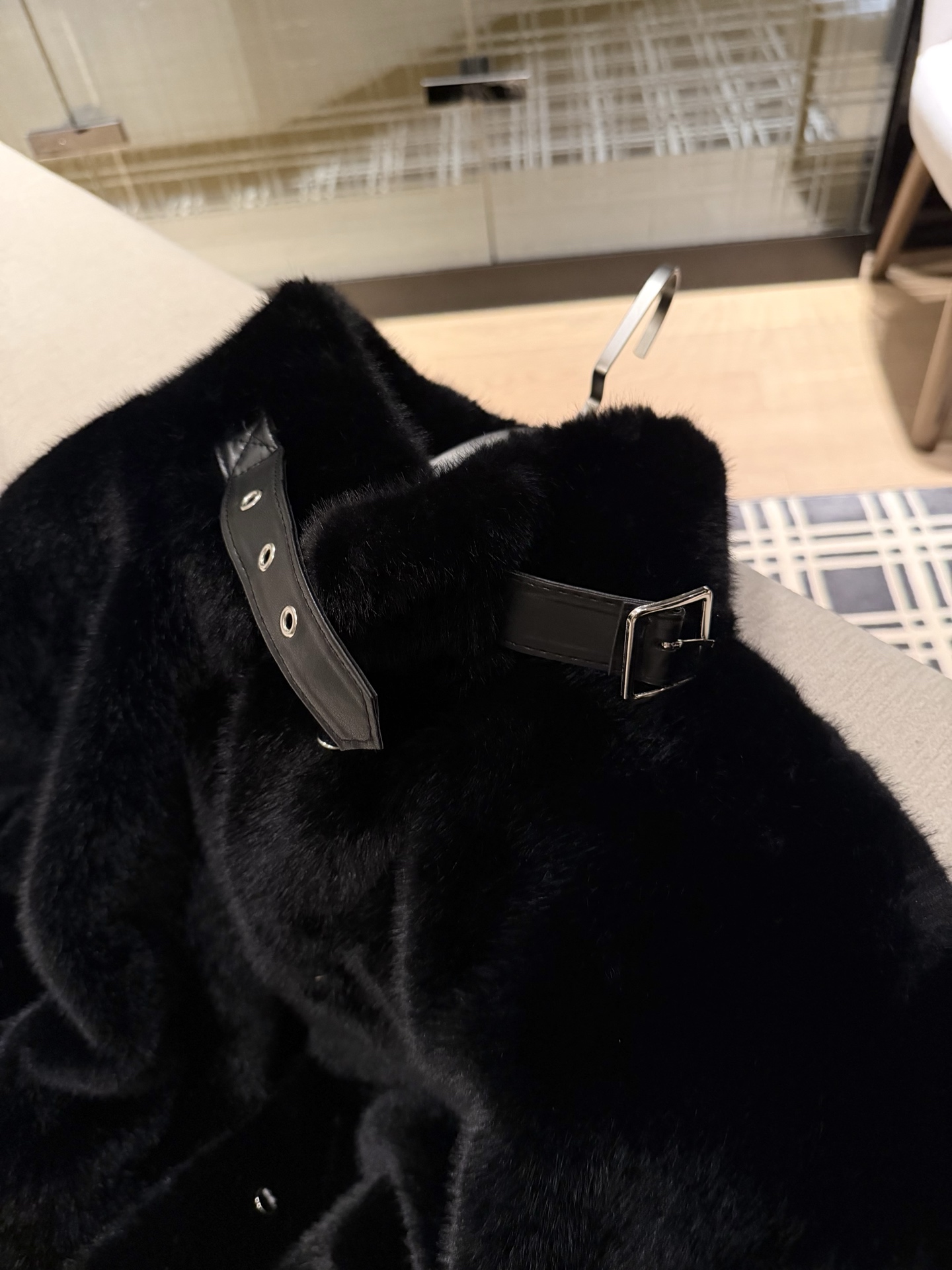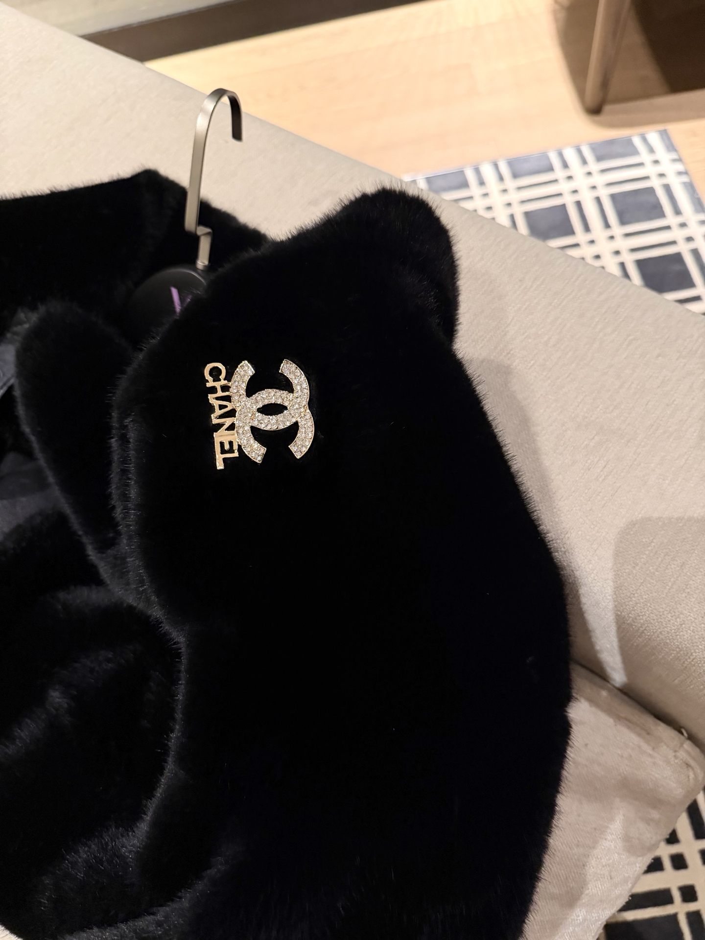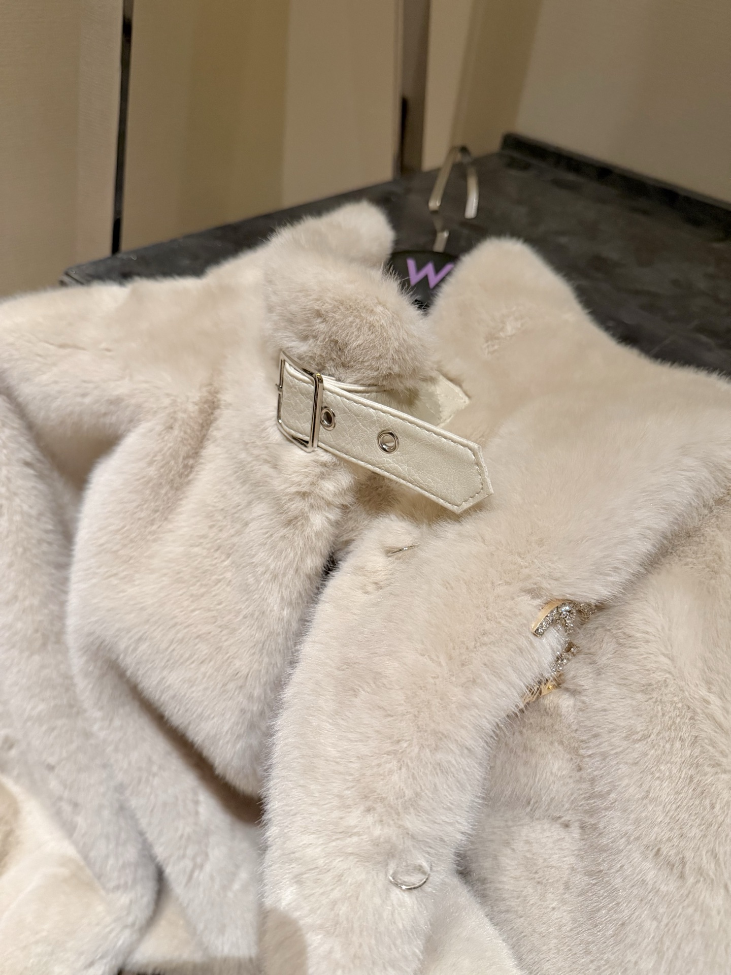 Details: New Year Party Fur Coat with Faux Fox Fur and Brooch, Elegant. High - end Custom, Fine Workmanship