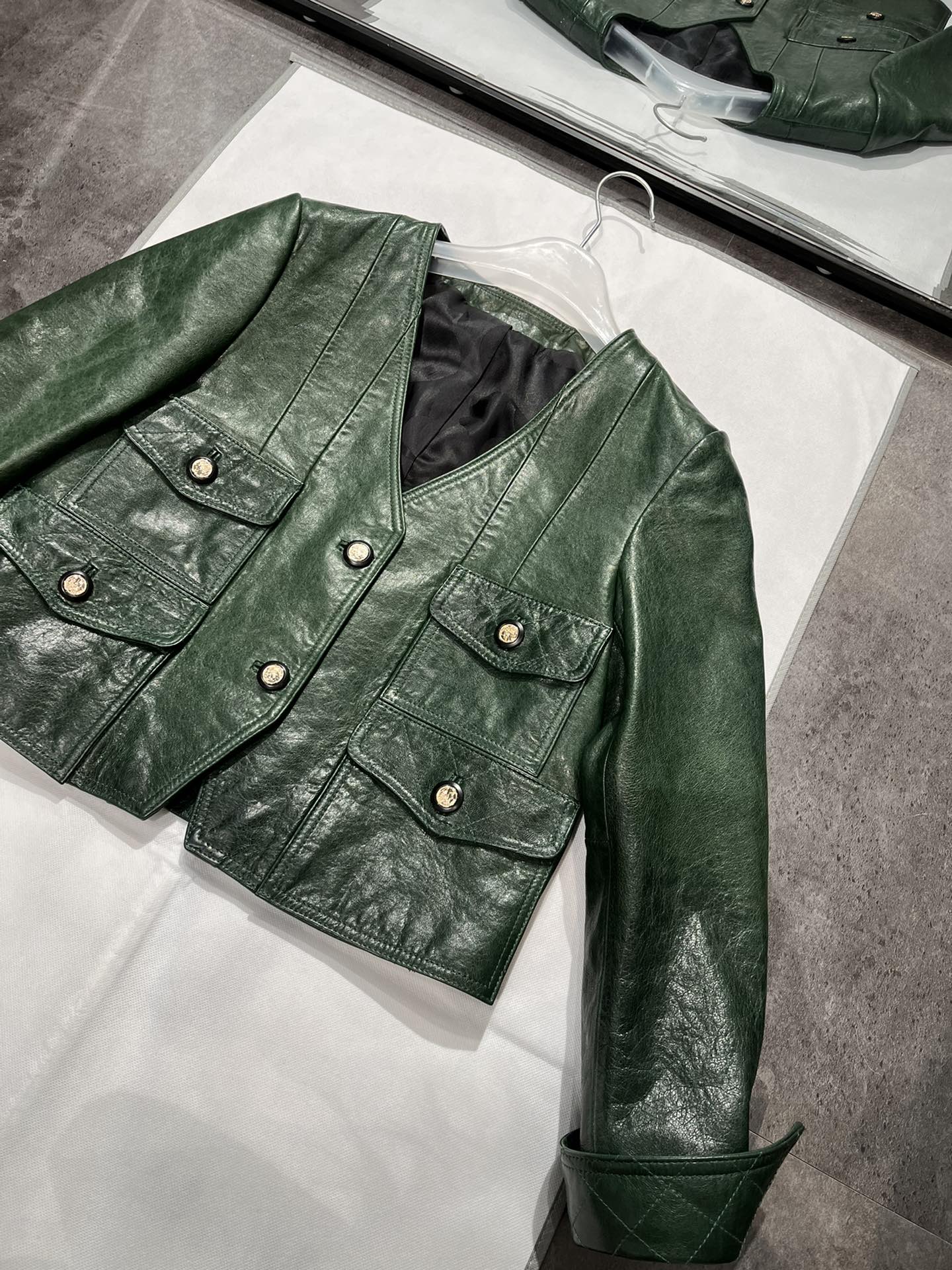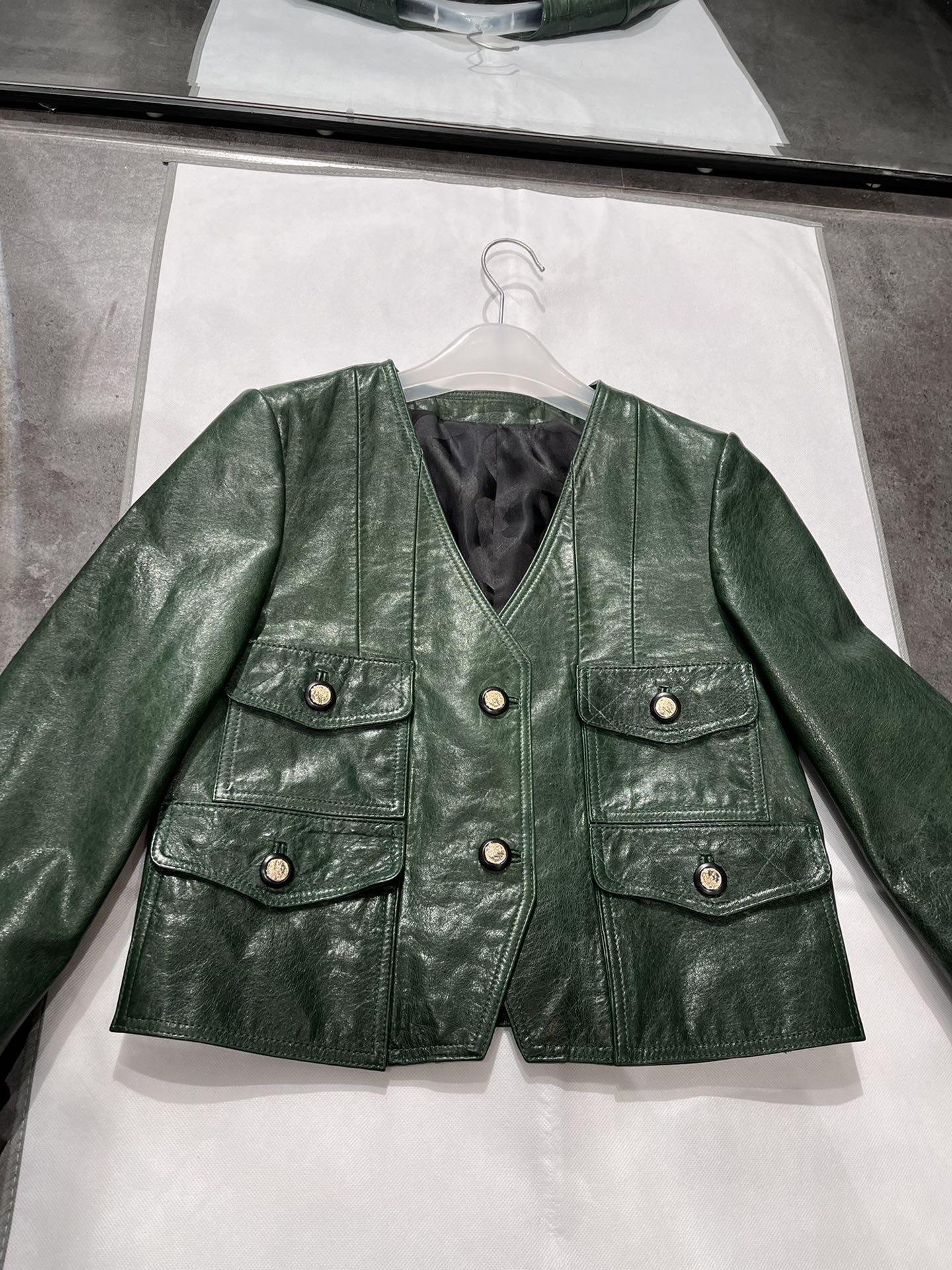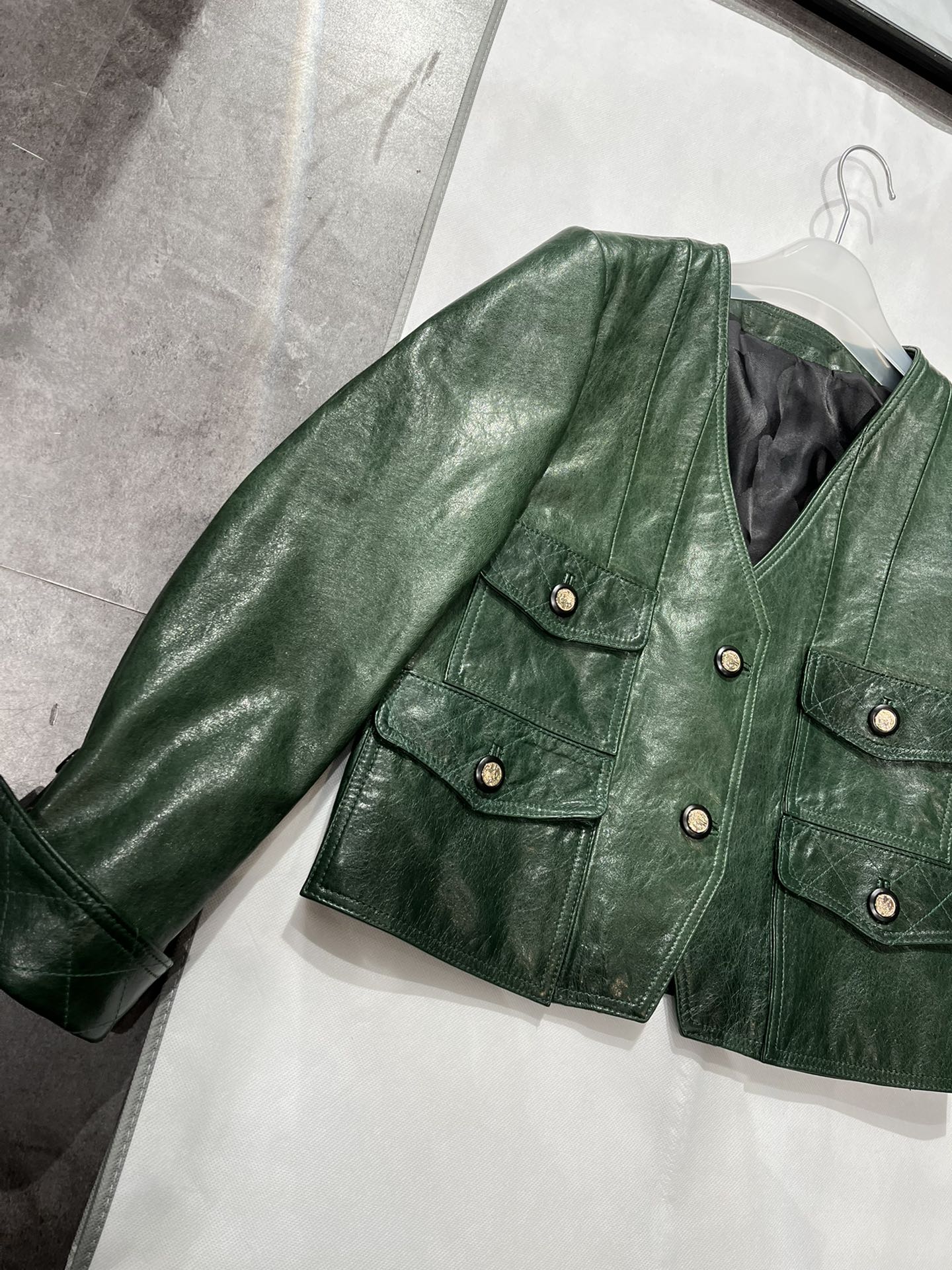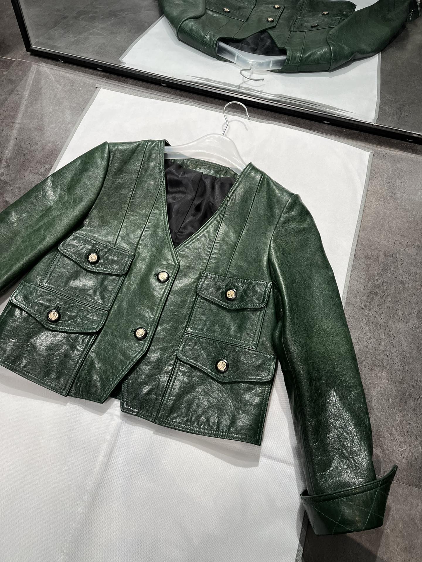 Details: V - neck vintage dark green waxed sheepskin top in S & XL sizes, stylish and slimming