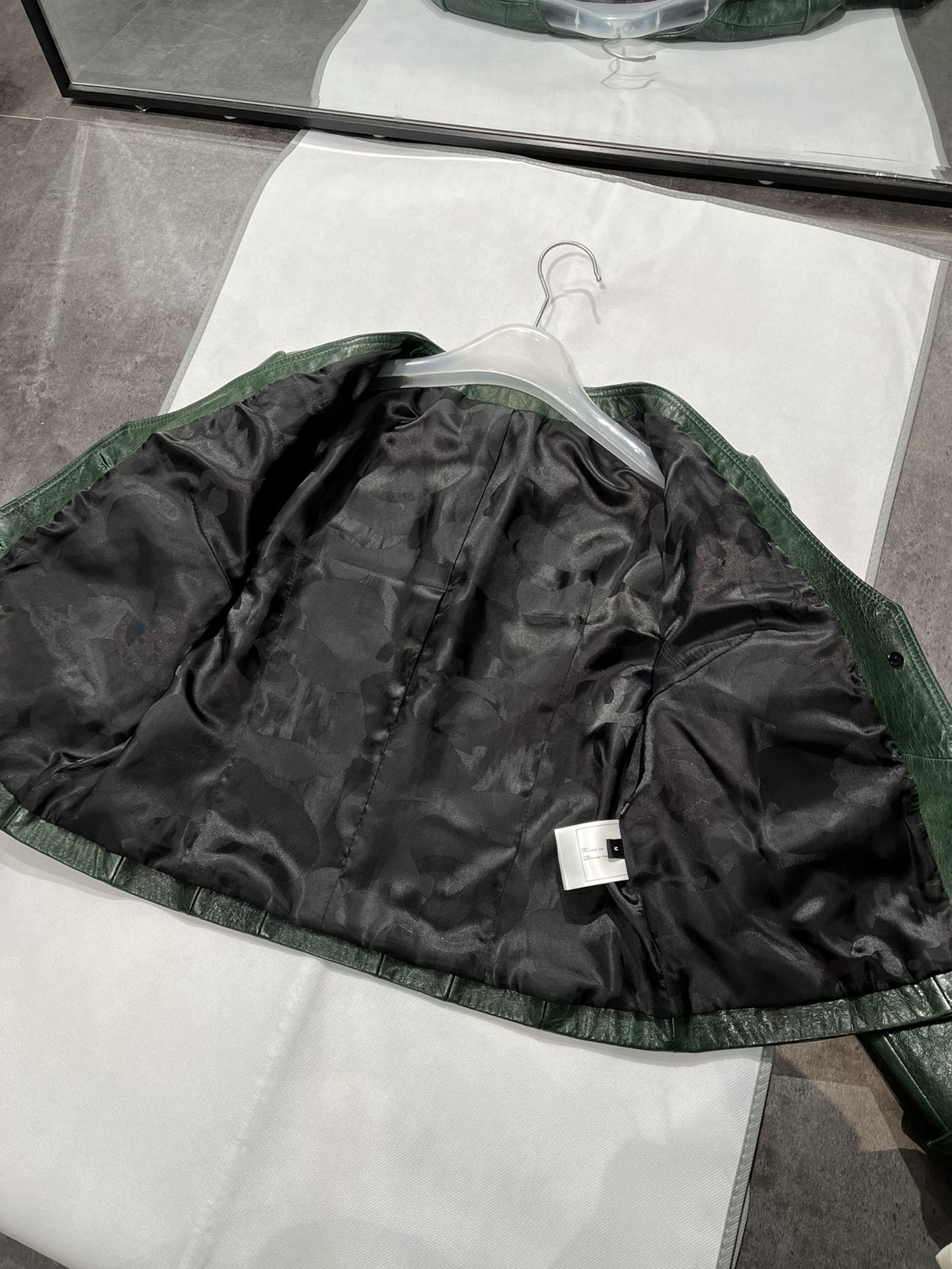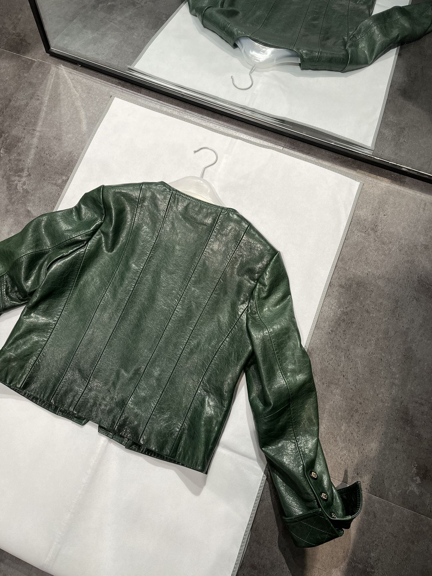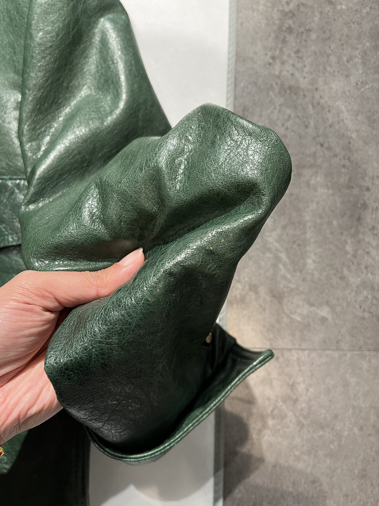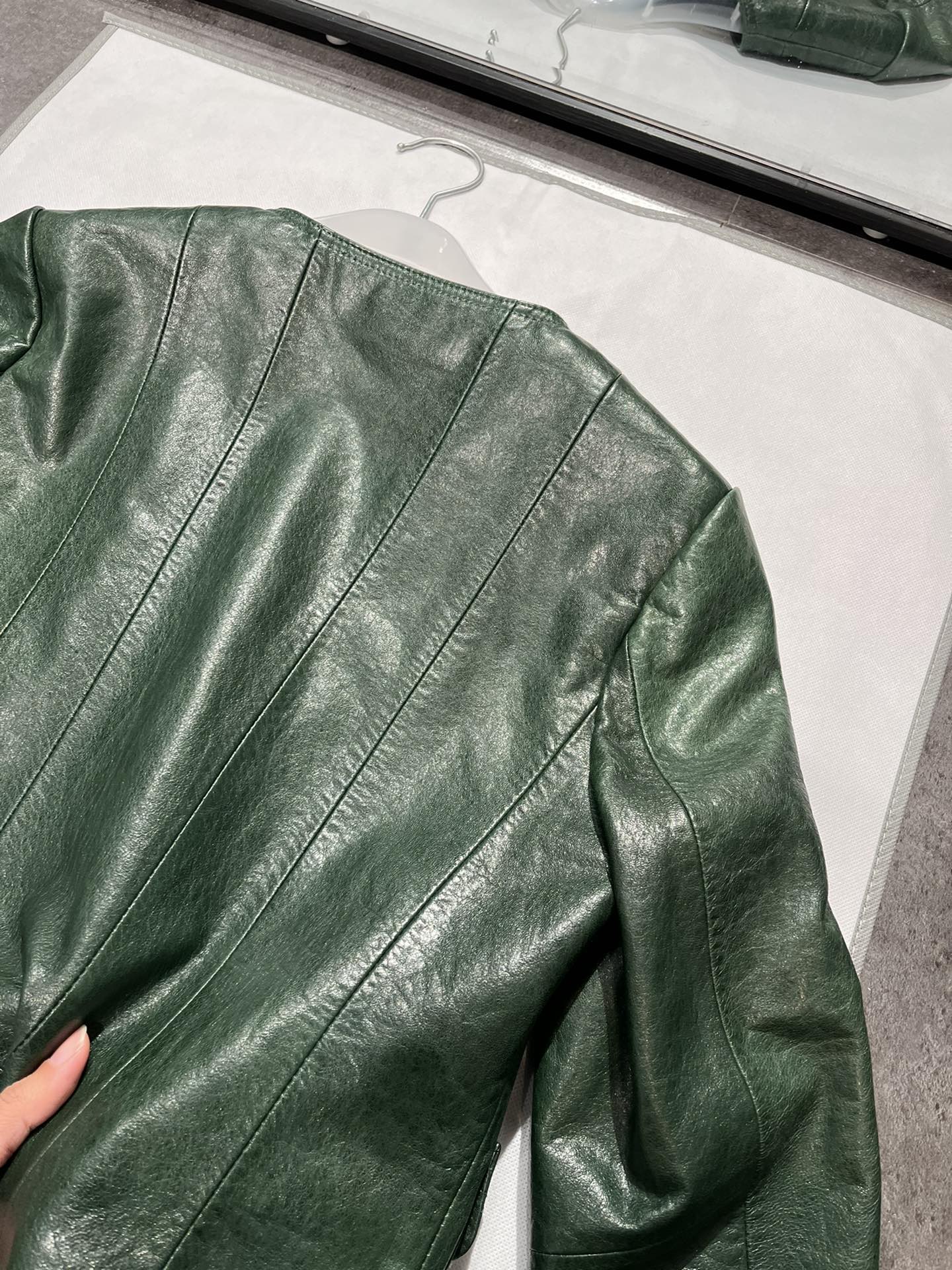 Details: V - neck vintage dark green waxed sheepskin top in S & XL sizes, stylish and slimming