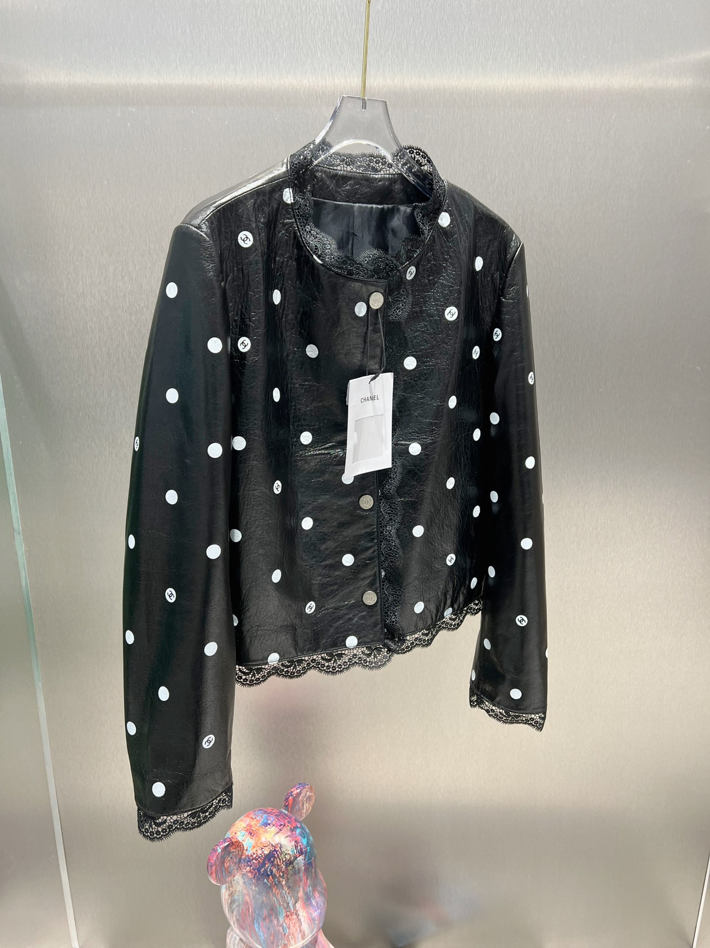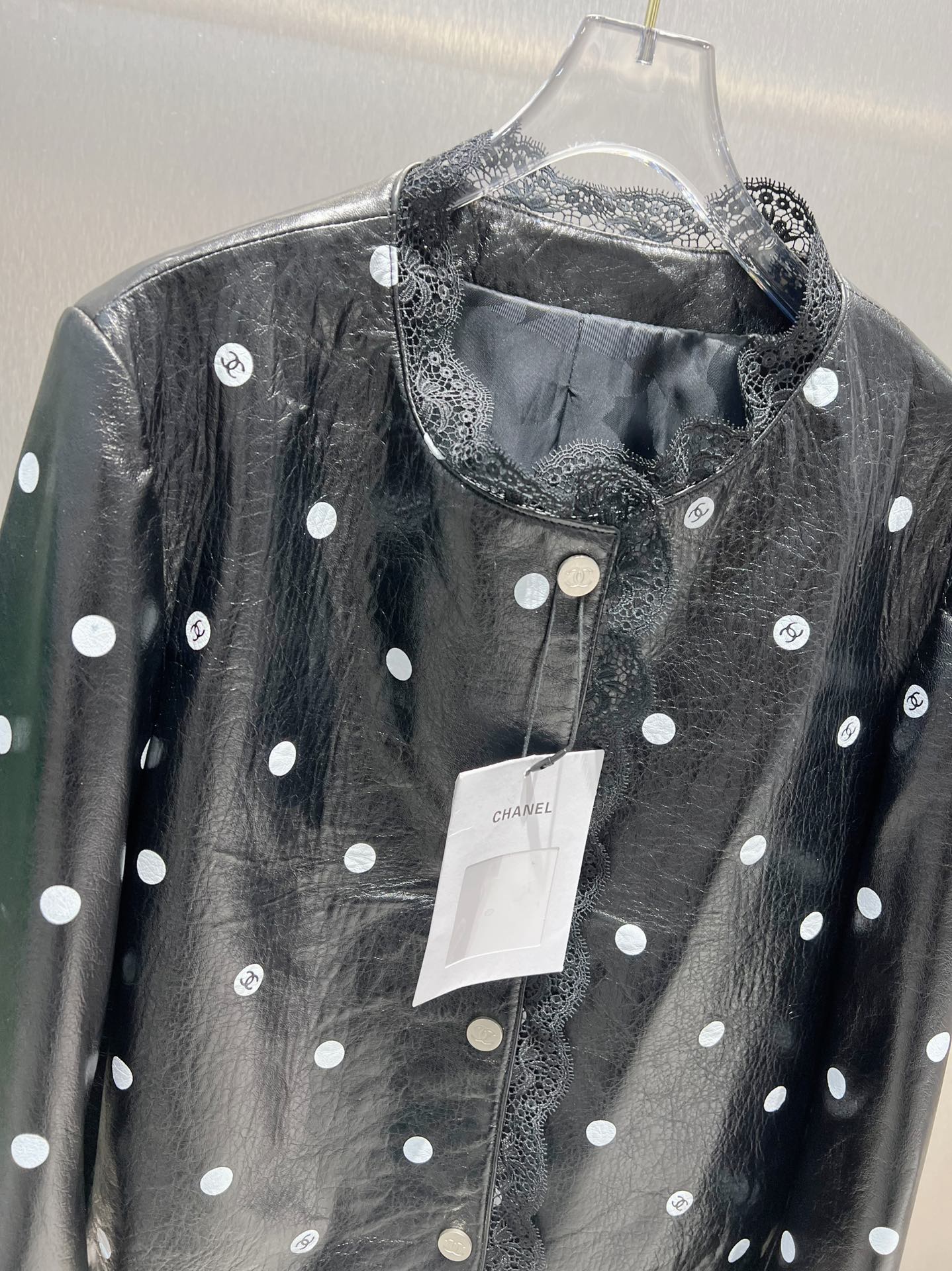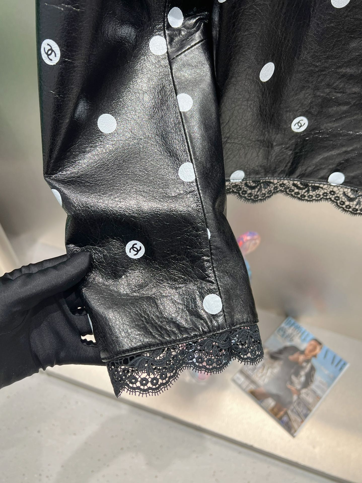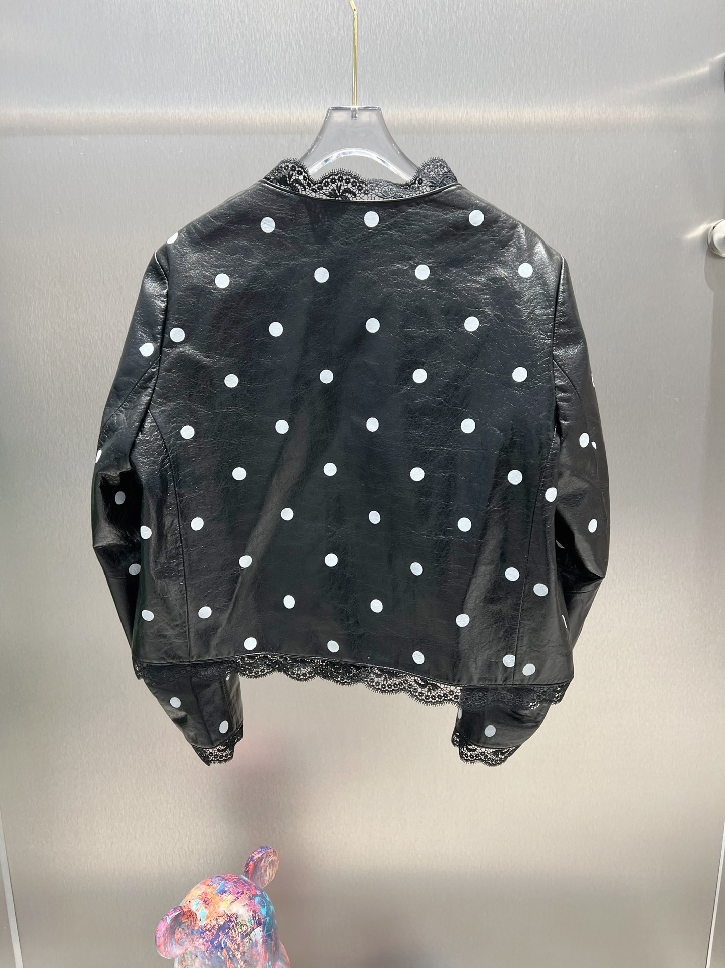 Details: Early spring genuine leather jacket with polka dot print and lace decoration, perfect fit, high-grade customization, fine workmanship