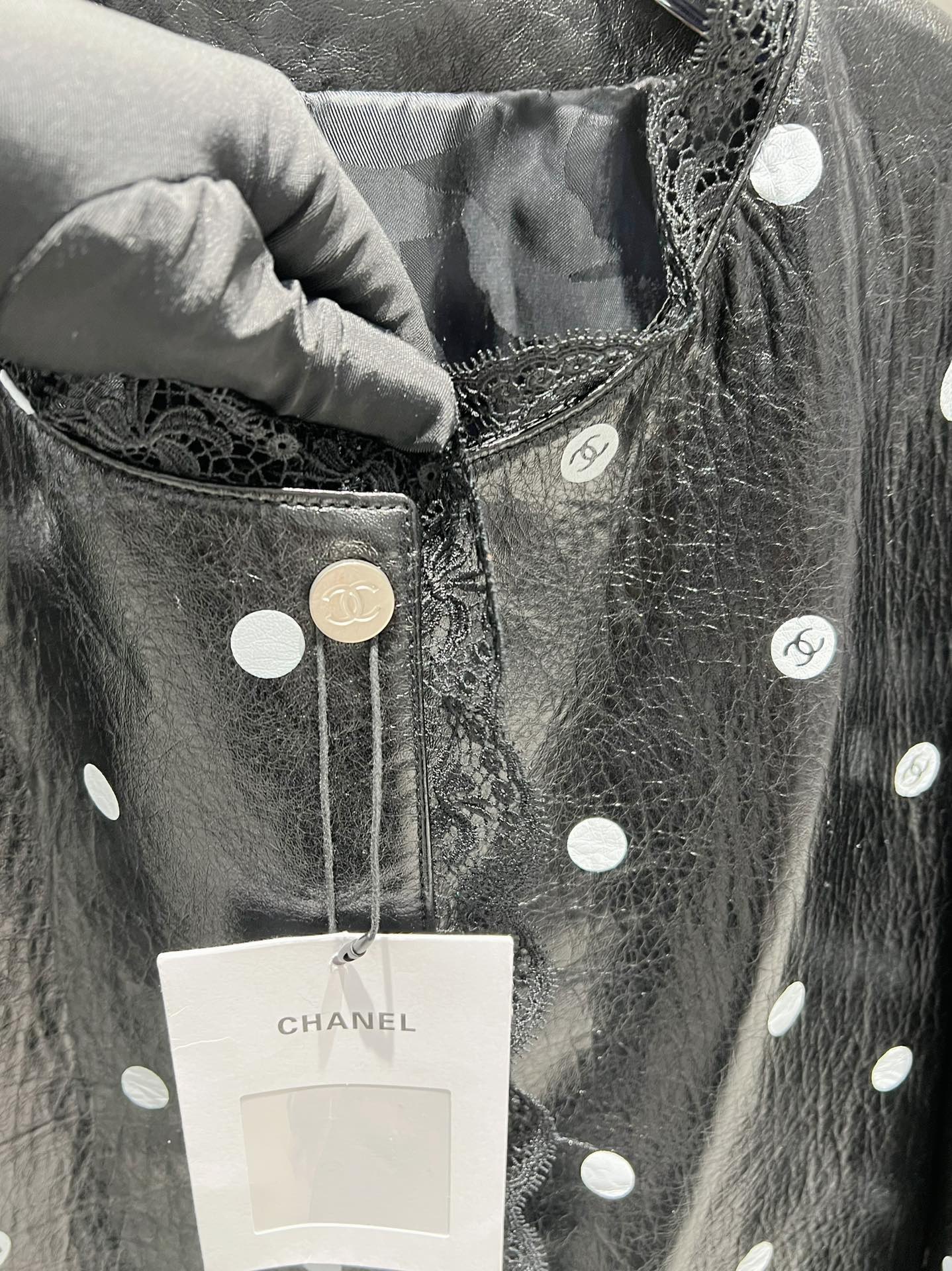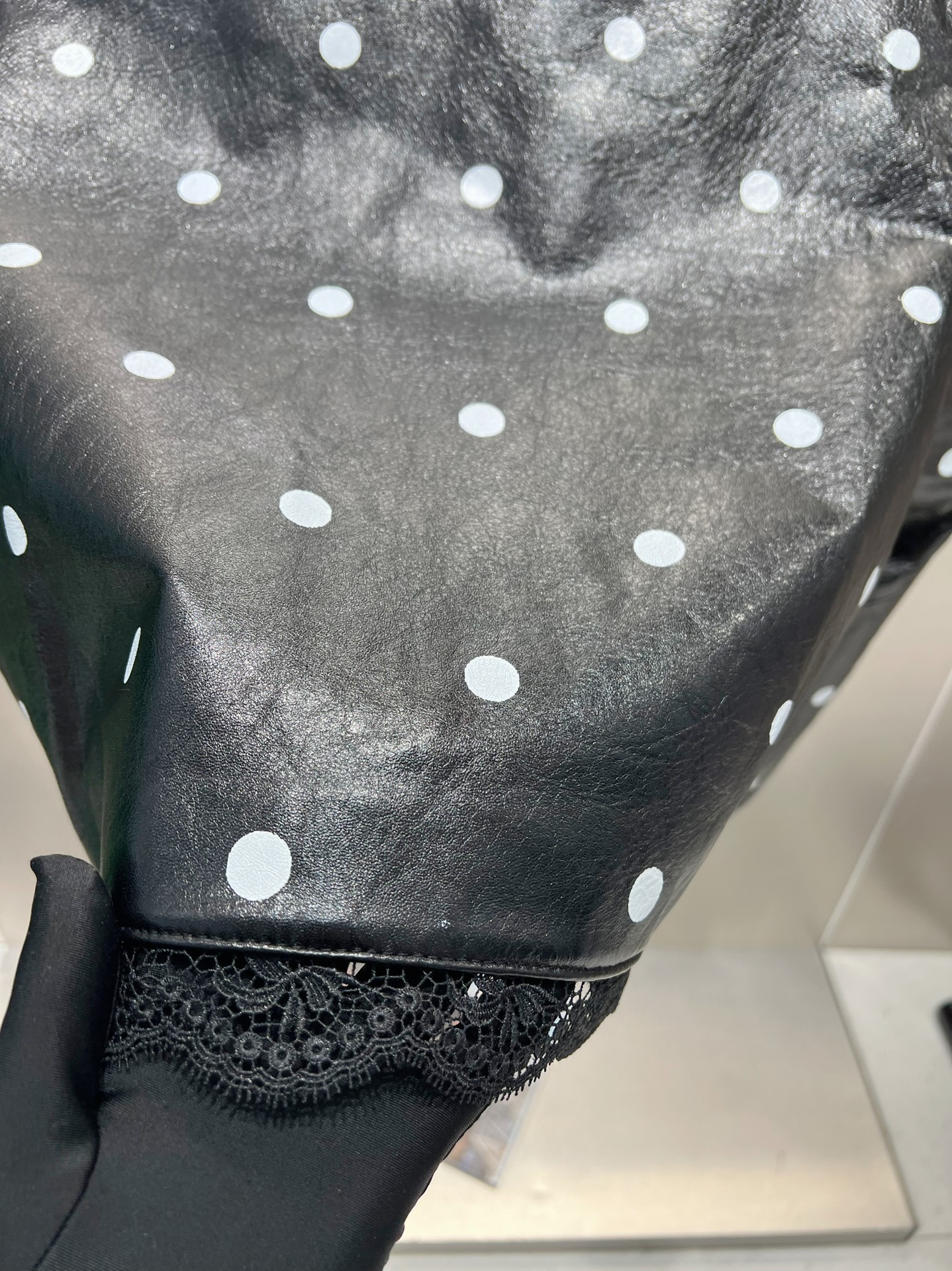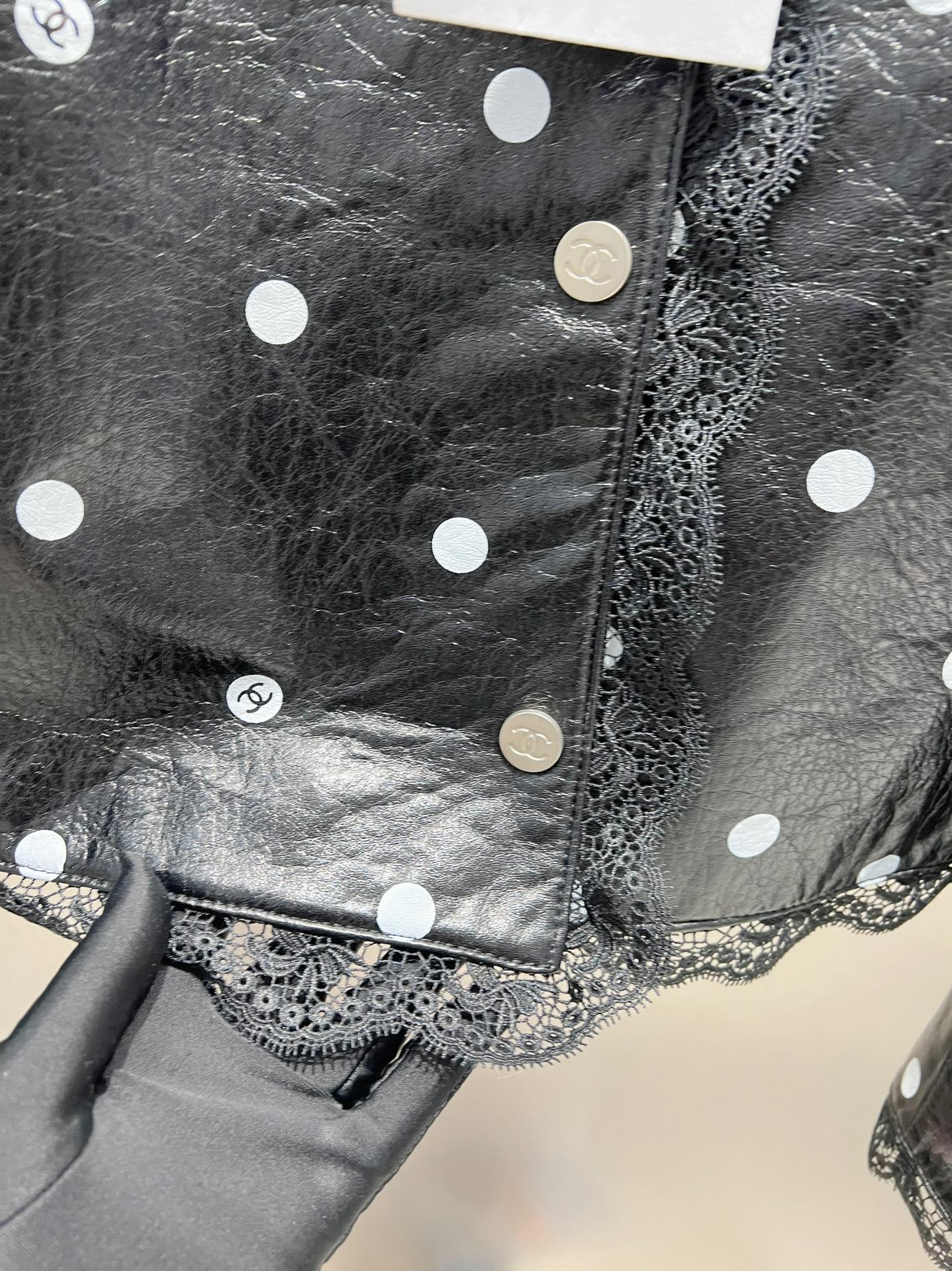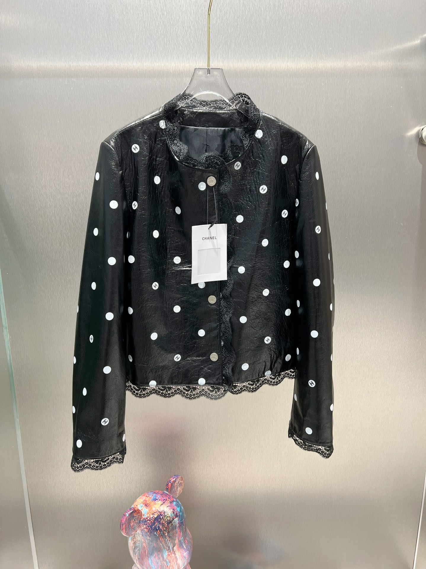 Details: Early spring genuine leather jacket with polka dot print and lace decoration, perfect fit, high-grade customization, fine workmanship