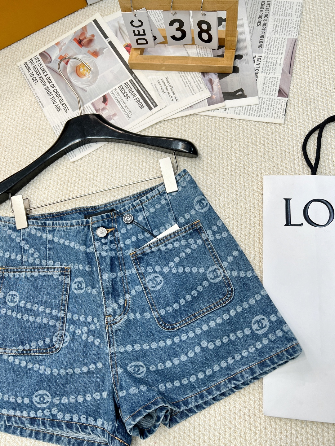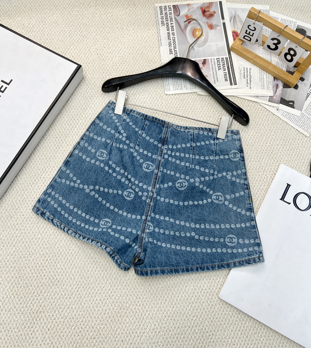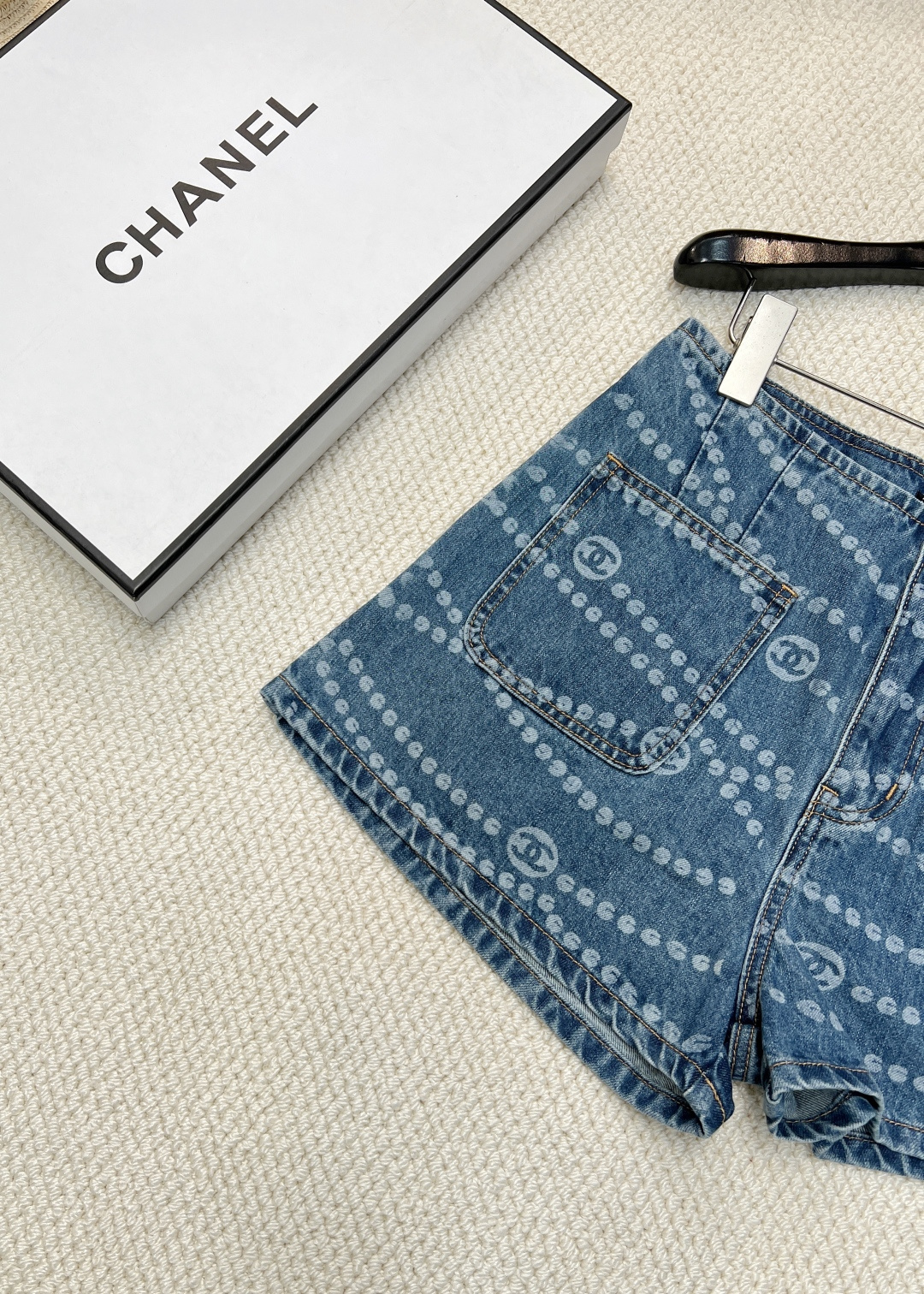 Details: Spring-summer denim shorts with a certain brand-inspired polka dot and double C laser burnout, made of high-quality organic cotton, exuding a vintage yet sophisticated charm.