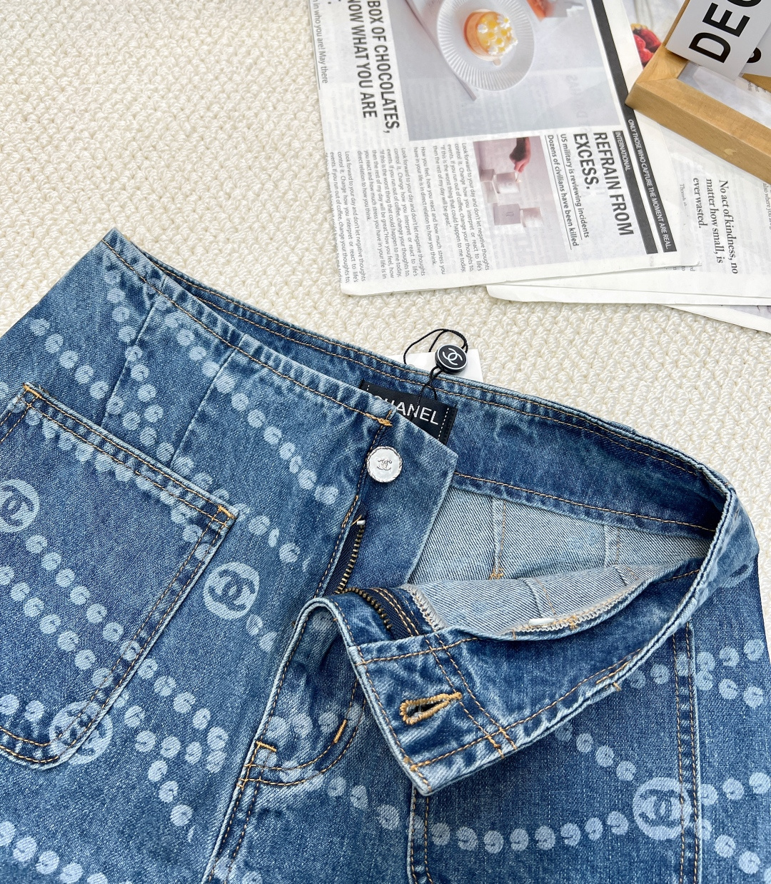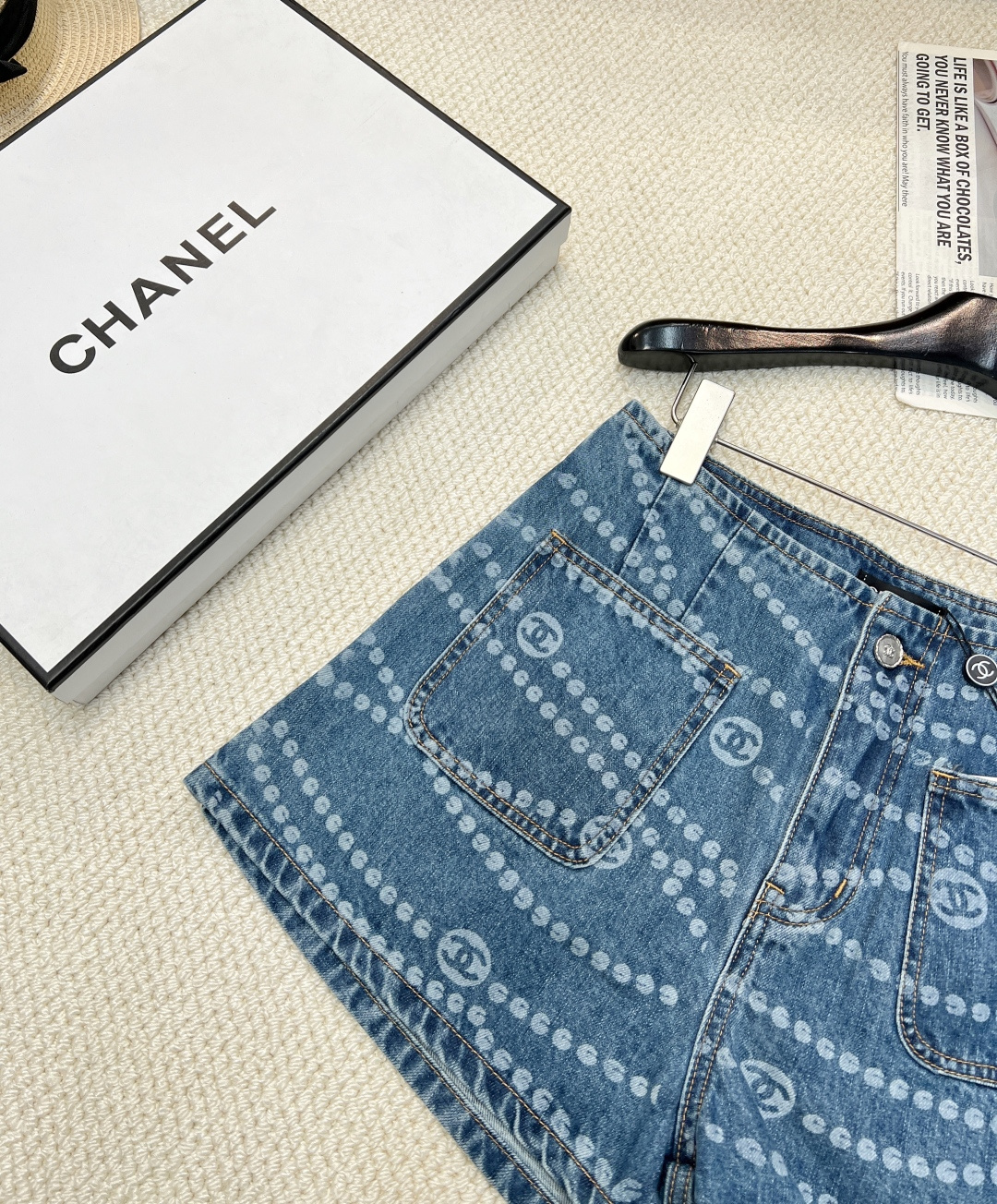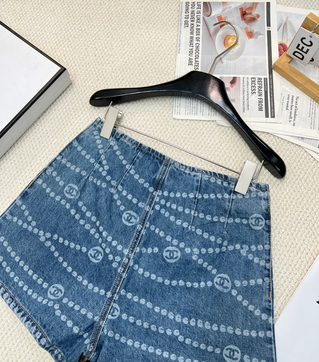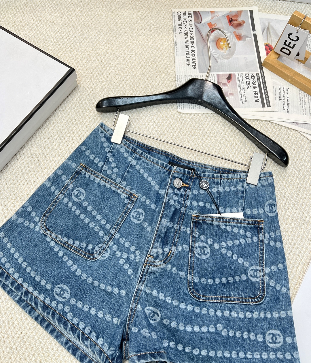 Details: Spring-summer denim shorts with a certain brand-inspired polka dot and double C laser burnout, made of high-quality organic cotton, exuding a vintage yet sophisticated charm.