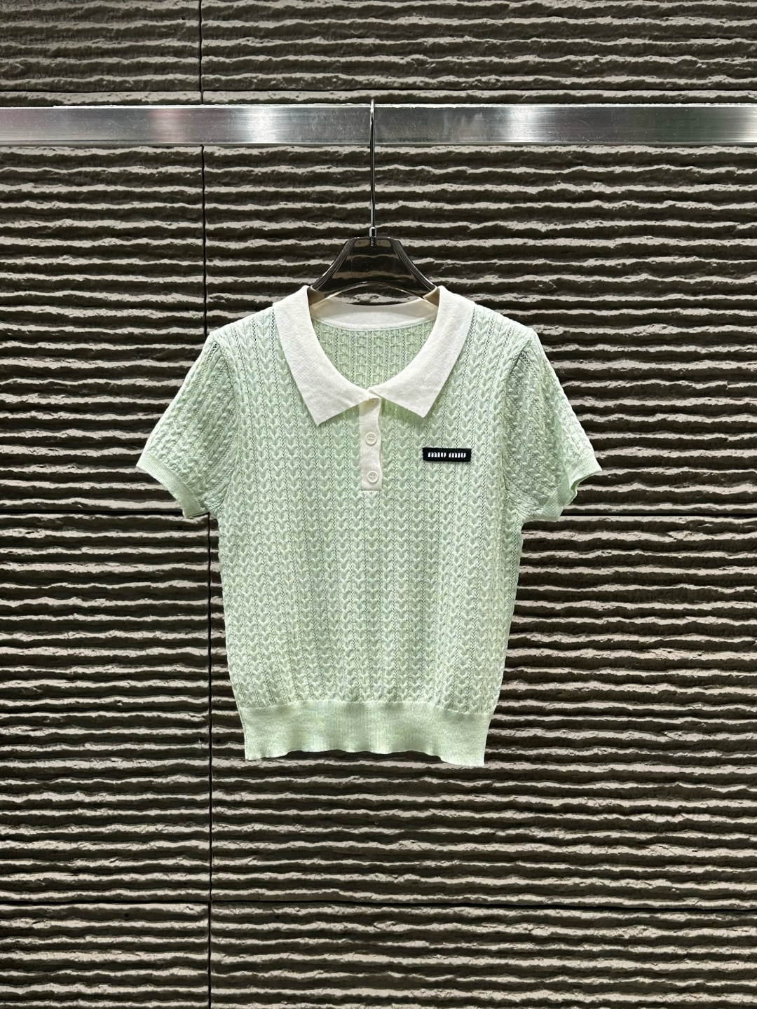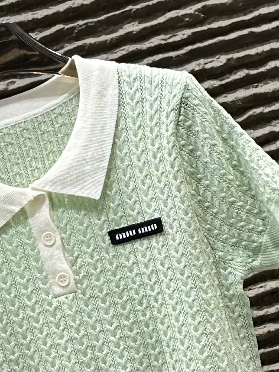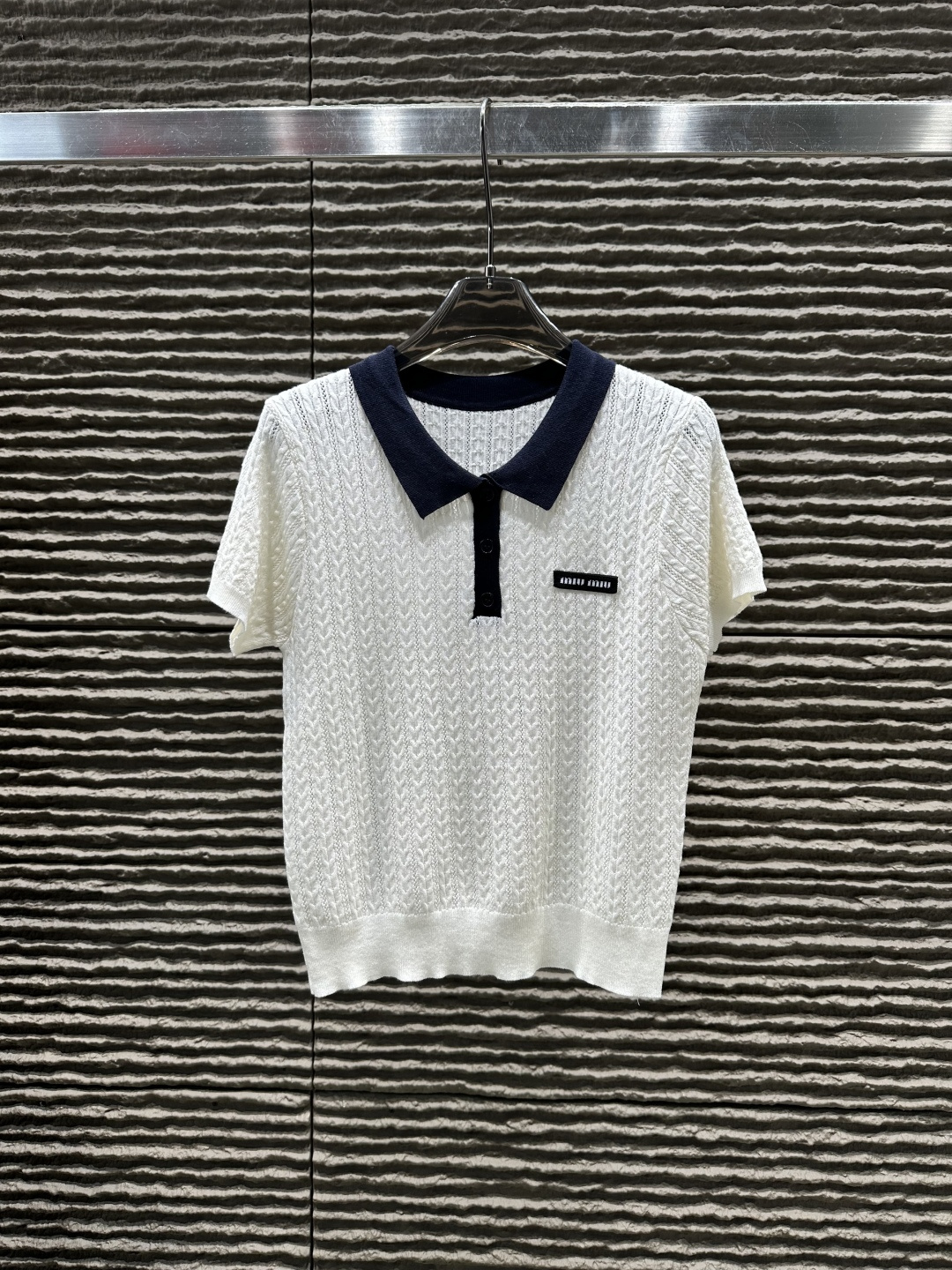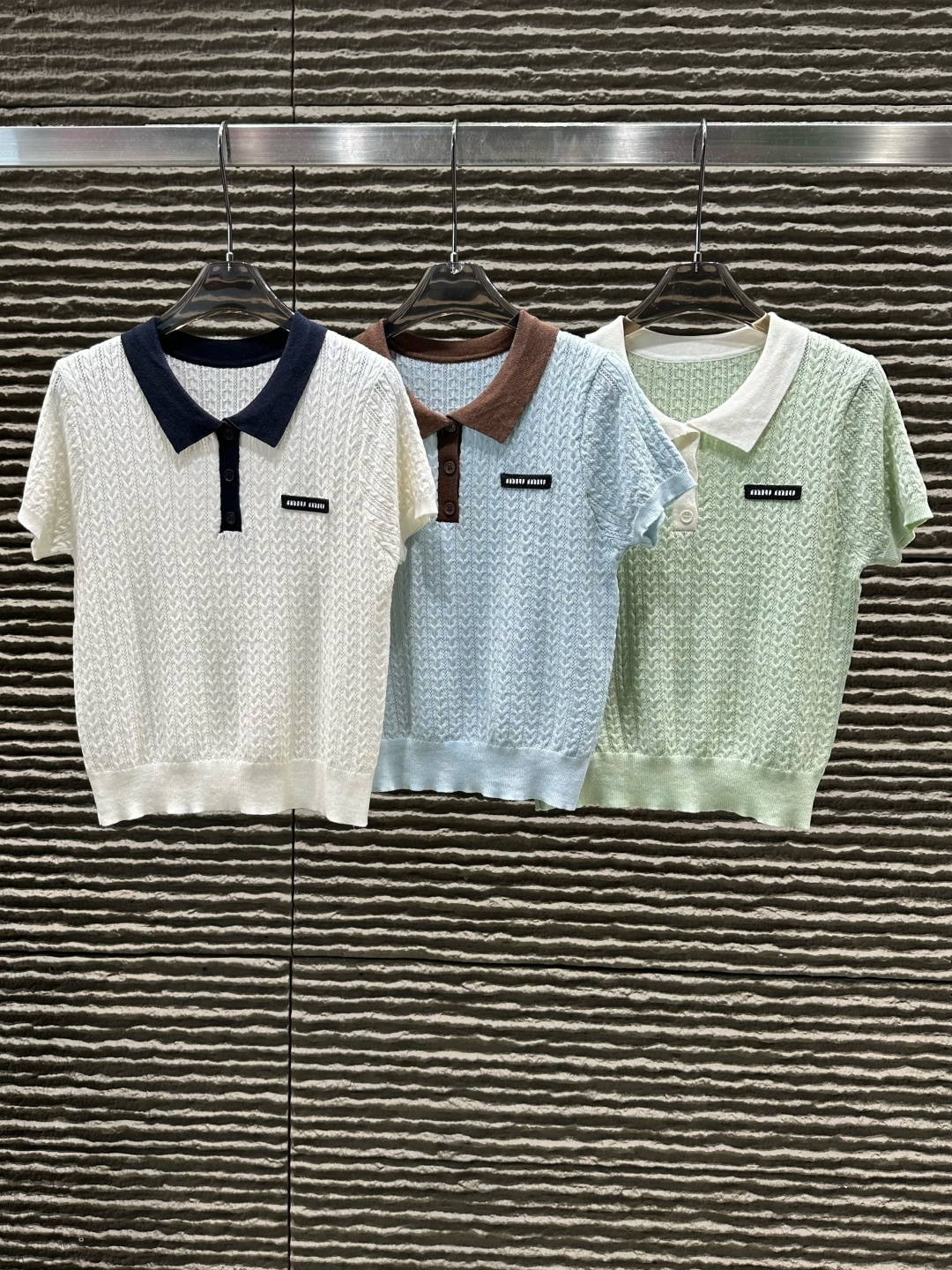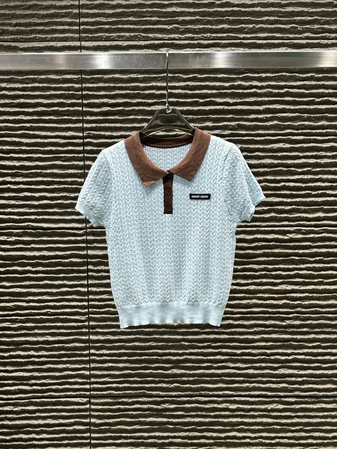 Details: Collared color-blocked knitted short-sleeved top. Customized for sophistication, featuring exquisite craftsmanship and original quality.