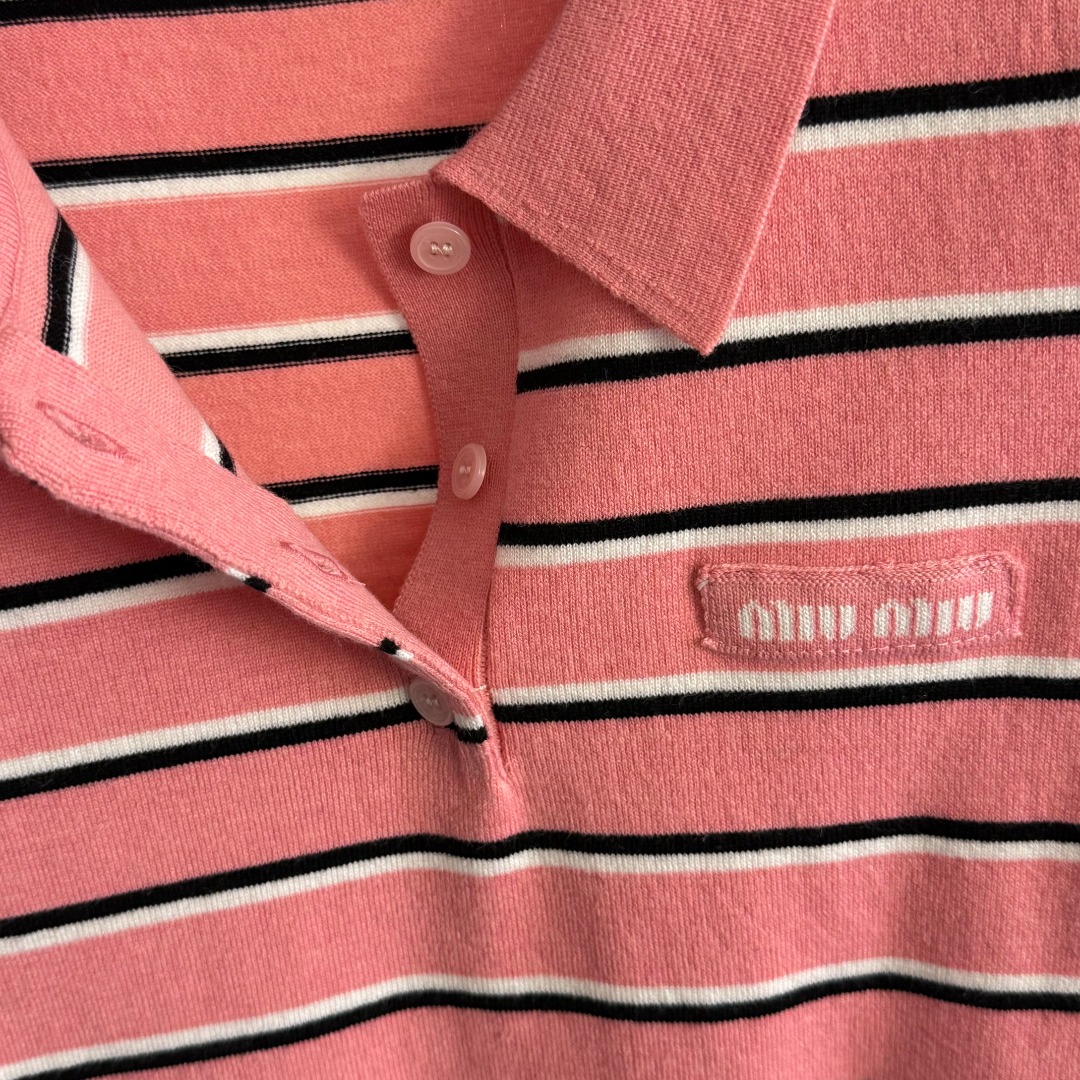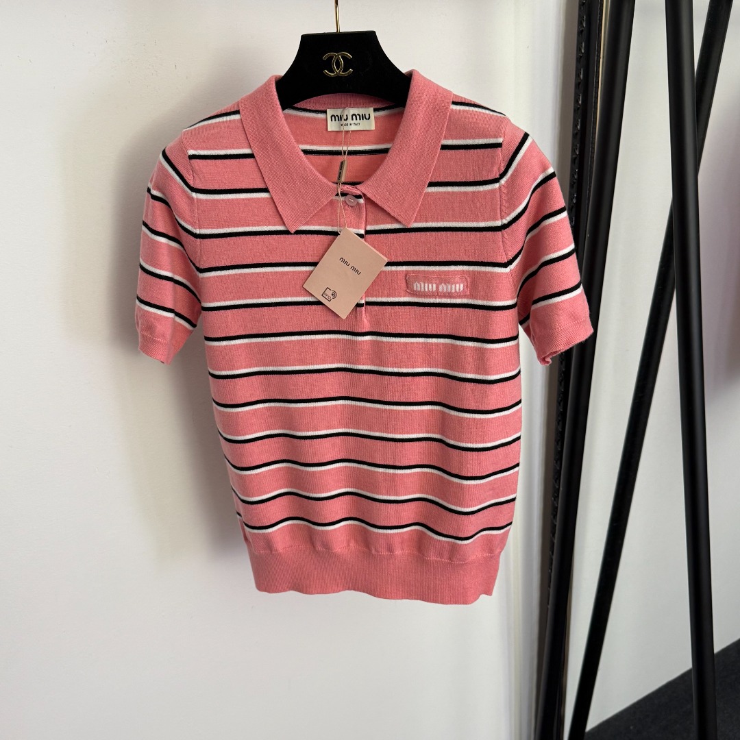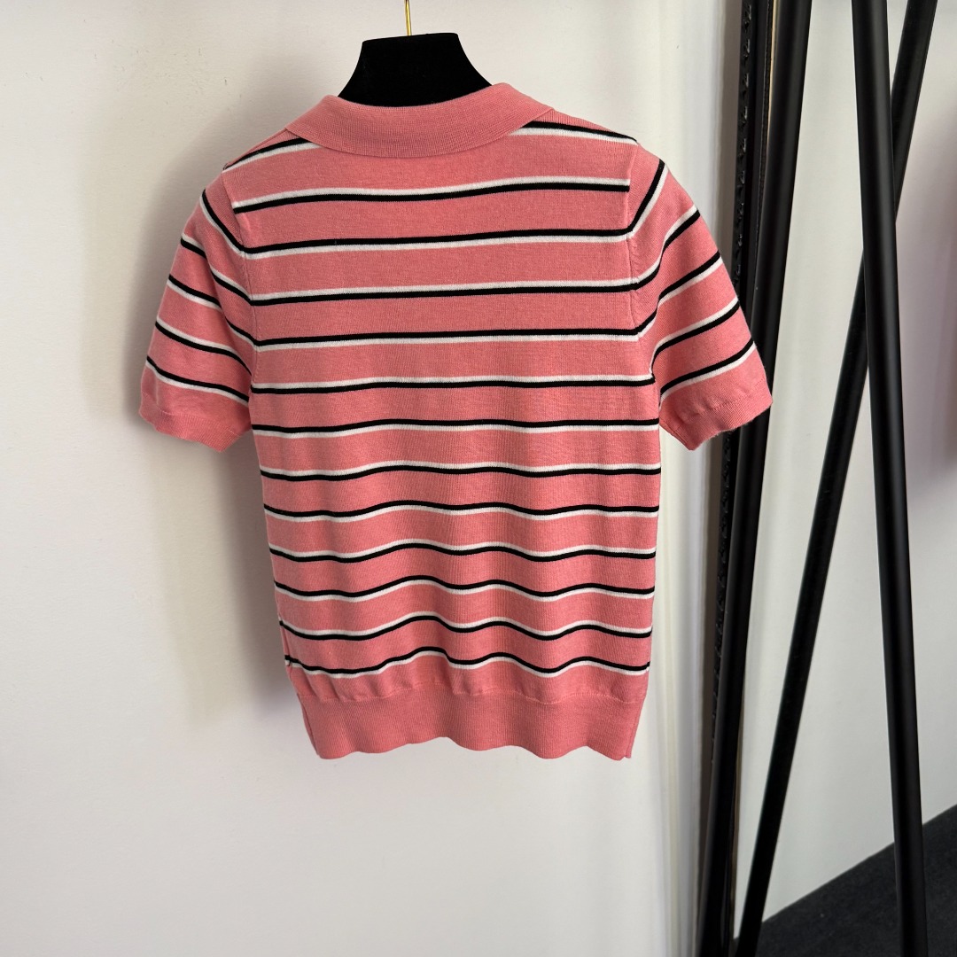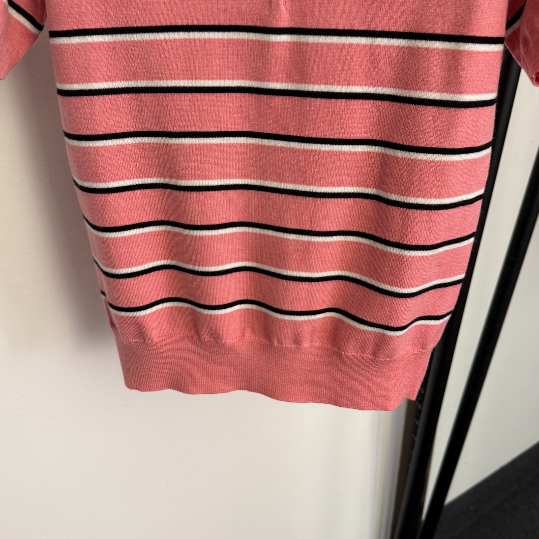 Details: New logo letter polo collar striped short-sleeved wool knitted top, pink, available in sizes 36/38/40.