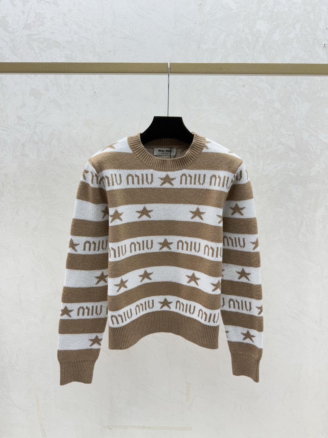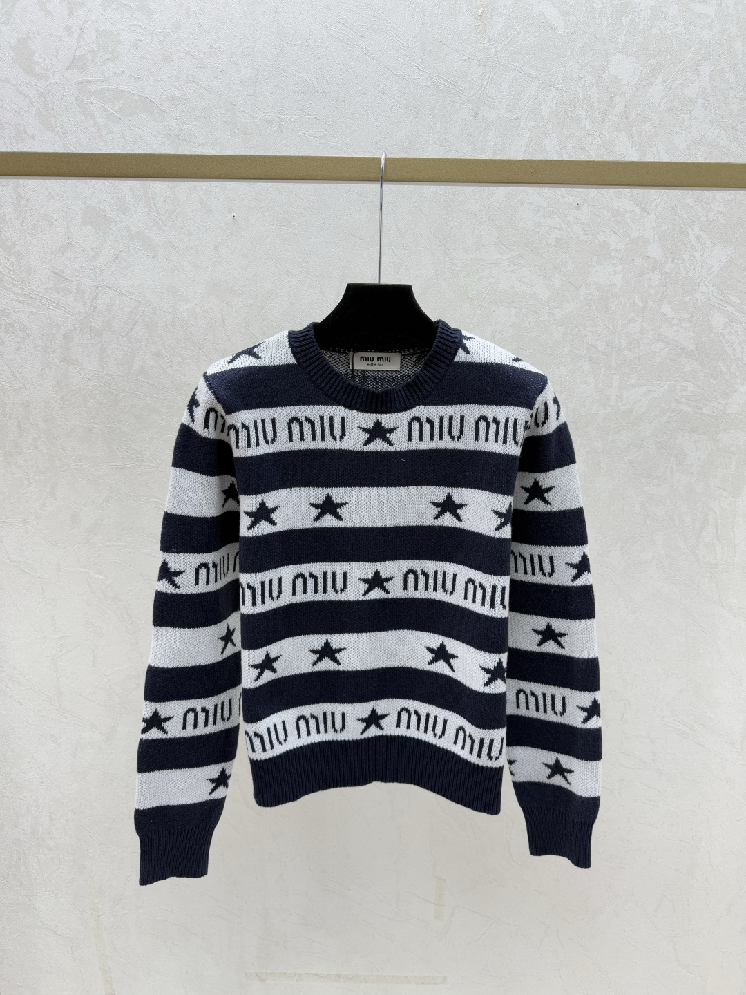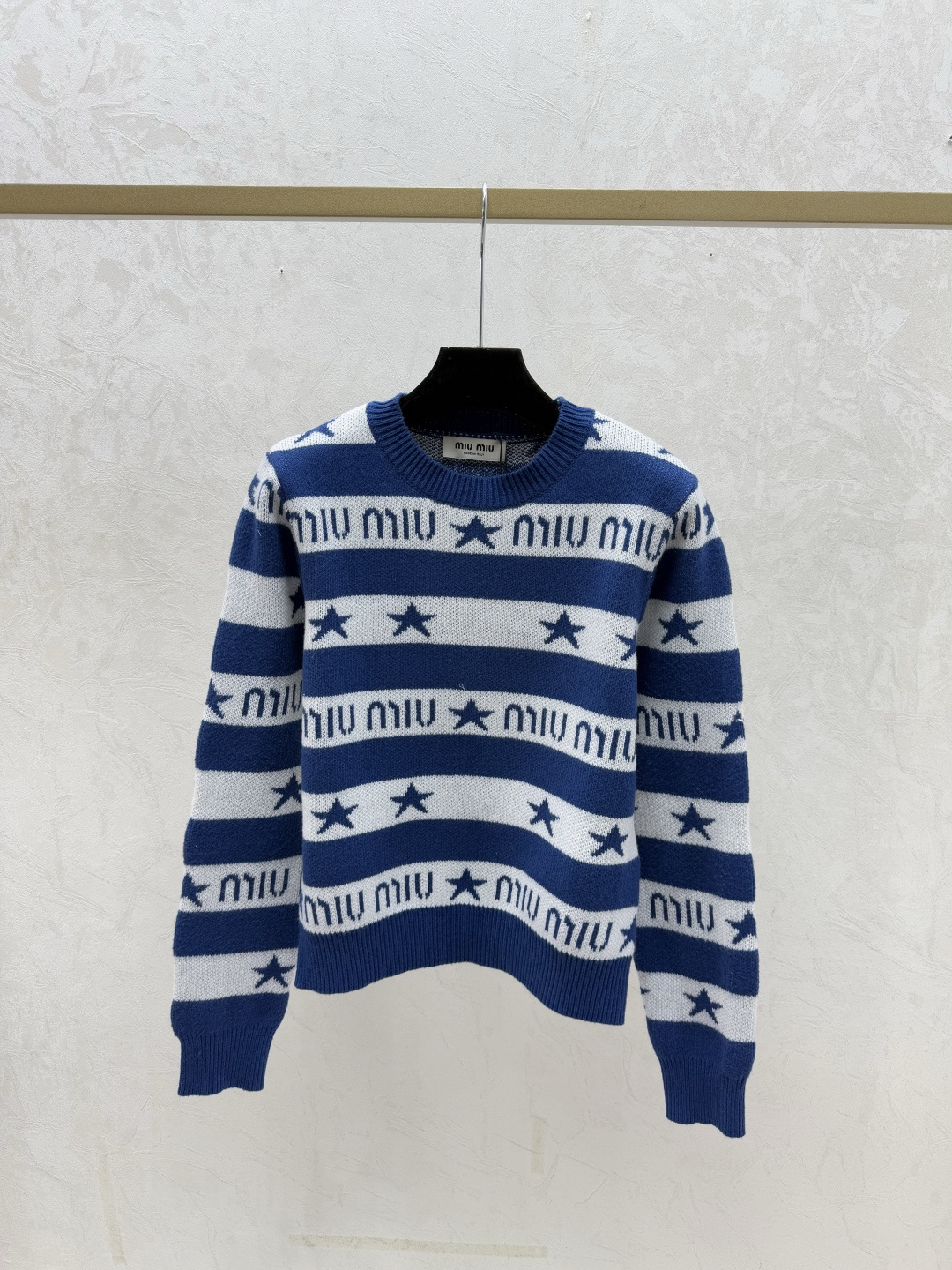 Details: Early autumn knitted long-sleeved top with distinctive color-blocked star letter stripes, colors include khaki, blue, and royal blue, sizes range from 36 to 40. Custom-made with high-end quality, mirroring the original workmanship.
