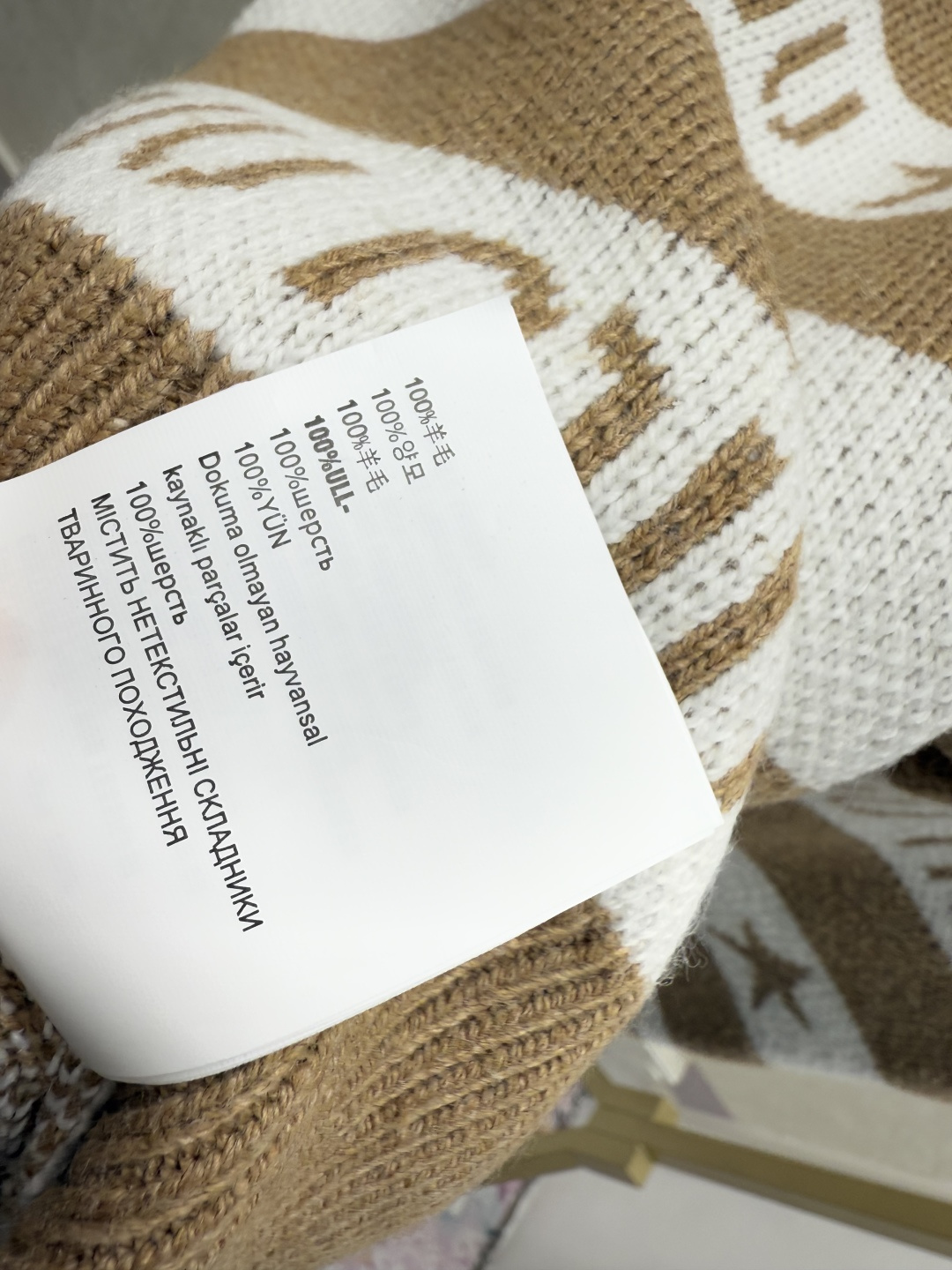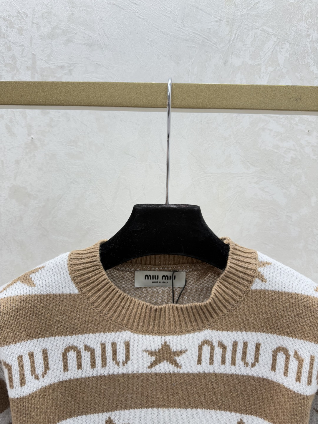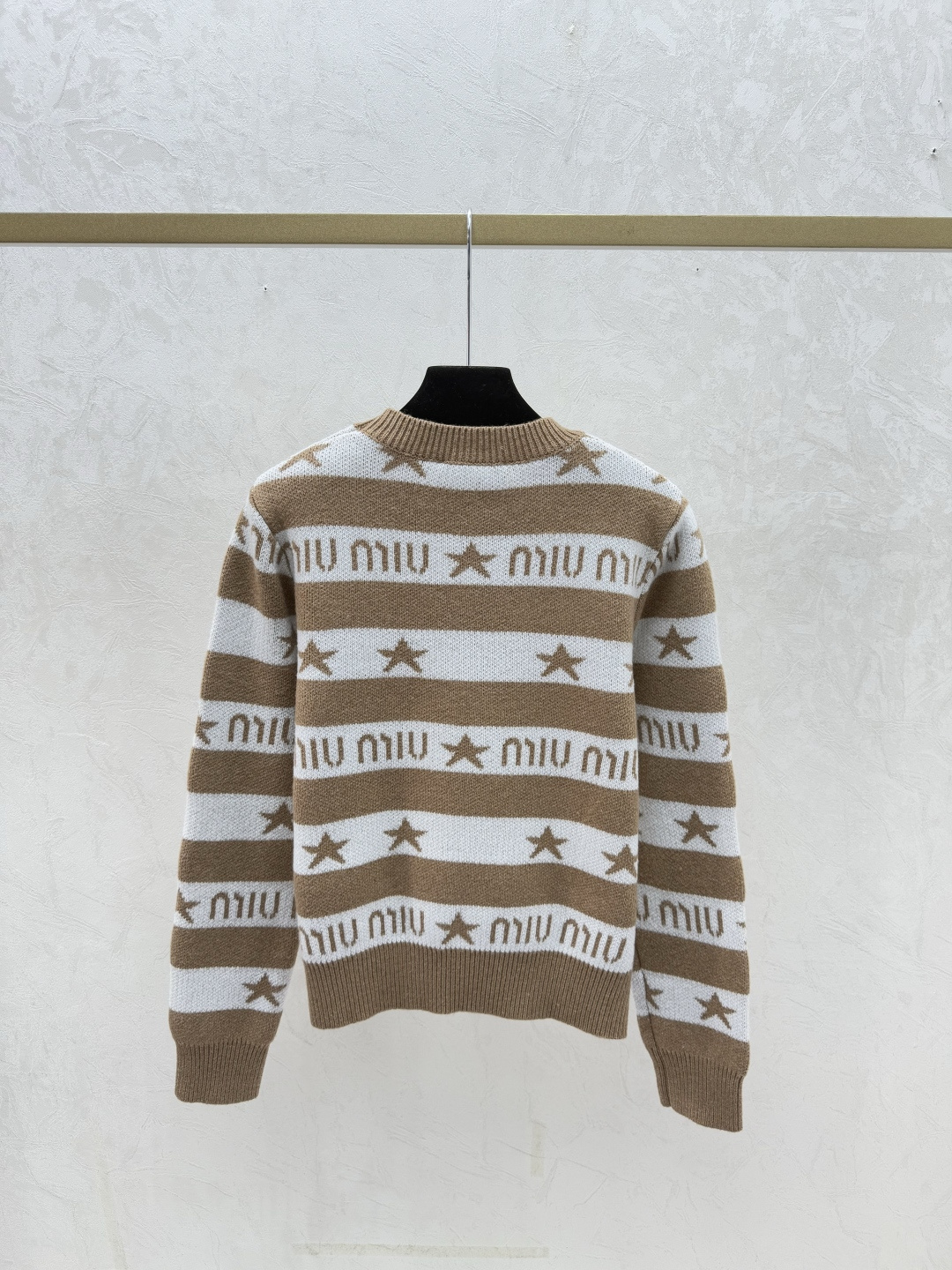 Details: Early autumn knitted long-sleeved top with distinctive color-blocked star letter stripes, colors include khaki, blue, and royal blue, sizes range from 36 to 40. Custom-made with high-end quality, mirroring the original workmanship.