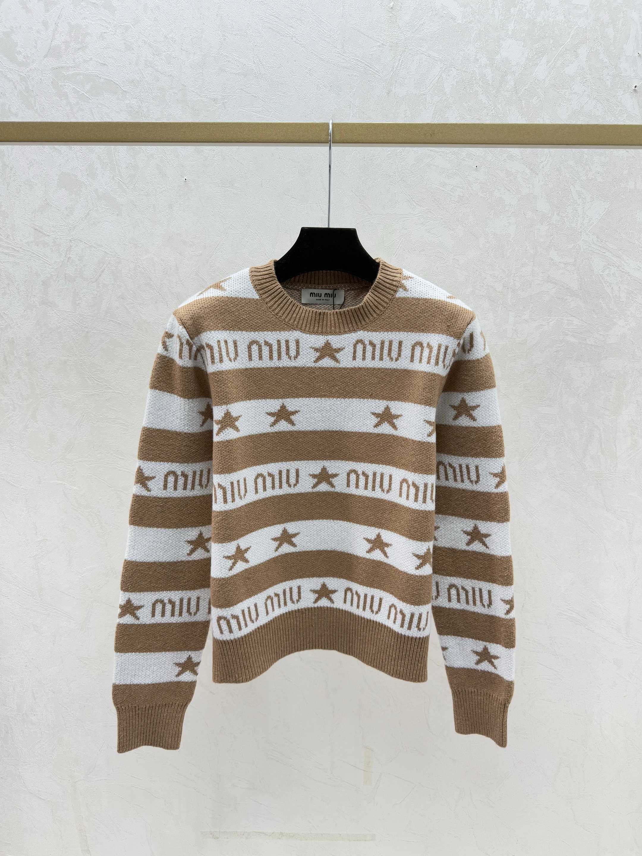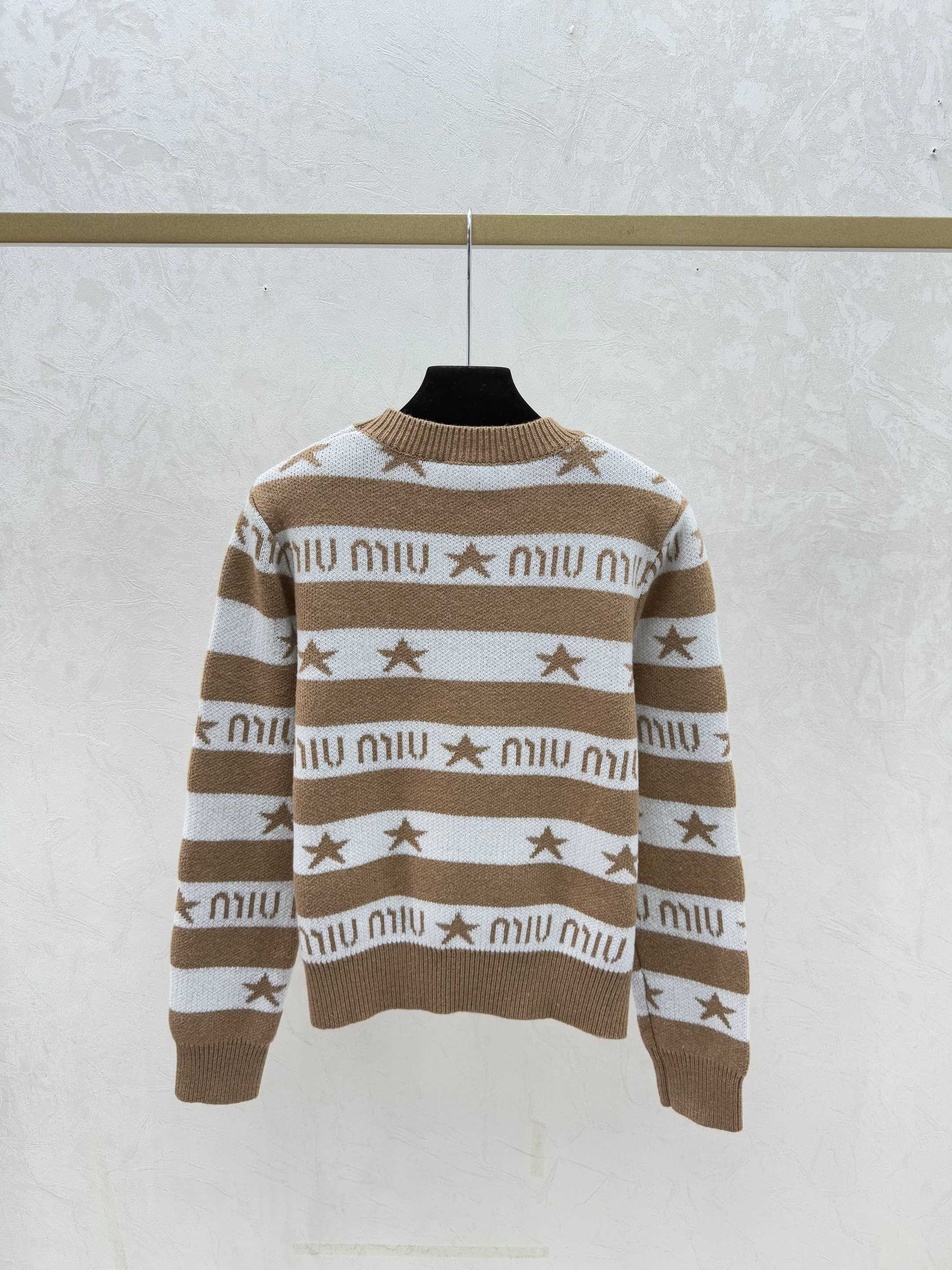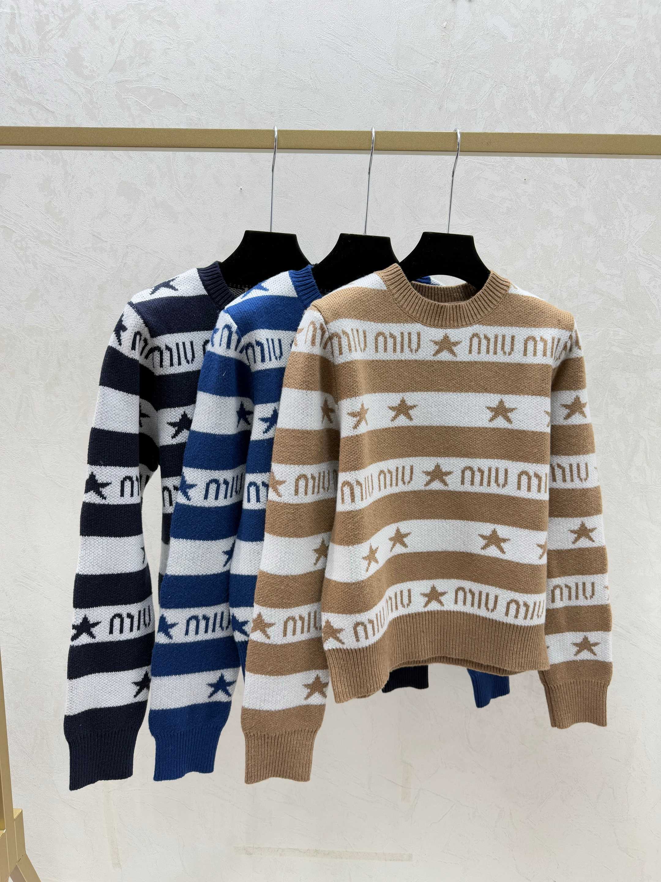 Details: Early autumn knitted long-sleeved top showcasing color-blocked star letter stripes, offered in khaki, blue, and royal blue, sizes 36 to 40. Premium customization, fine craftsmanship, identical to the original quality.