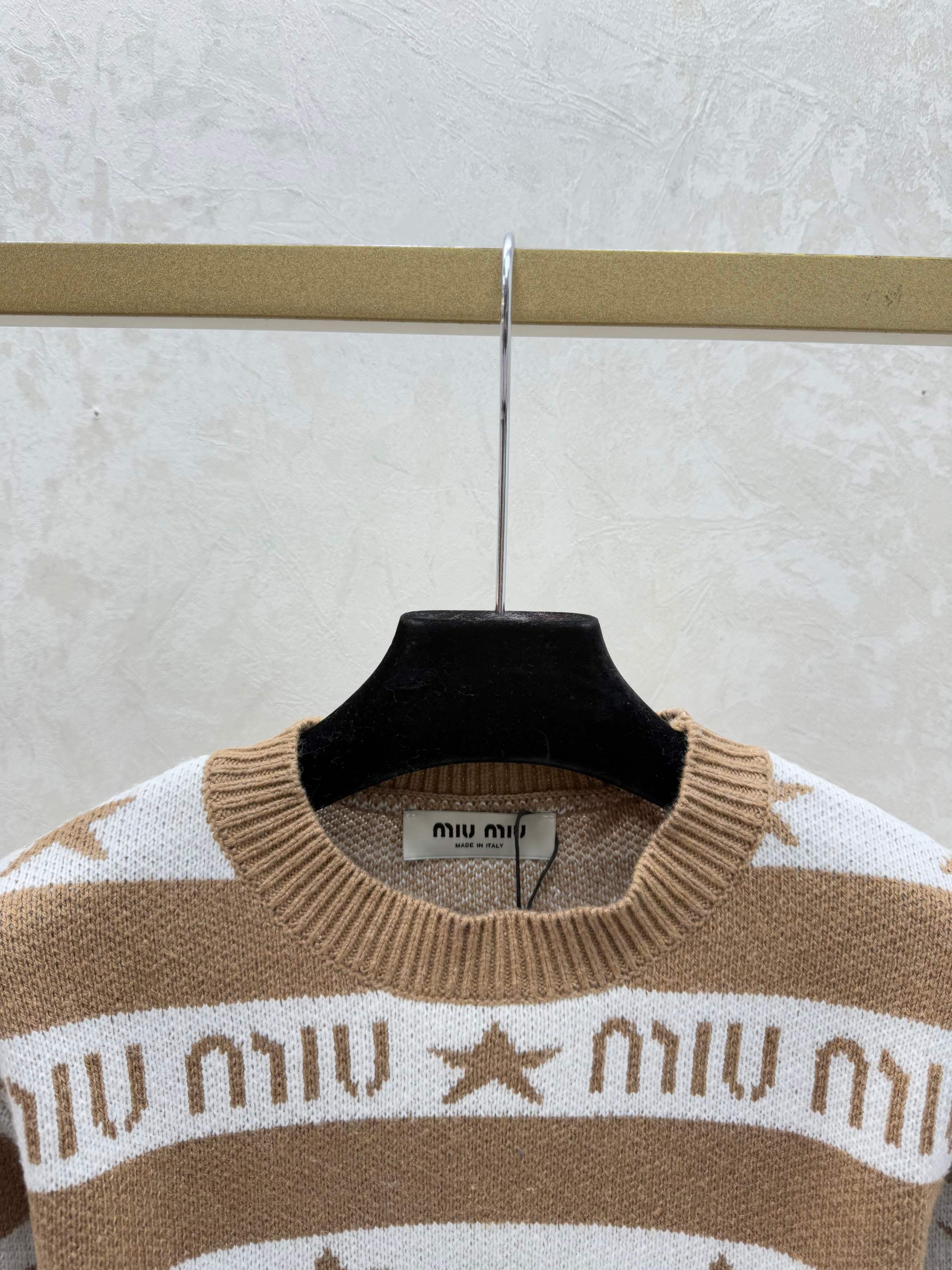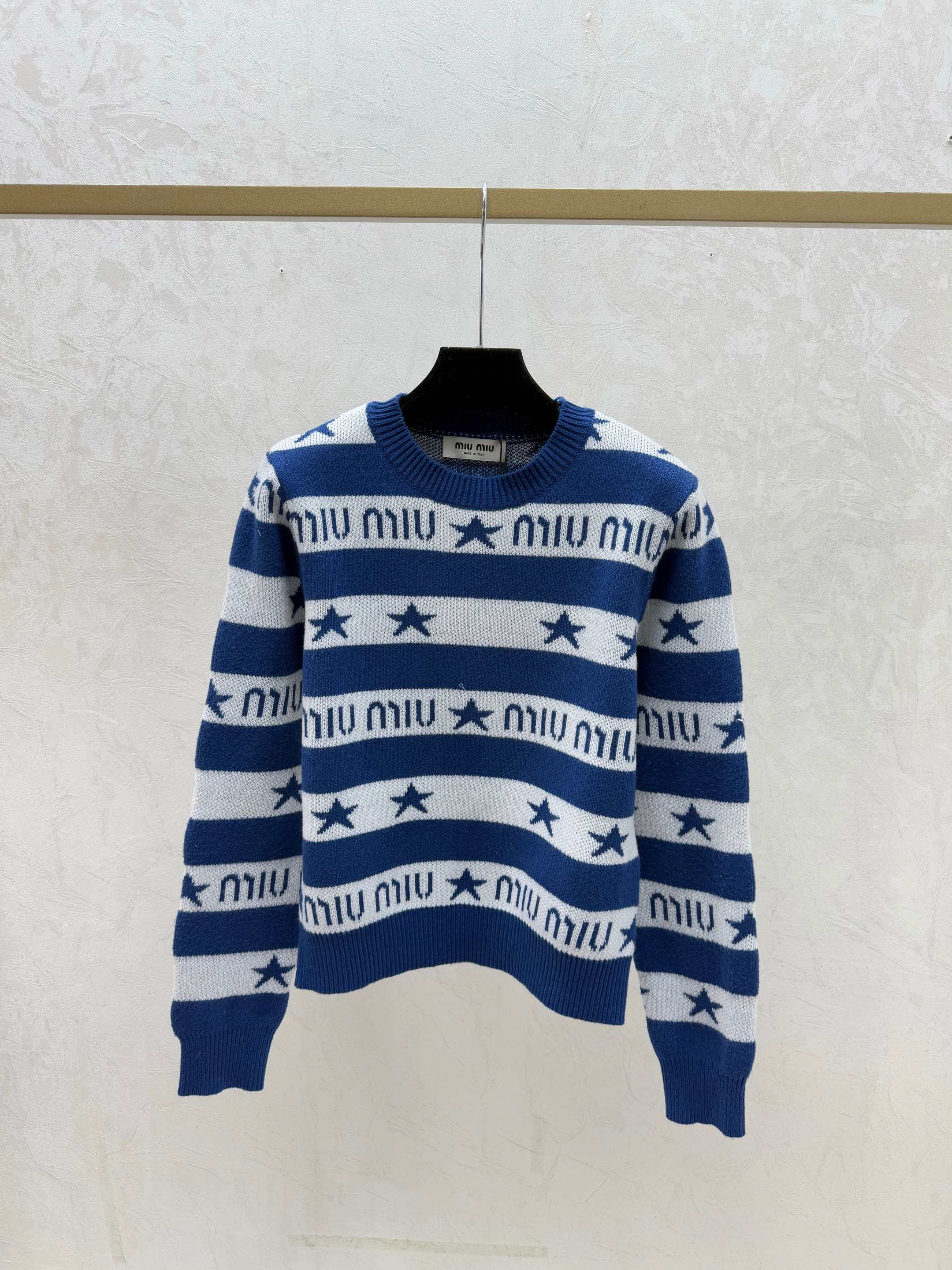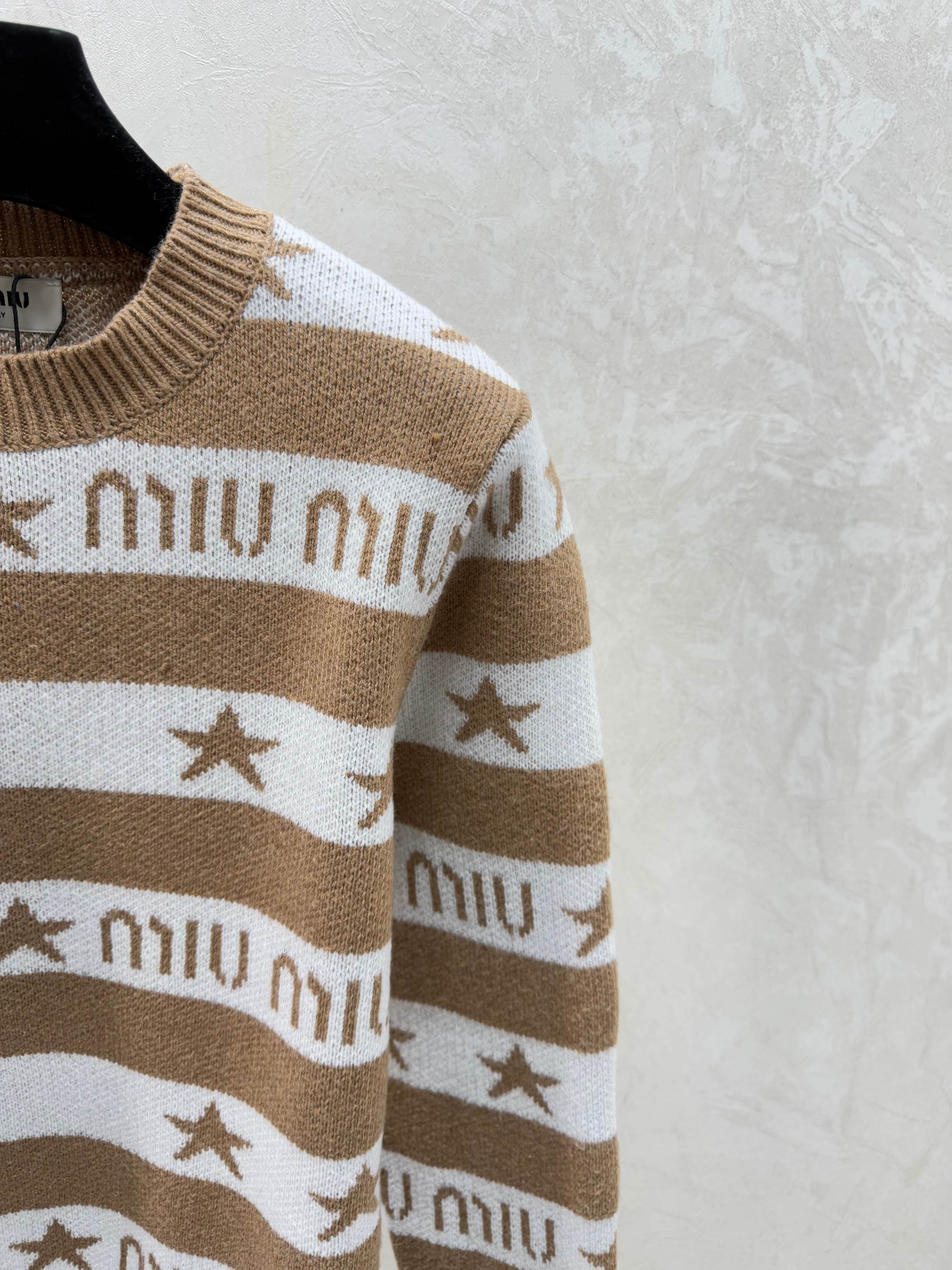 Details: Early autumn knitted long-sleeved top showcasing color-blocked star letter stripes, offered in khaki, blue, and royal blue, sizes 36 to 40. Premium customization, fine craftsmanship, identical to the original quality.