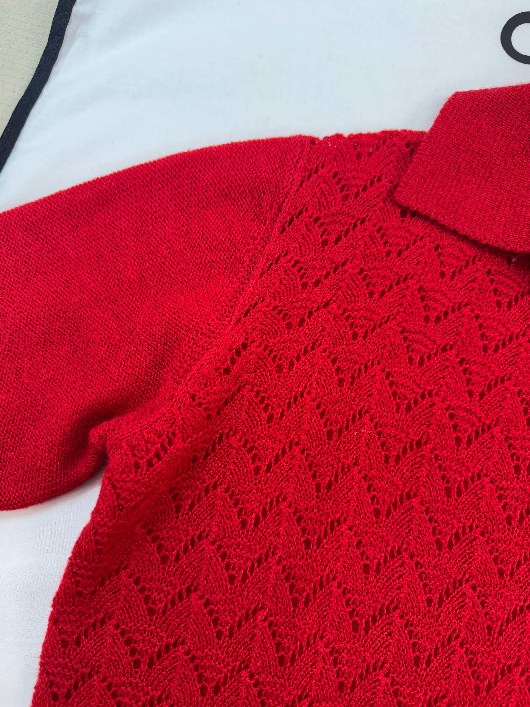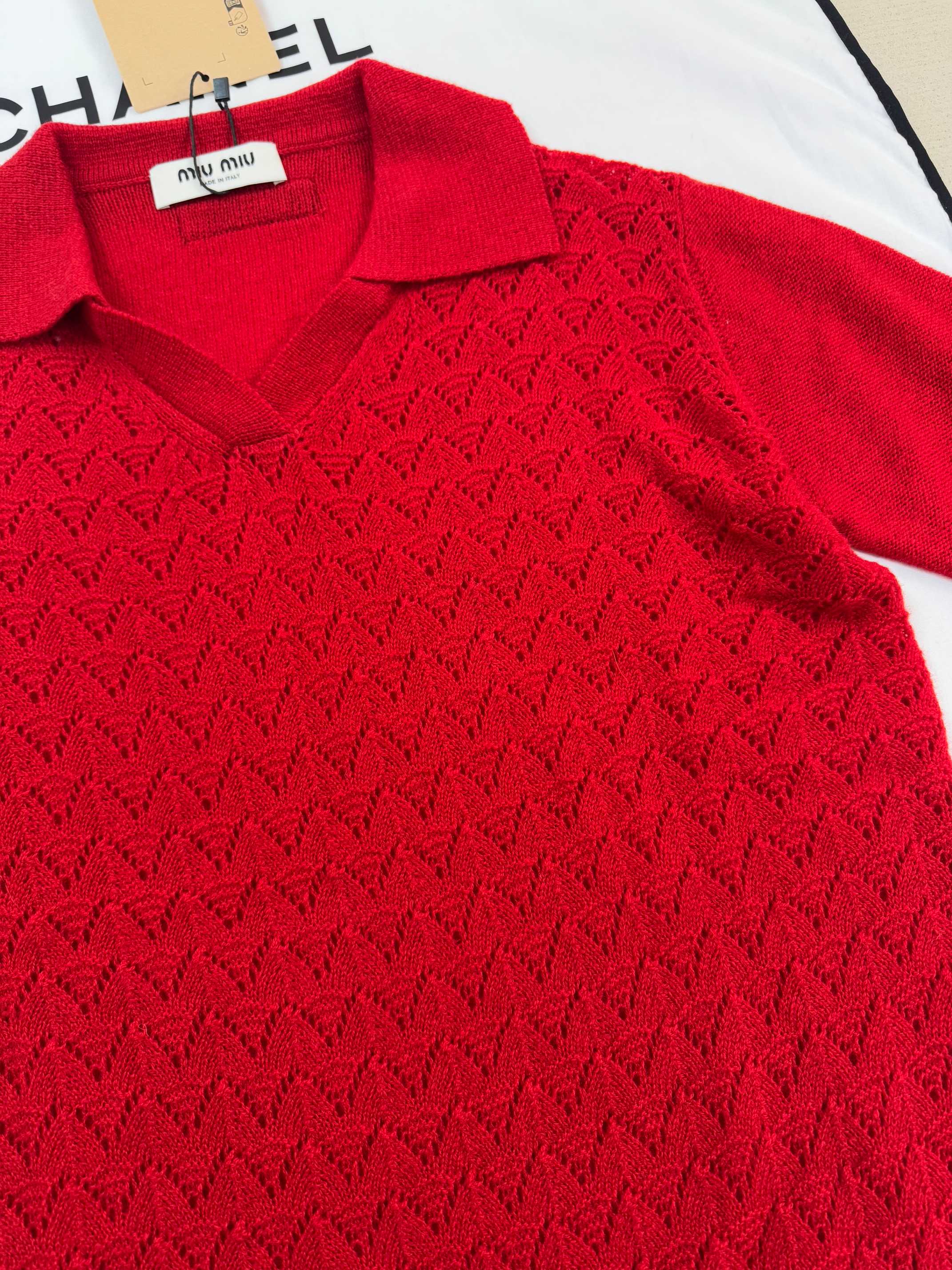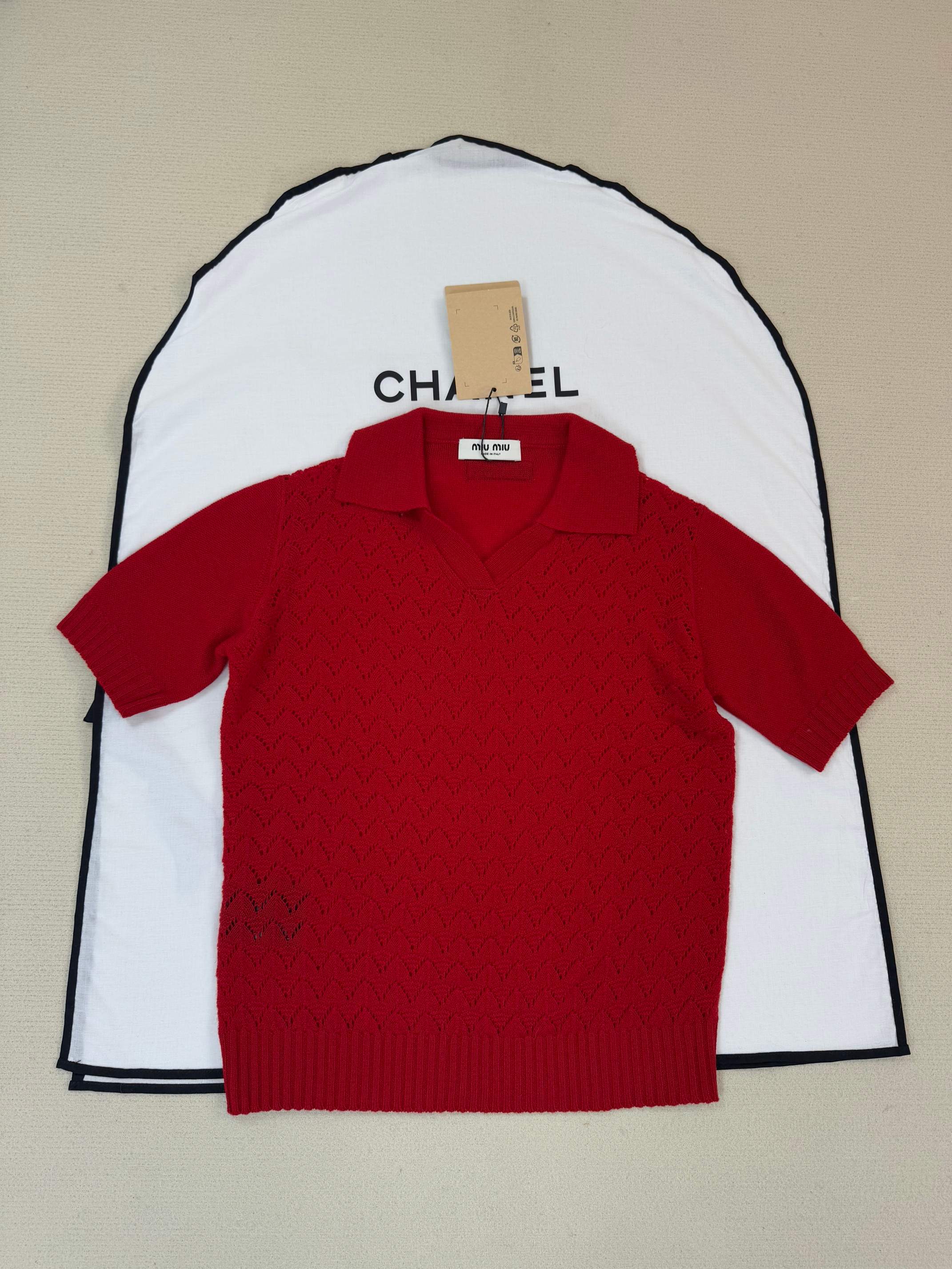 Details: Knit short-sleeved top available in S, M, L sizes.