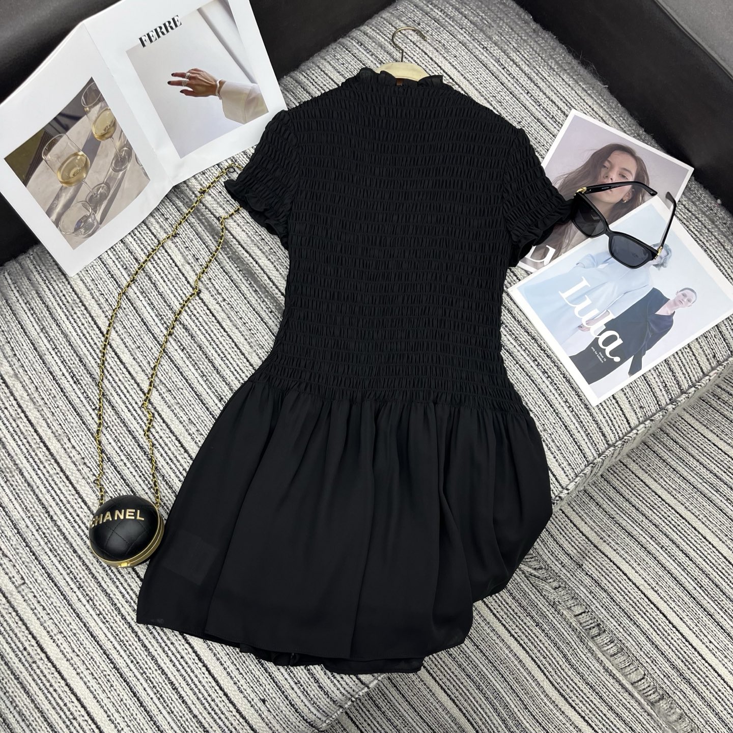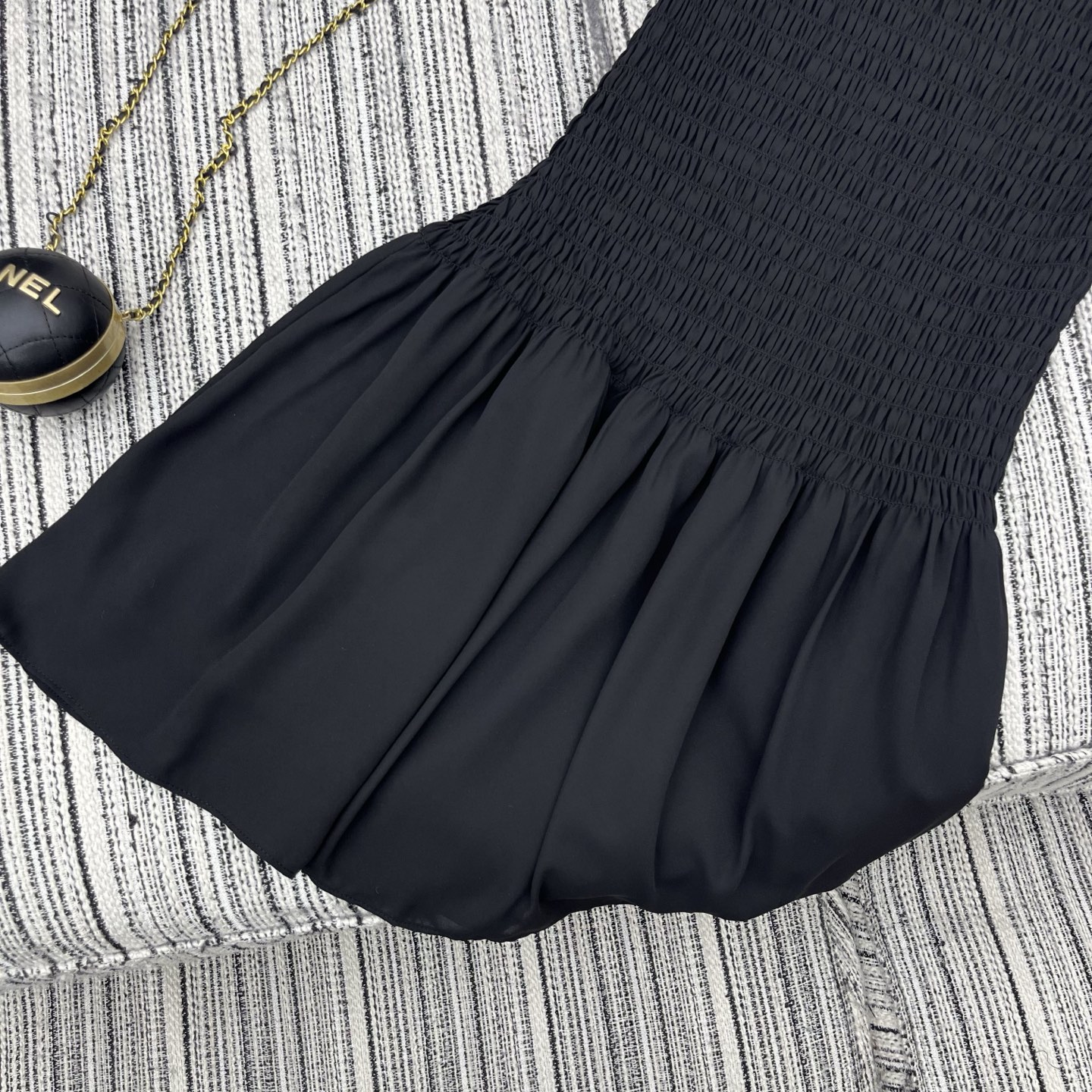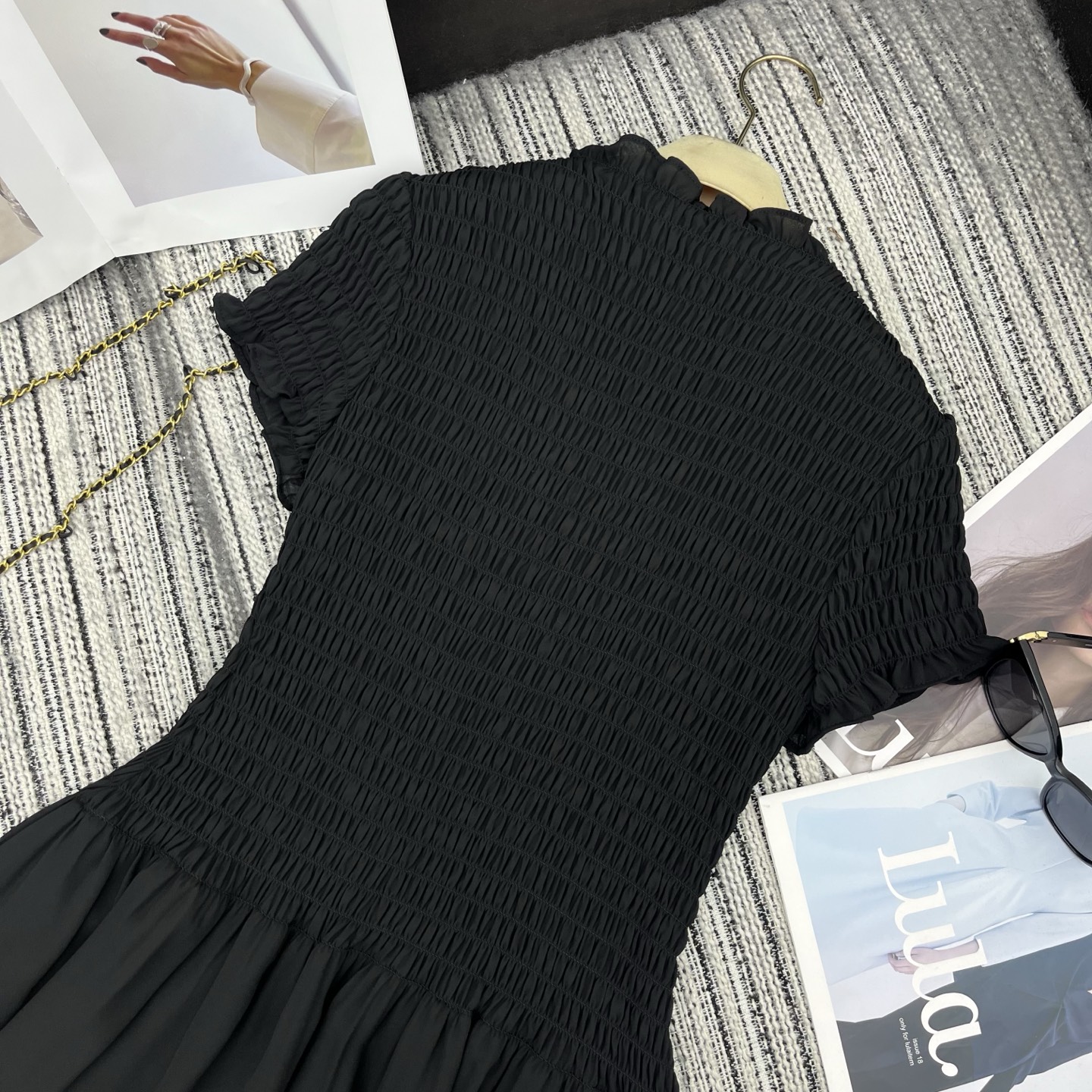 Details: Sweet and cool georgette mini dress, made of pleated fabric, waist-cinched, short silhouette. High-end customization, fine workmanship