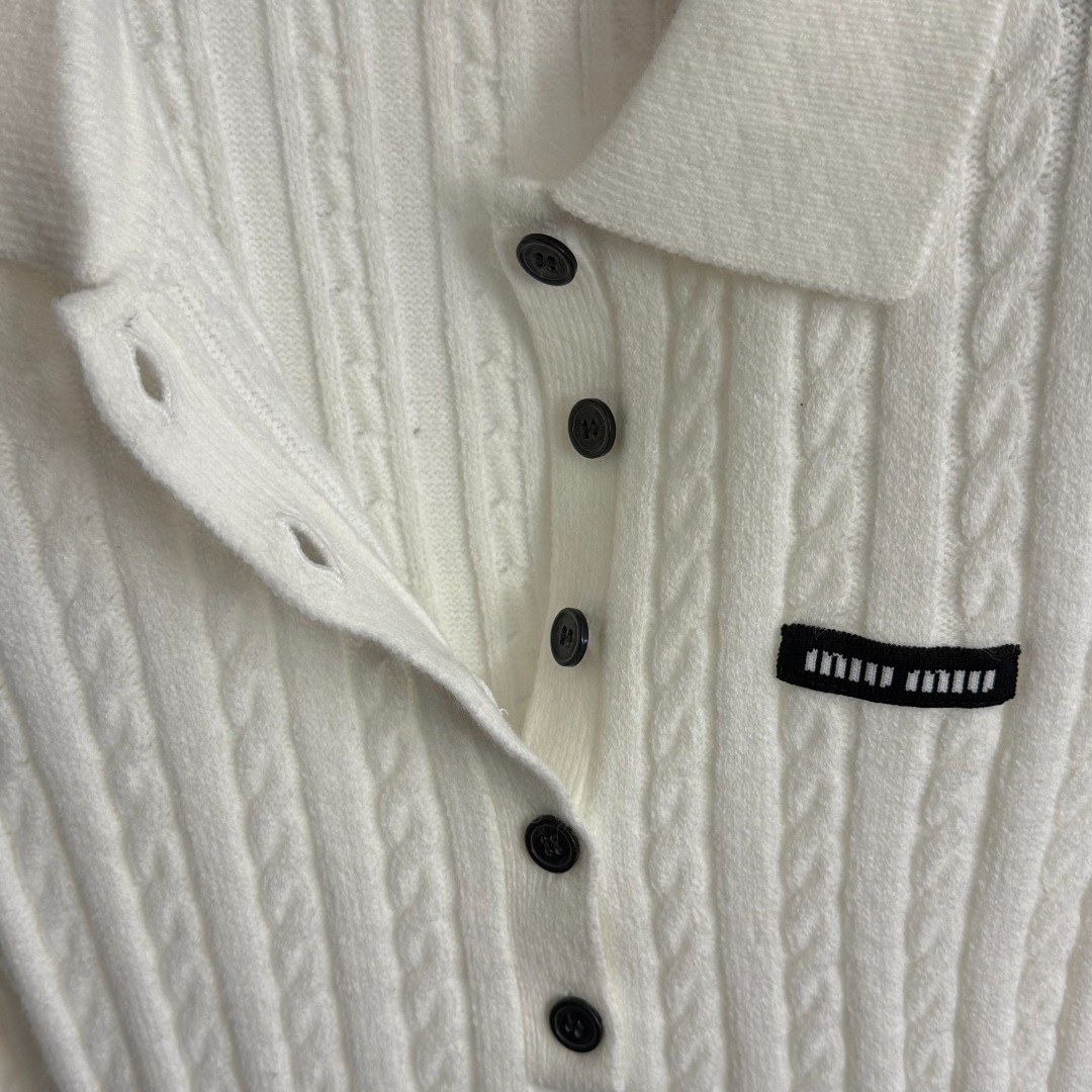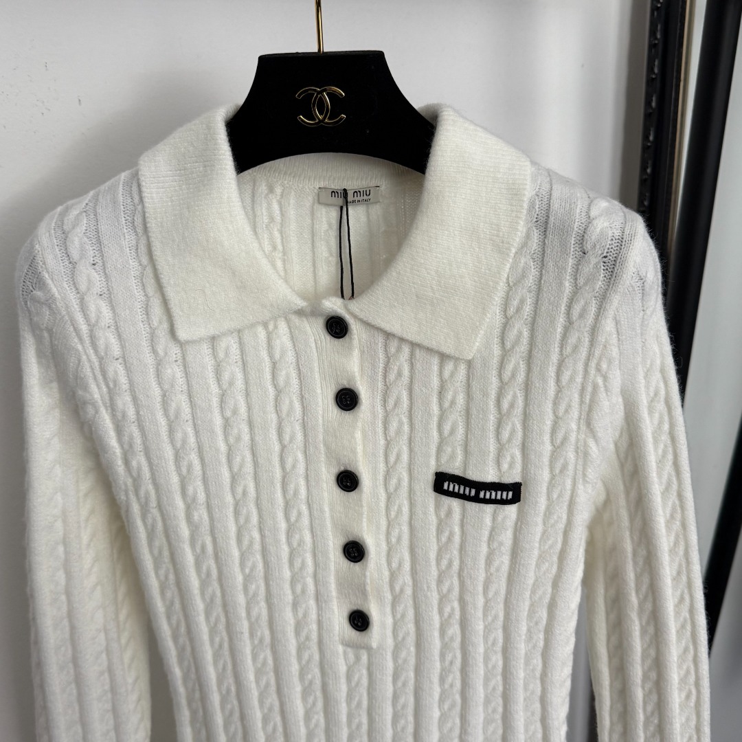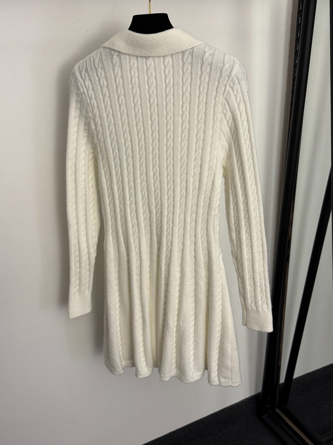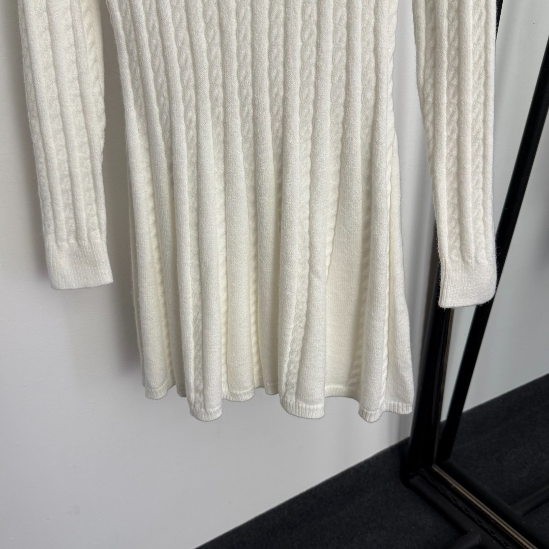 Details: New Collar Logo Long-Sleeve Knit Dress, White & Gray, Sizes 36-40. High-end Custom, Fine Workmanship