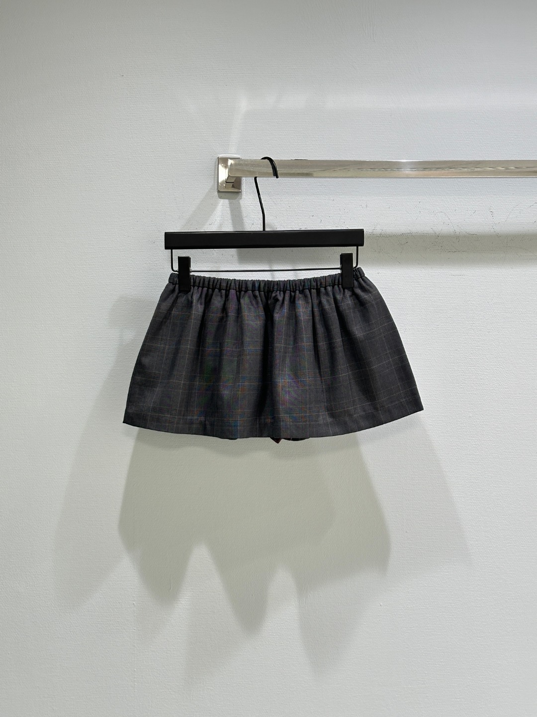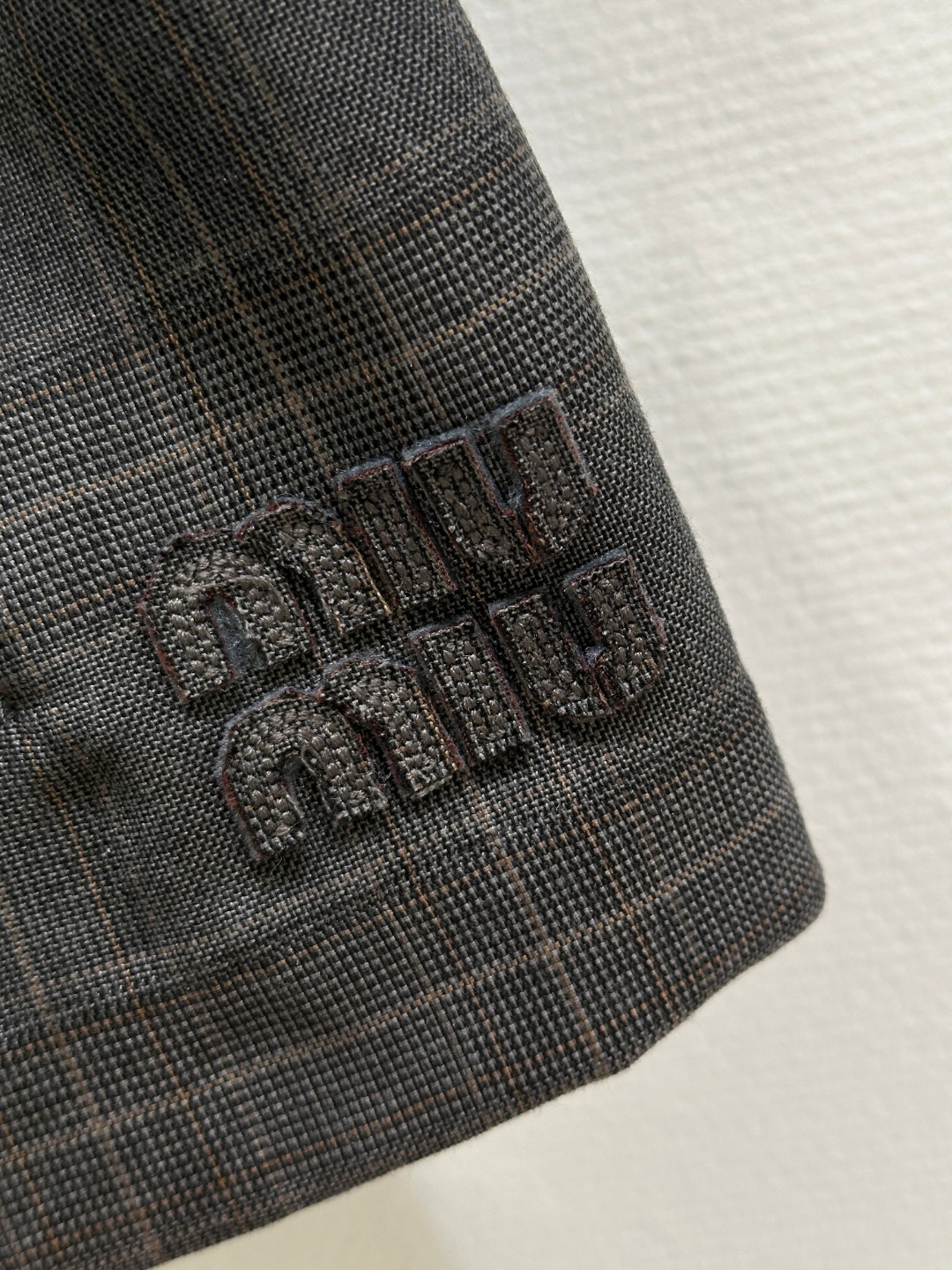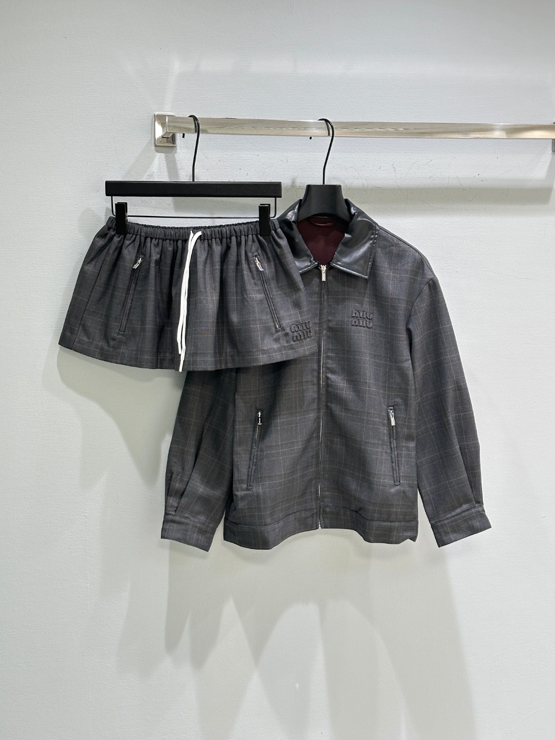 Details: Early autumn Jacket combining mohair, Prince of Wales check, leather collar with a sporty half skirt.