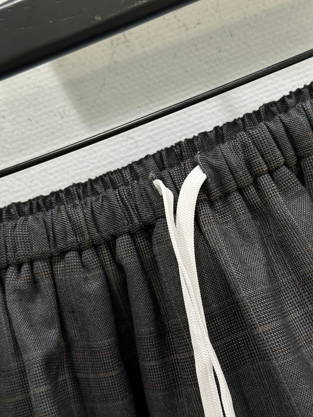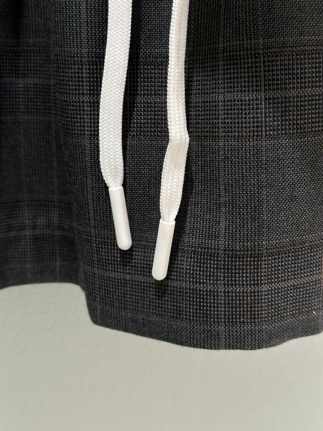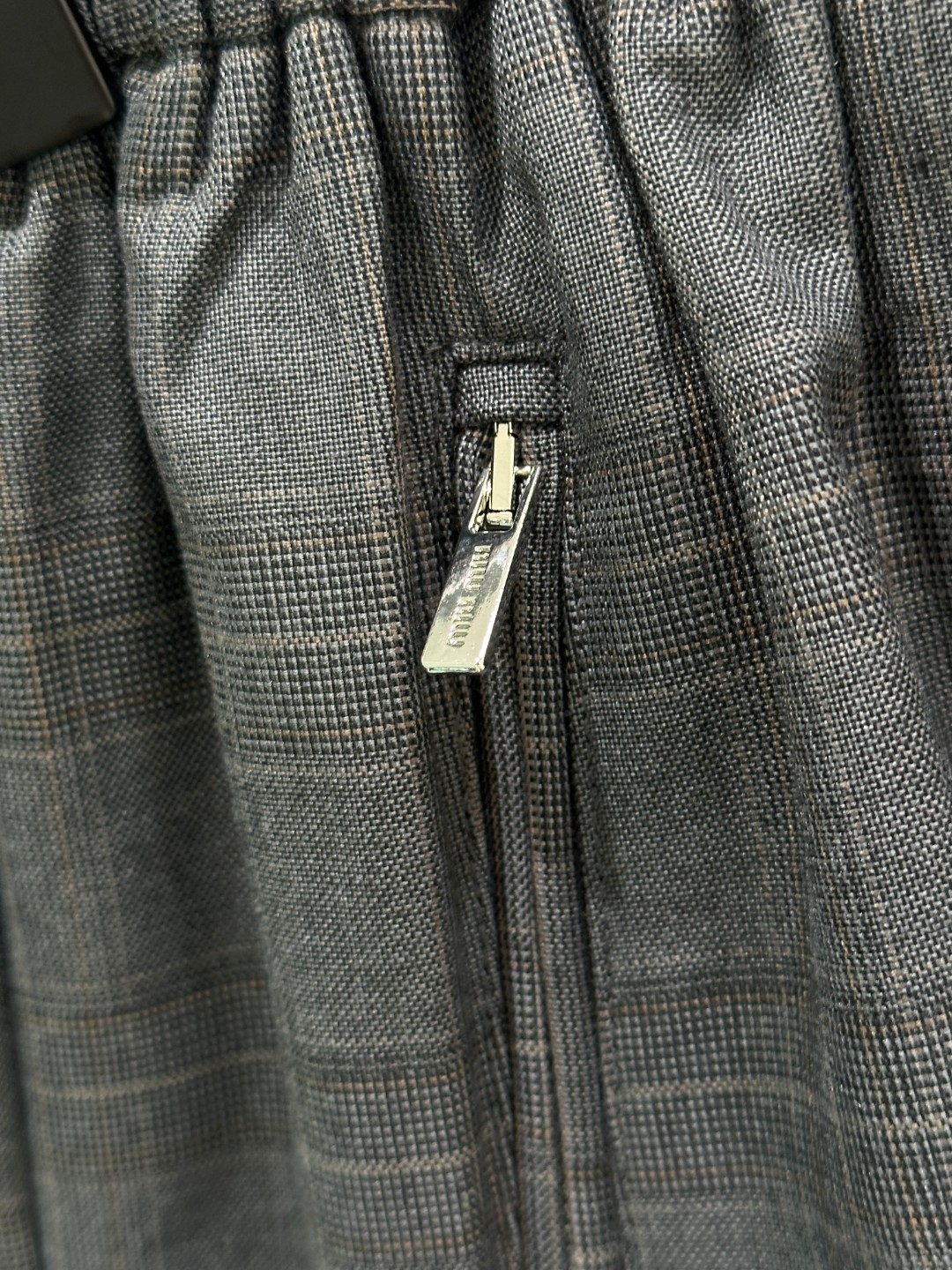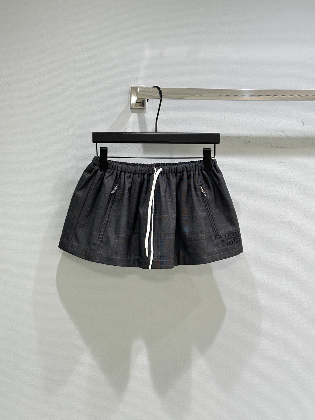 Details: Early autumn Jacket combining mohair, Prince of Wales check, leather collar with a sporty half skirt.