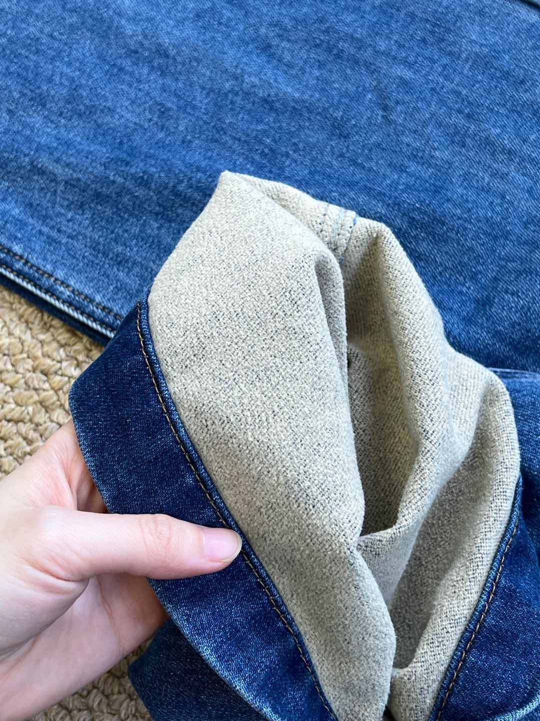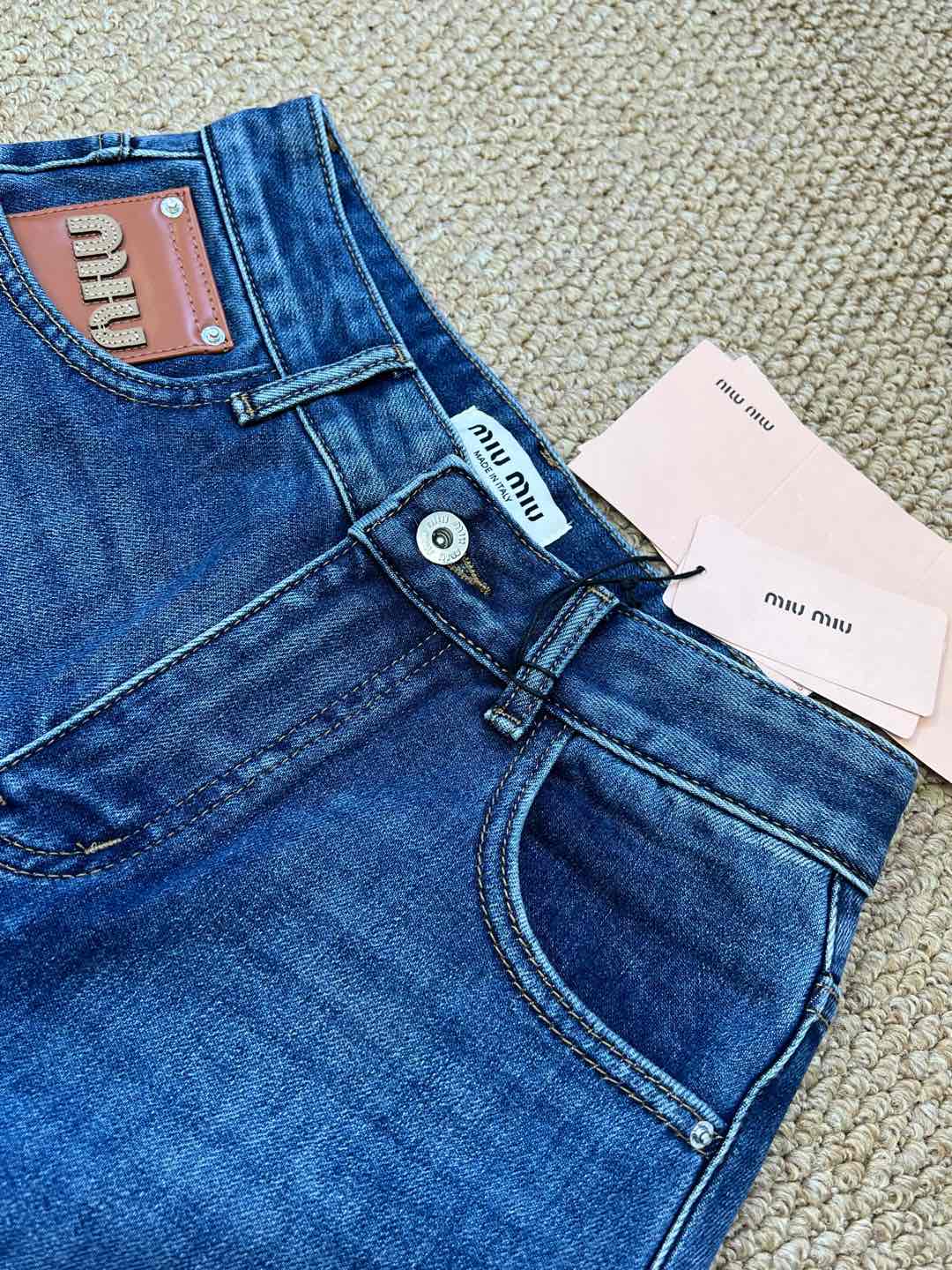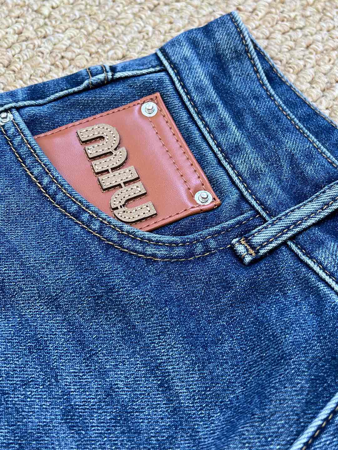 Details: High-waisted straight-leg jeans with leather logo patches, soft, comfortable, high-quality, bespoke tailoring, exquisite craftsmanship