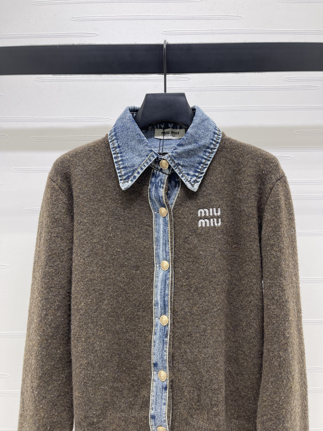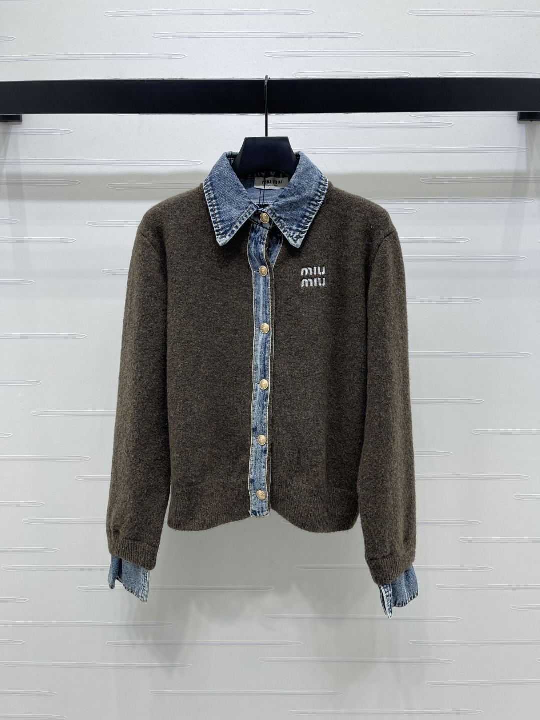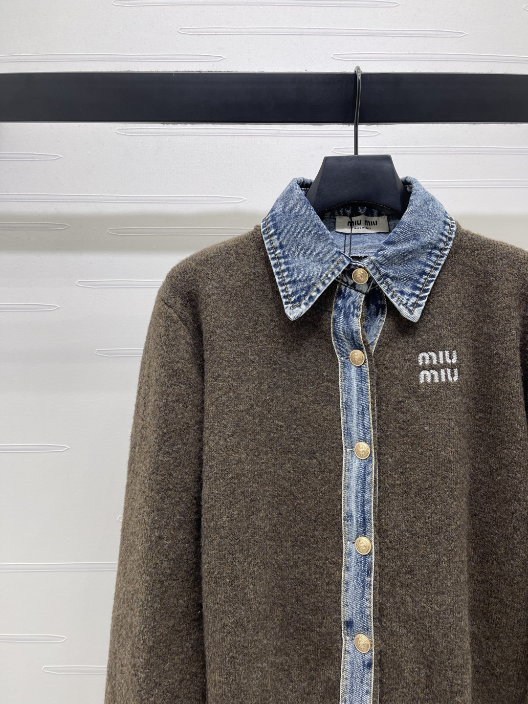 Details: Fake two-piece denim polo-neck cardigan knitted from fine wool, providing a soft and comfortable feel. It features brand lettering on the chest and custom metal buttons. Has a classic fit suitable for all. Comes in three colors, available in sizes S to L. High-end customization with meticulous craftsmanship, showing 1:1 original quality.