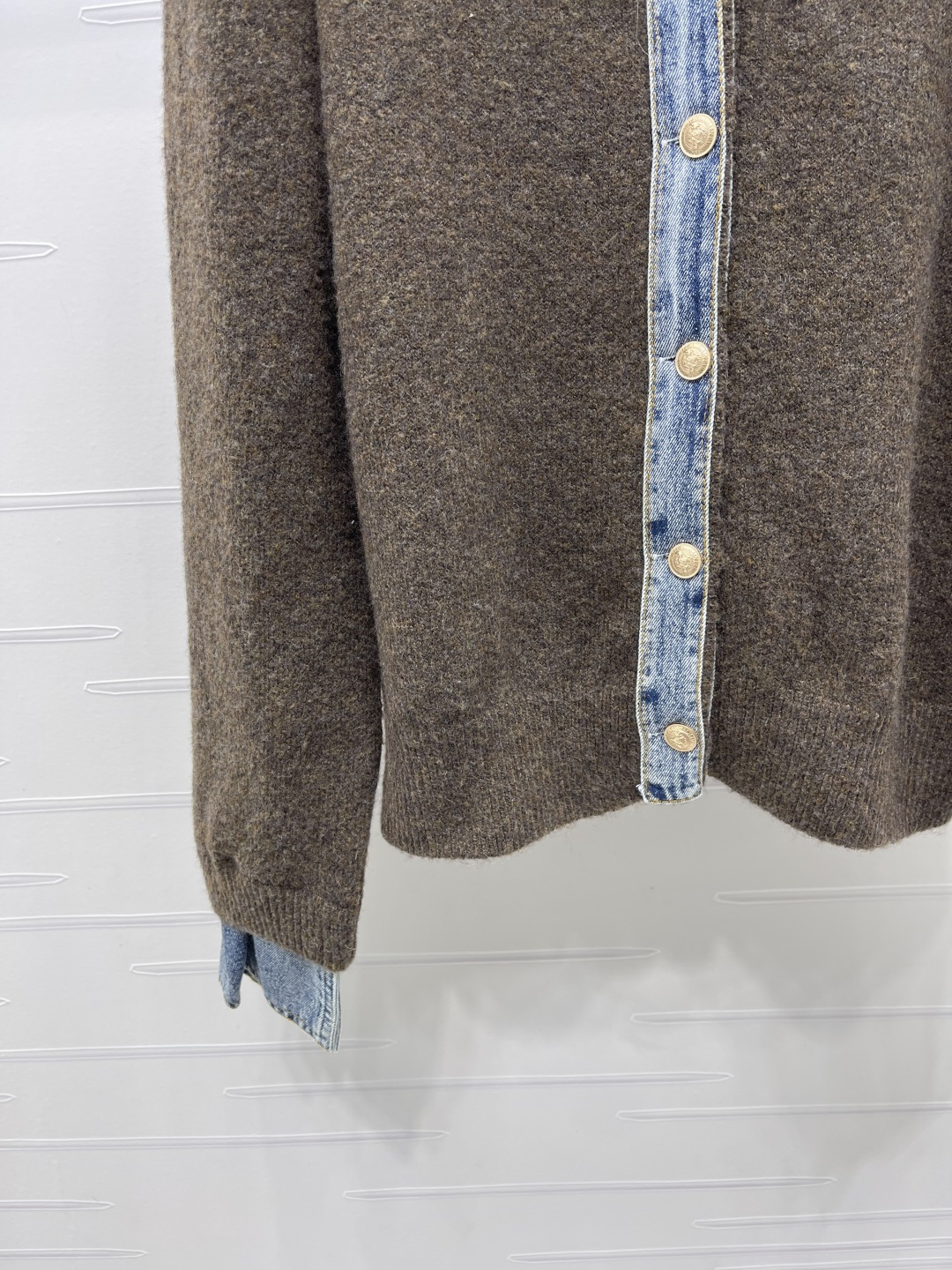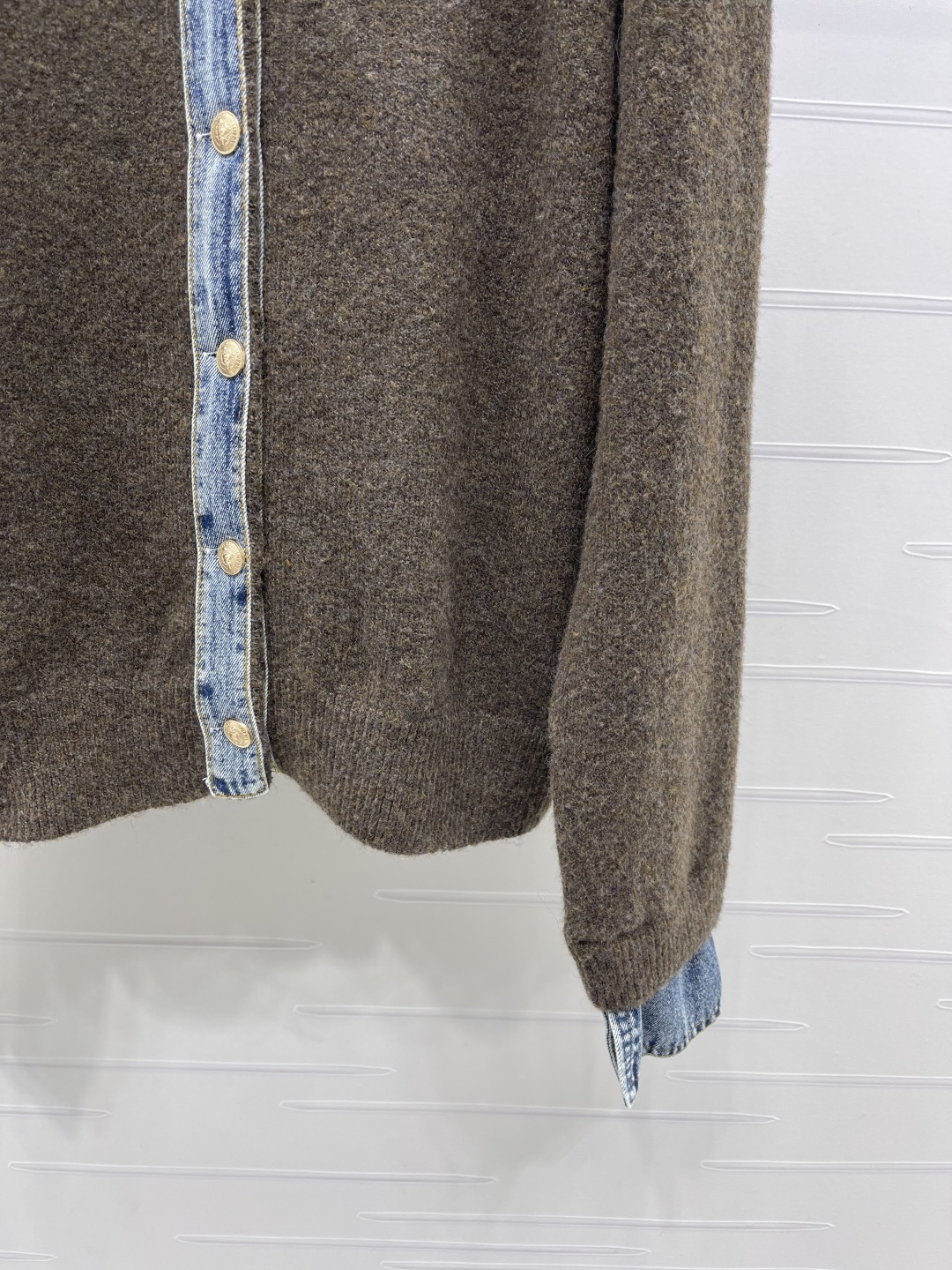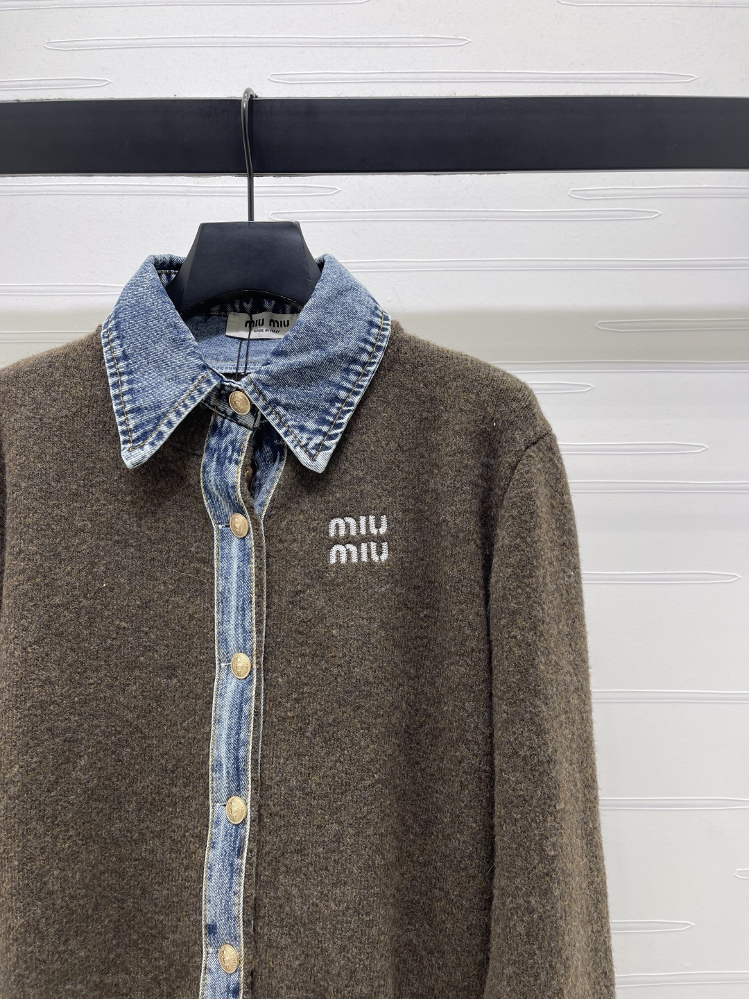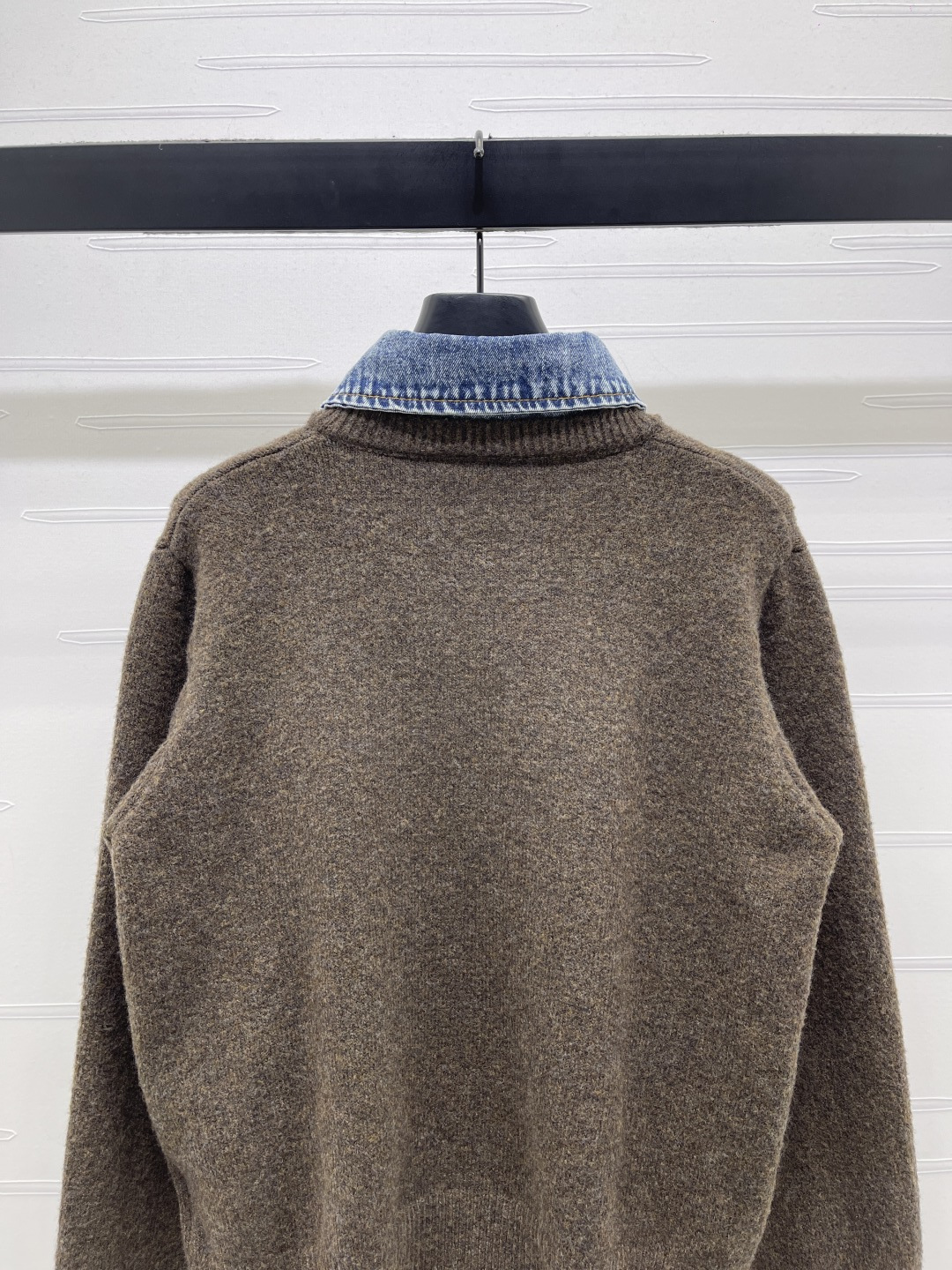 Details: Fake two-piece denim polo-neck cardigan knitted from fine wool, providing a soft and comfortable feel. It features brand lettering on the chest and custom metal buttons. Has a classic fit suitable for all. Comes in three colors, available in sizes S to L. High-end customization with meticulous craftsmanship, showing 1:1 original quality.