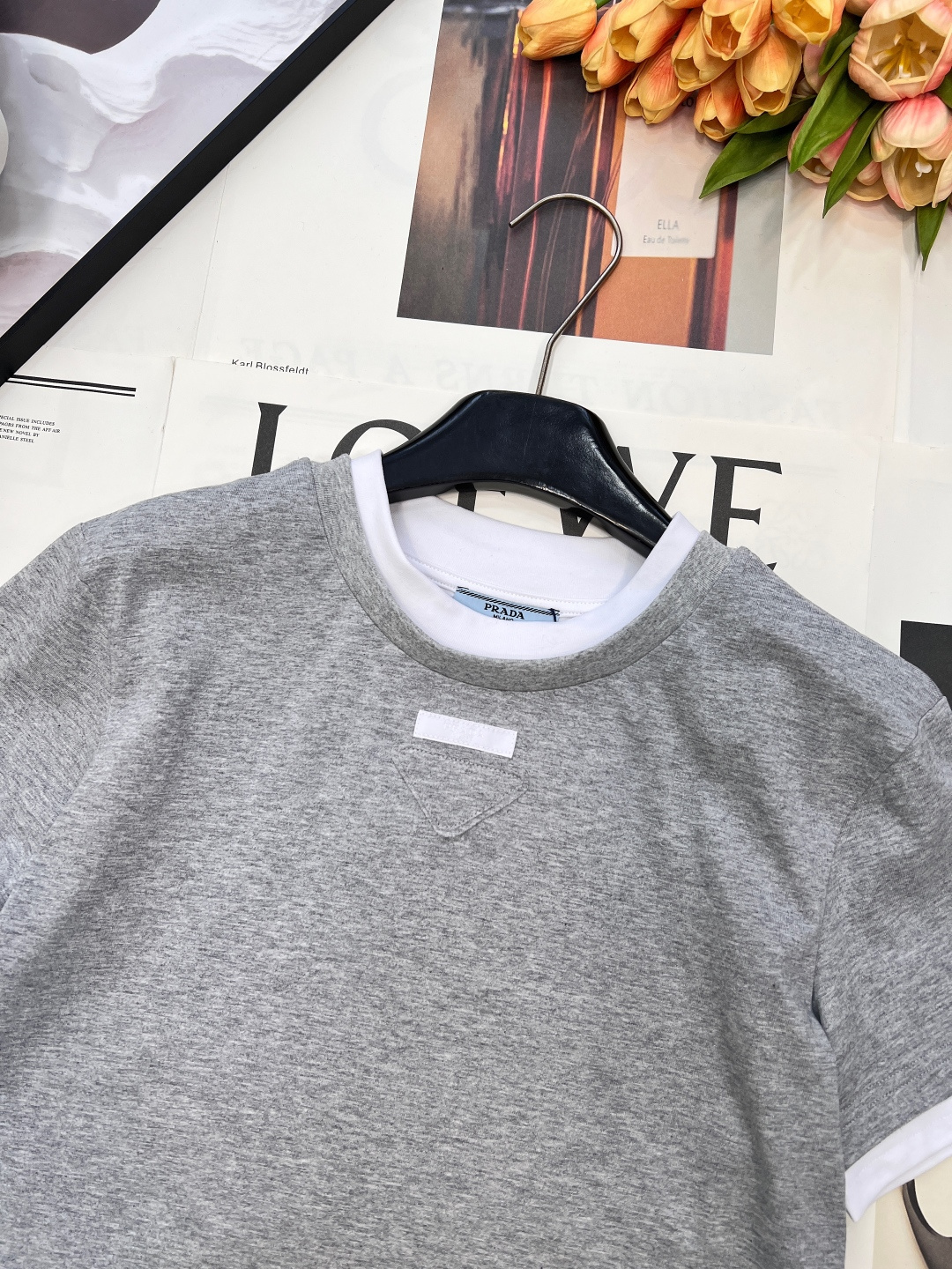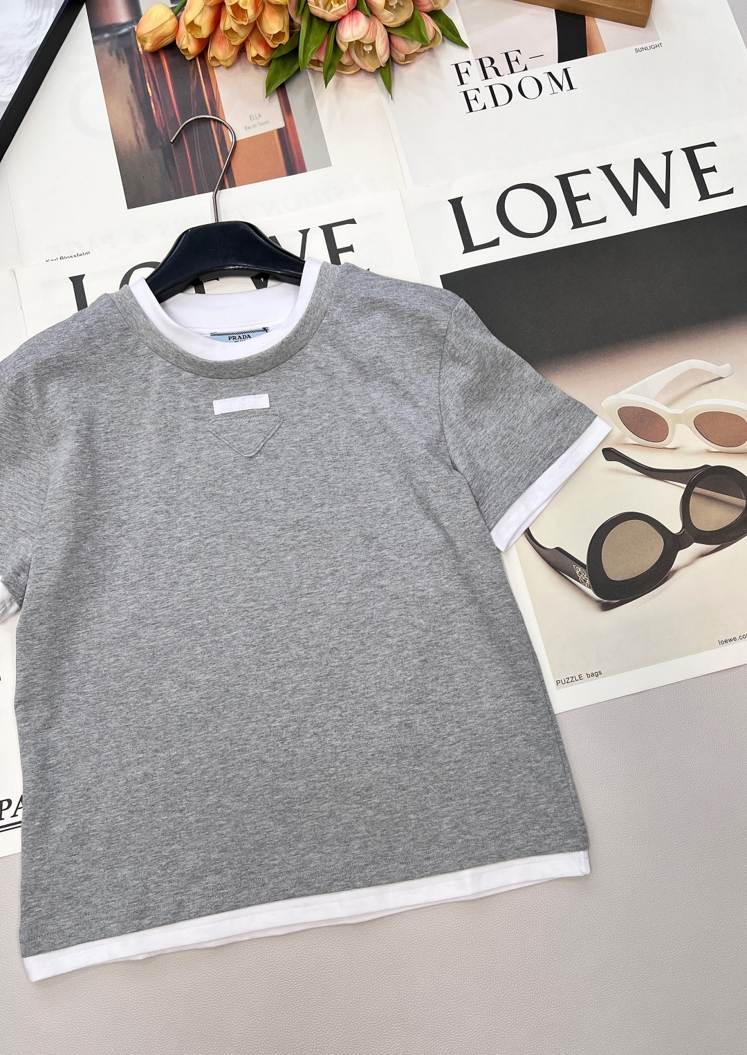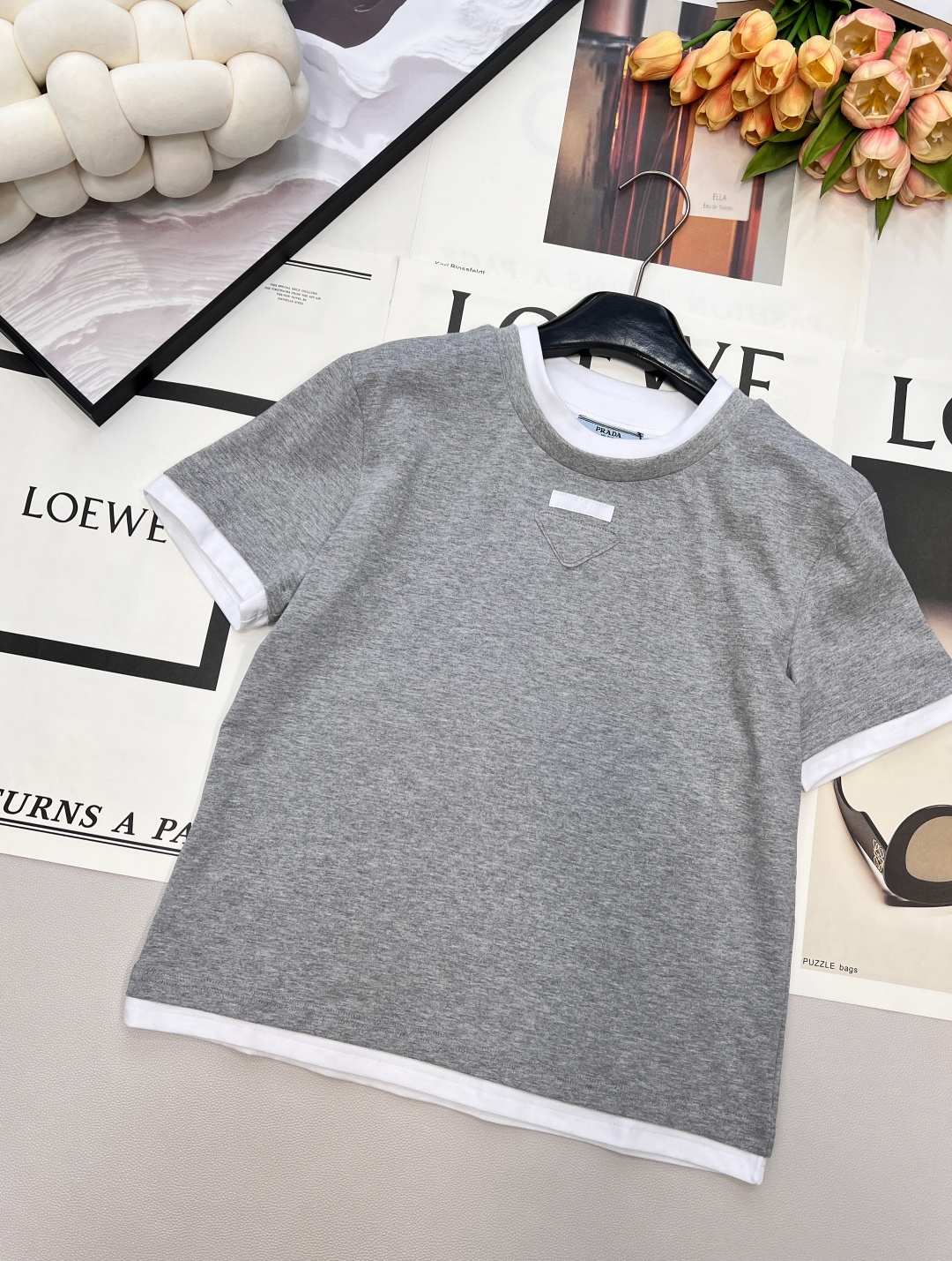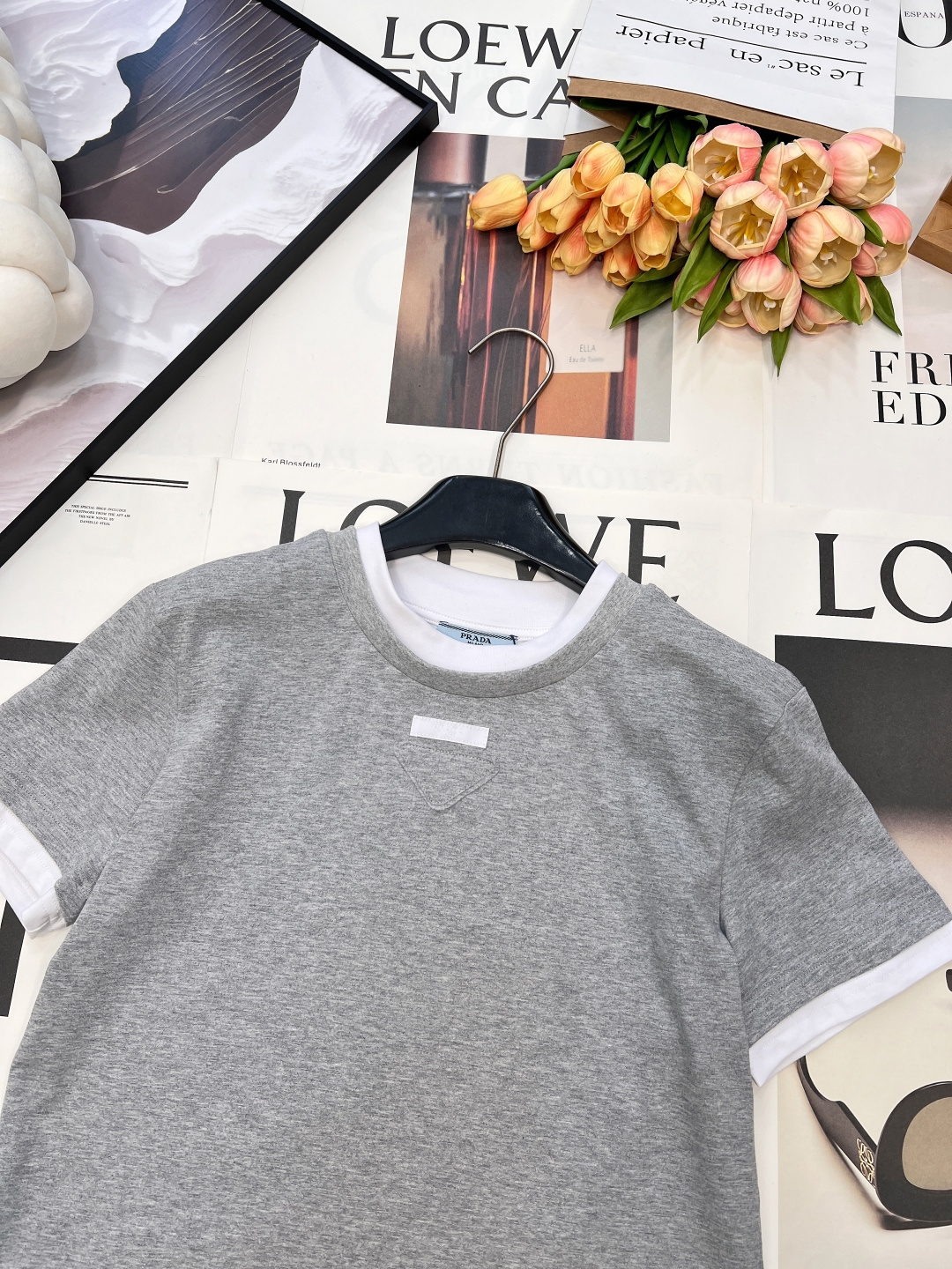 Details: Contrasting color fake two-piece T-shirt with triangle logo, breathable and trendy.