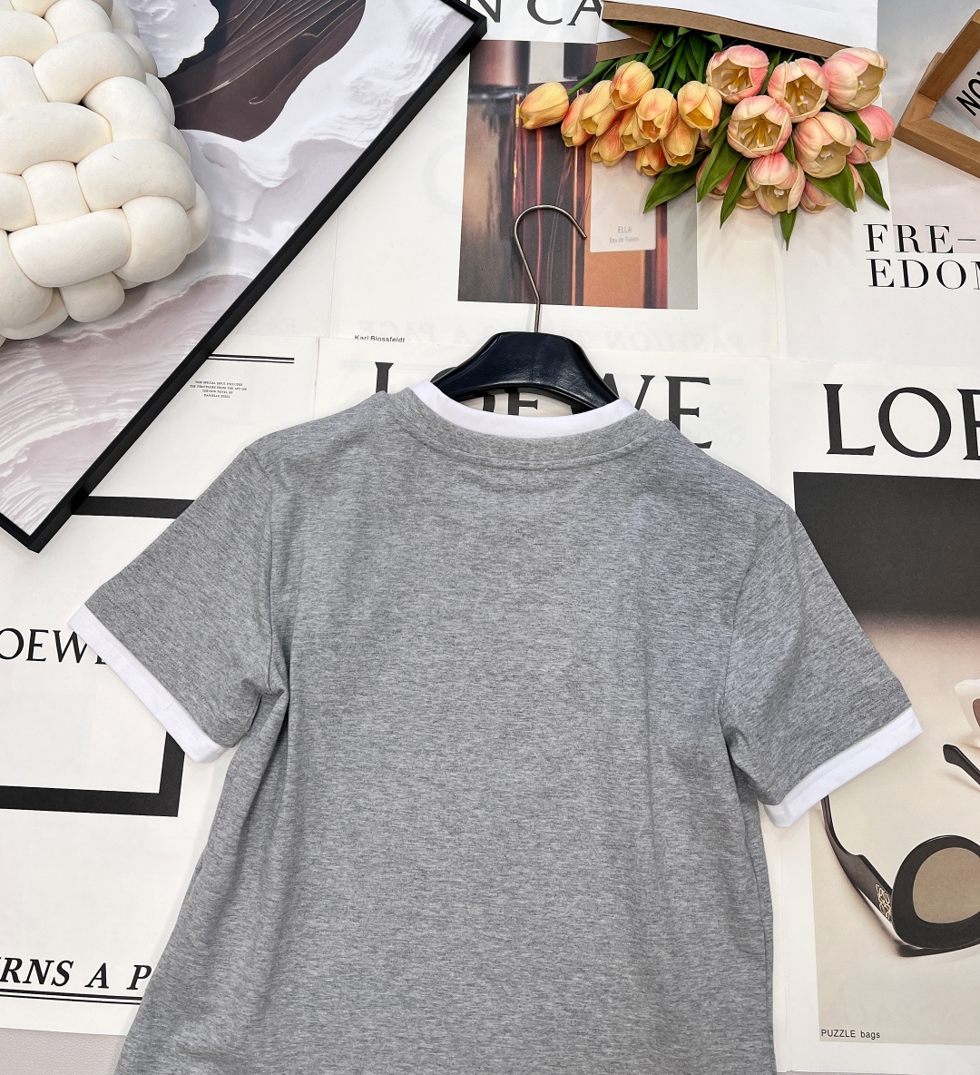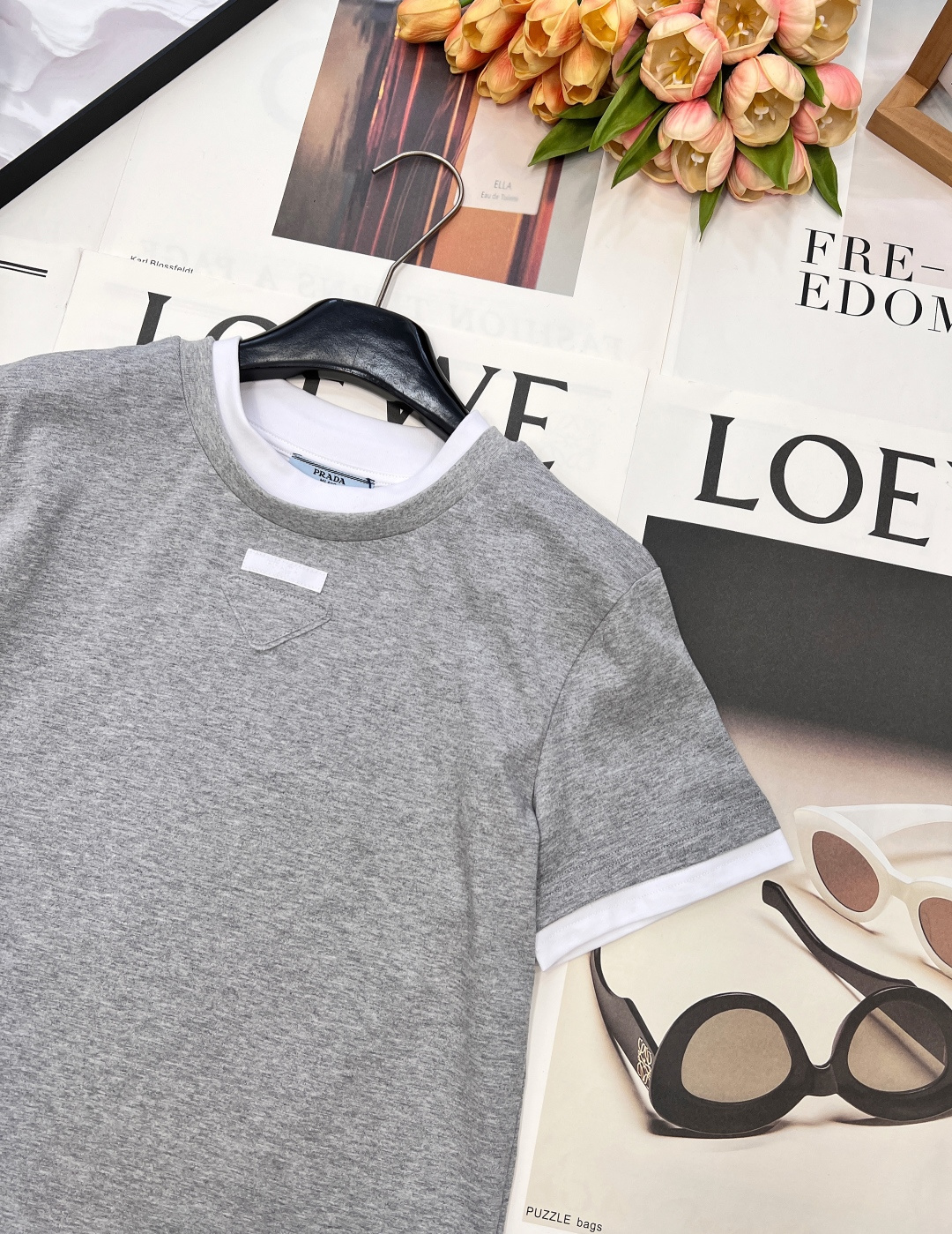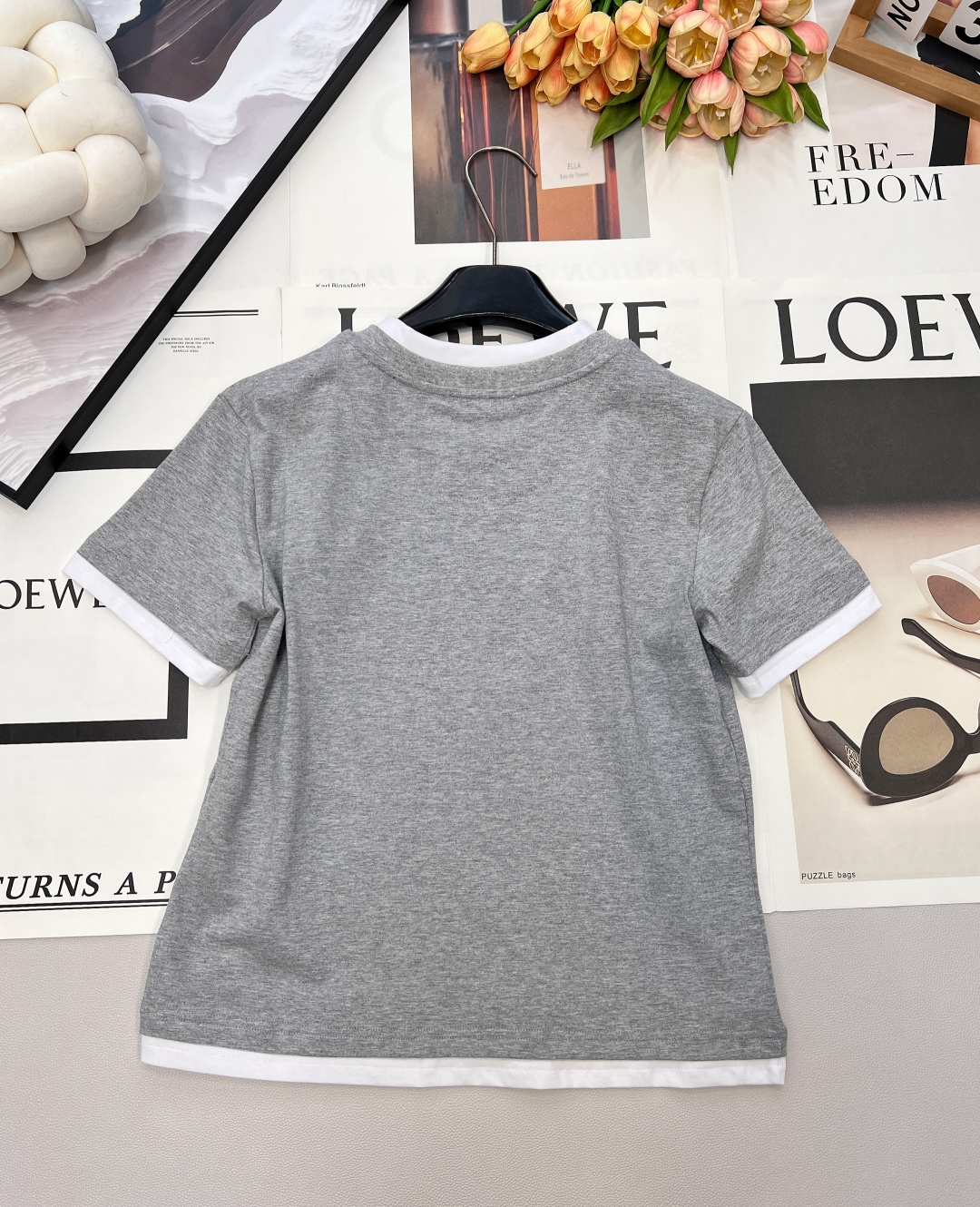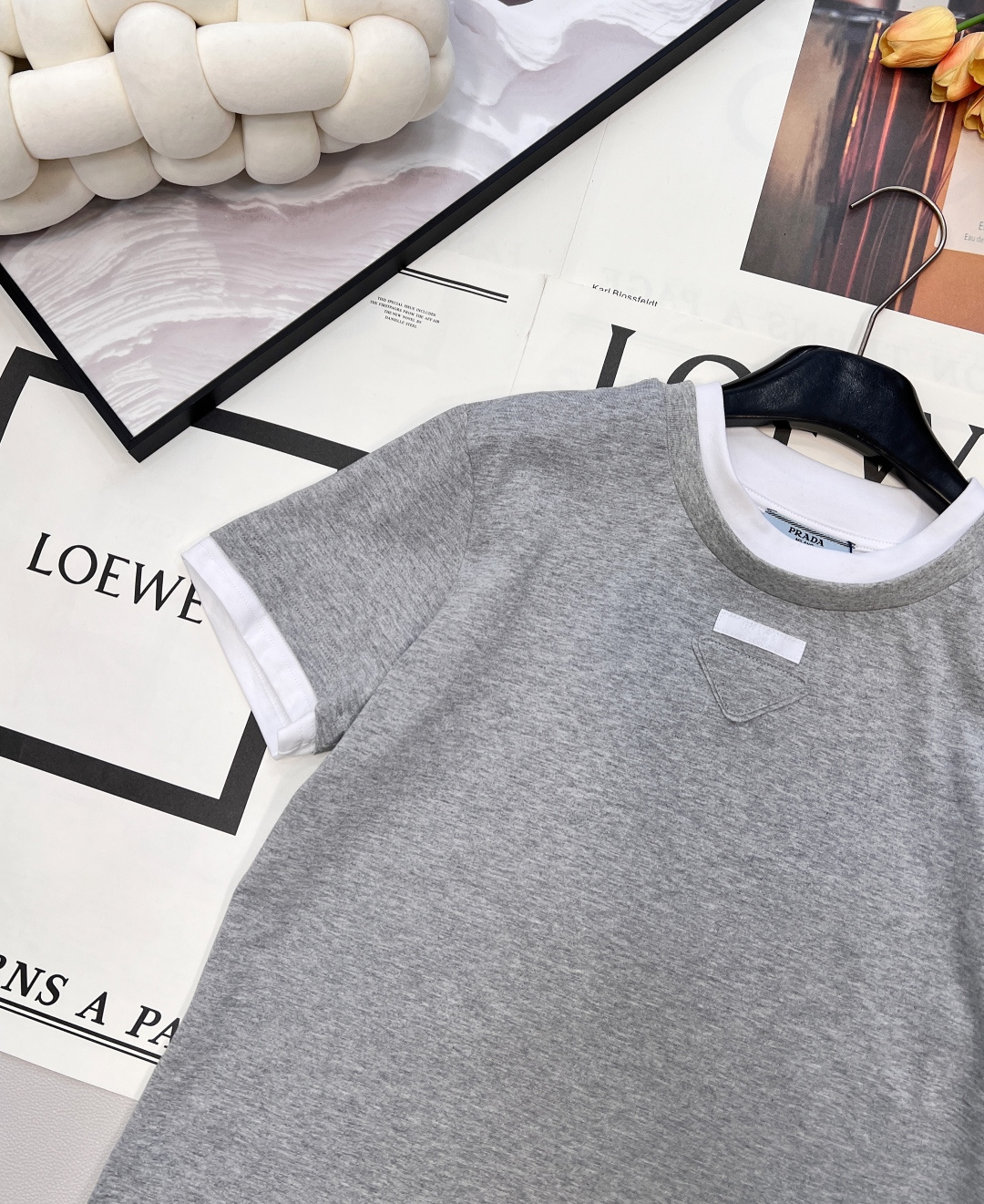 Details: Contrasting color fake two-piece T-shirt with triangle logo, breathable and trendy.