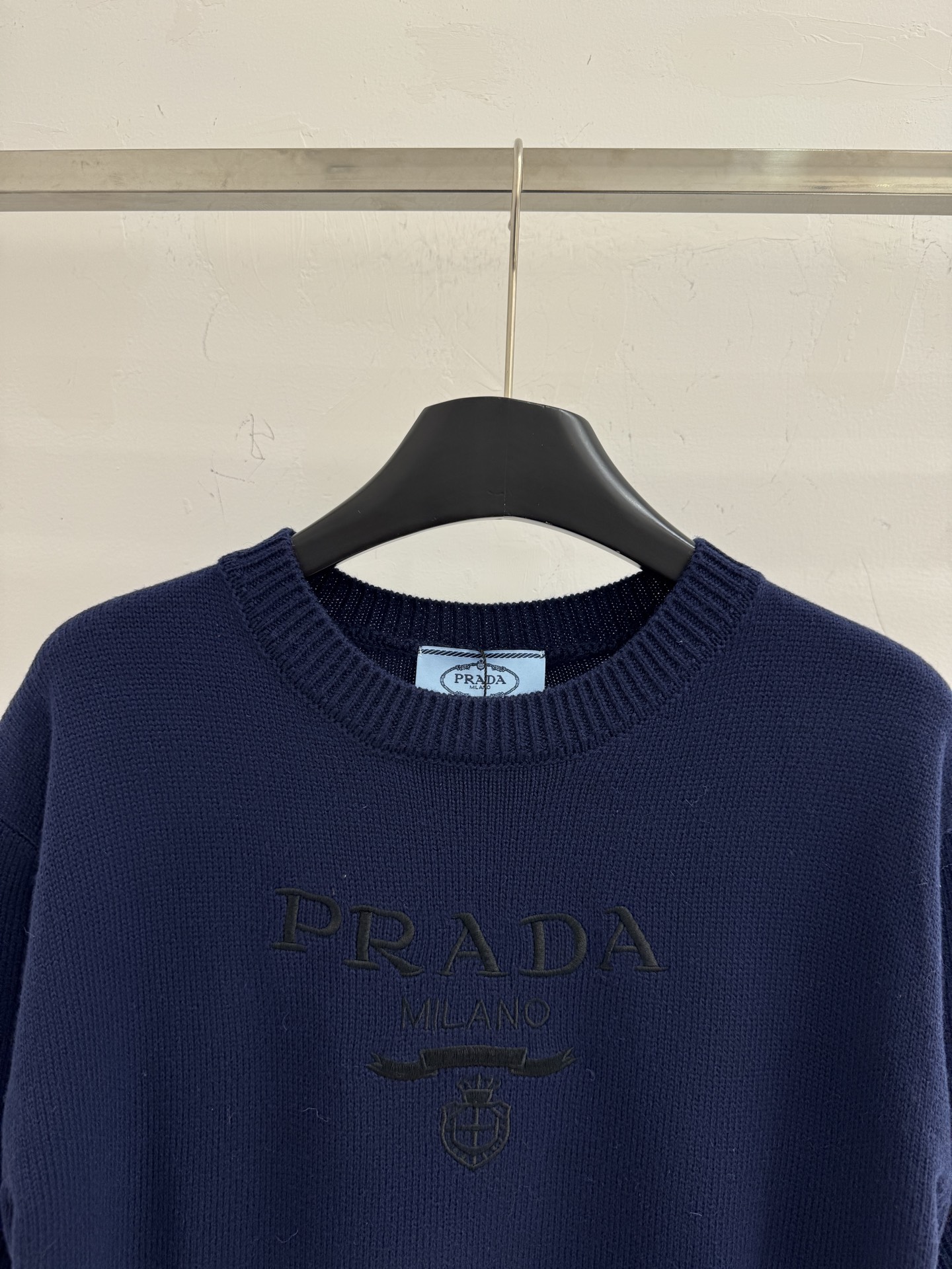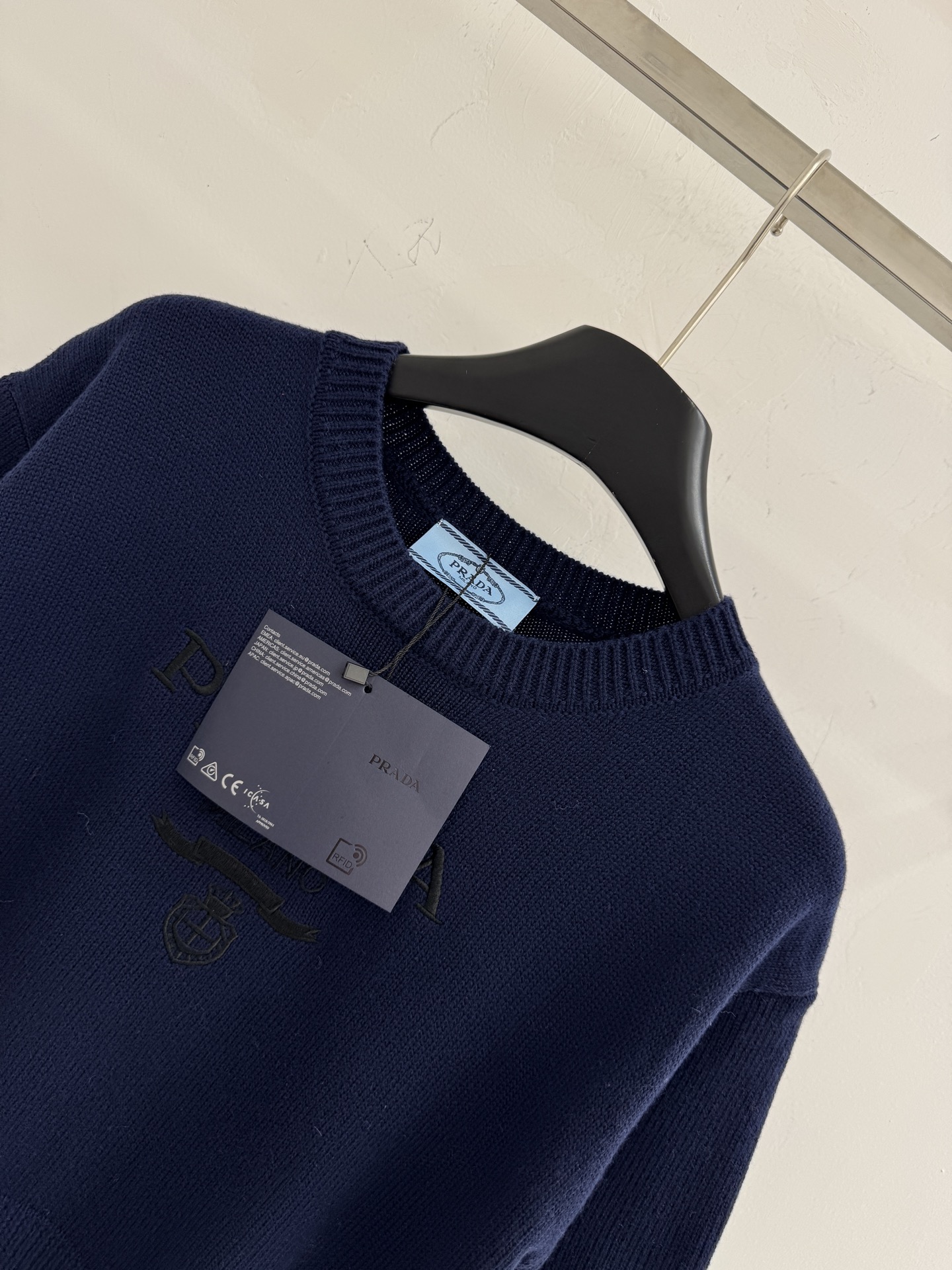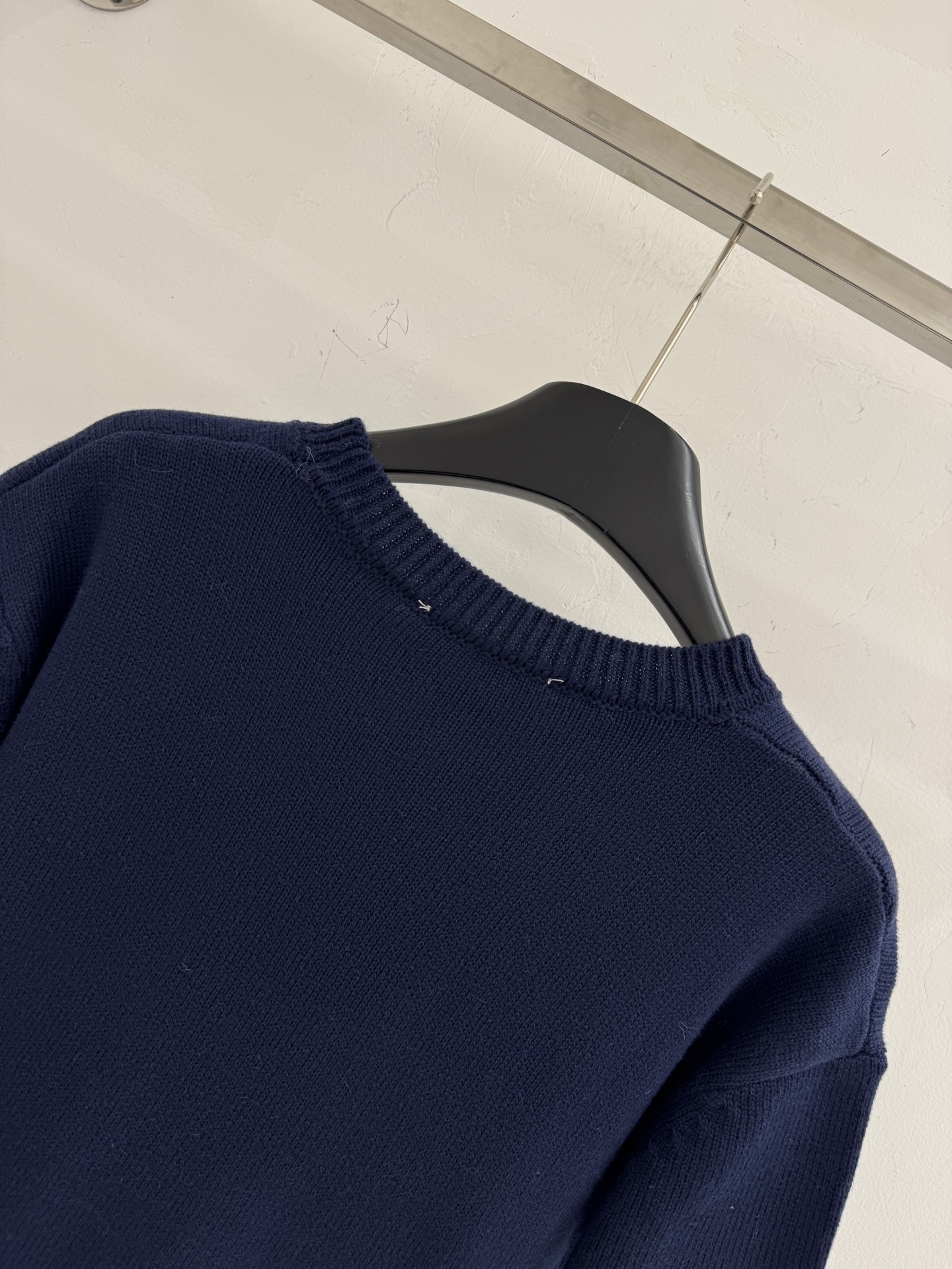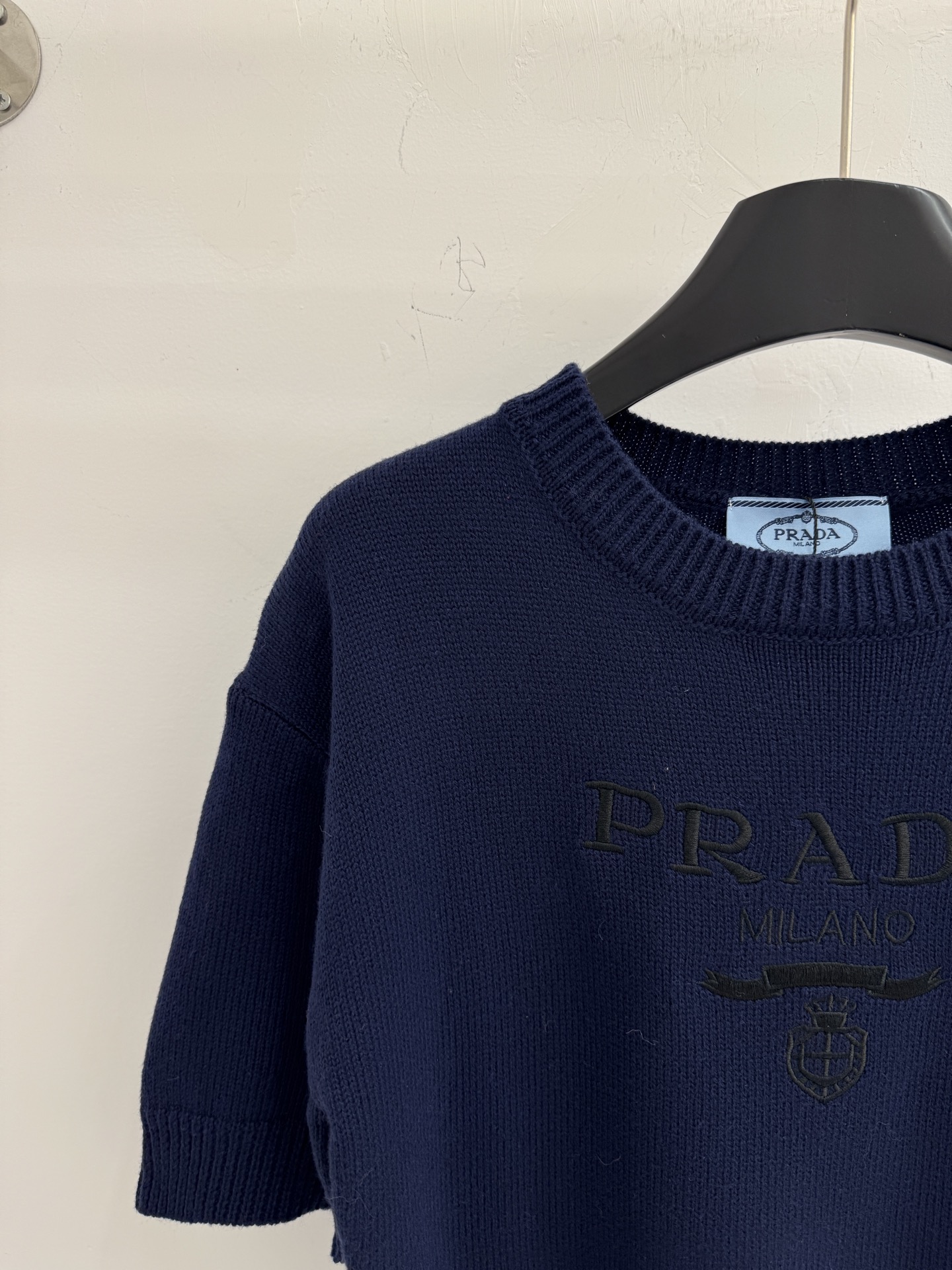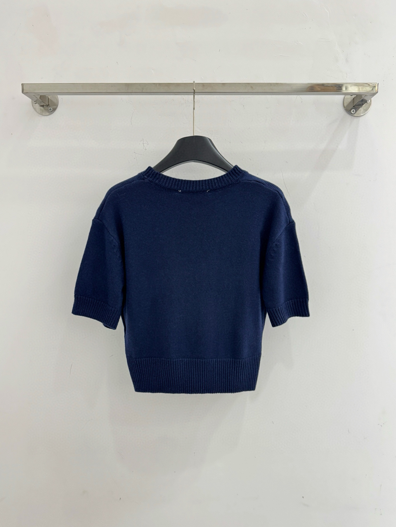 Details: Early spring short-sleeved knit sweater with letter embroidery, dark blue, available in S, M, L sizes. High-end customization, fine workmanship