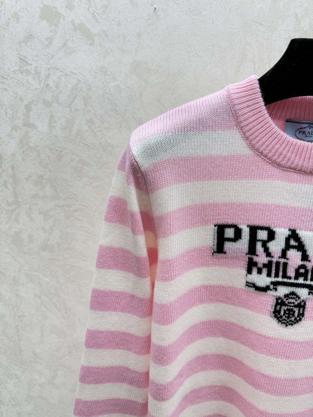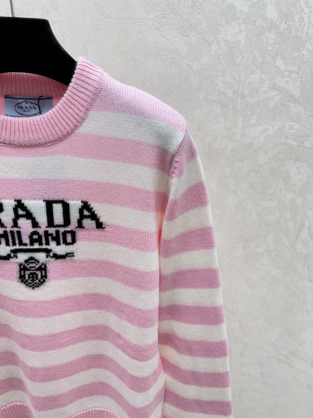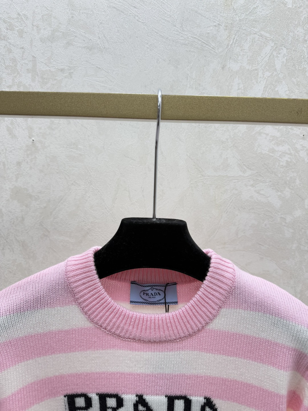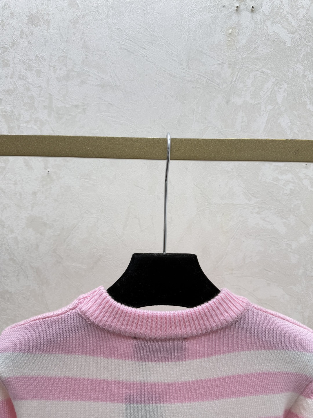 Details: Early autumn new arrival, pink color-blocked striped letter round-neck knitted long-sleeve, available in sizes 36 - 40.