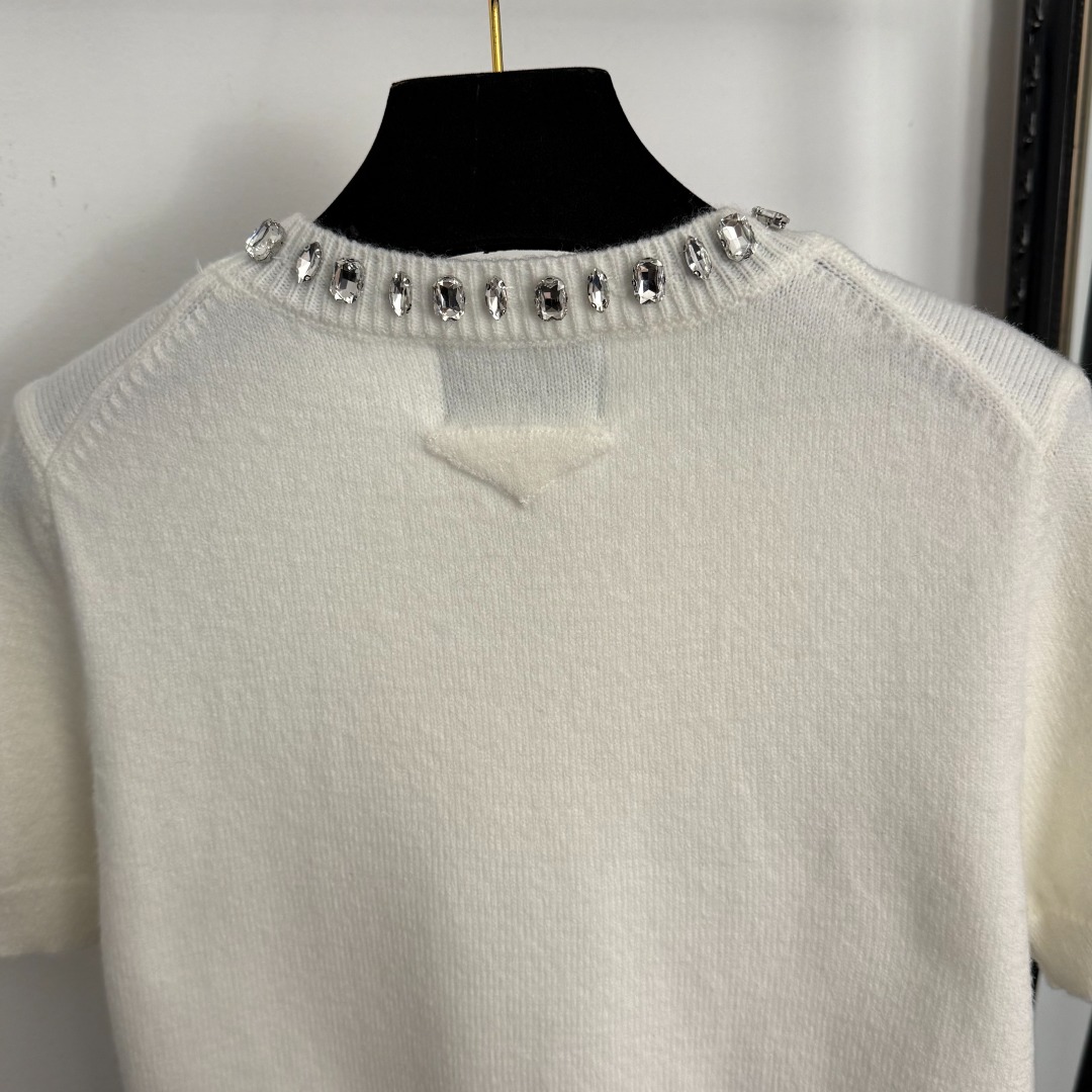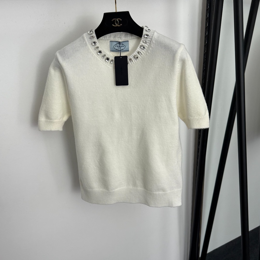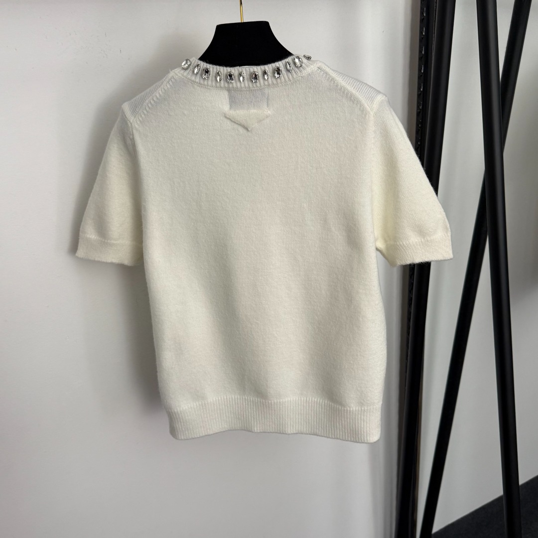 Details: New studded round-neck short-sleeved knitted top in white, red, etc., one size, high-end customization, fine workmanship