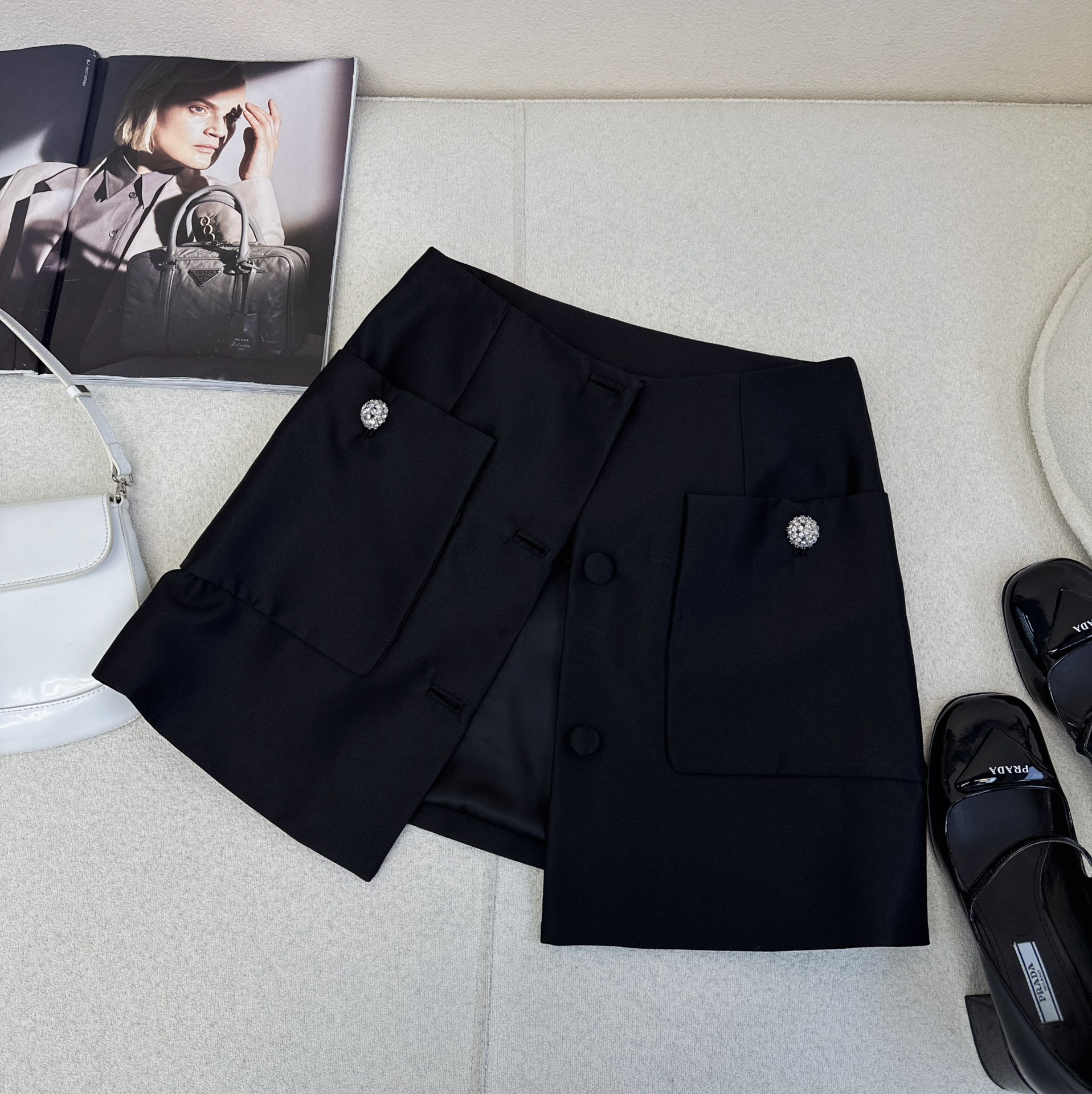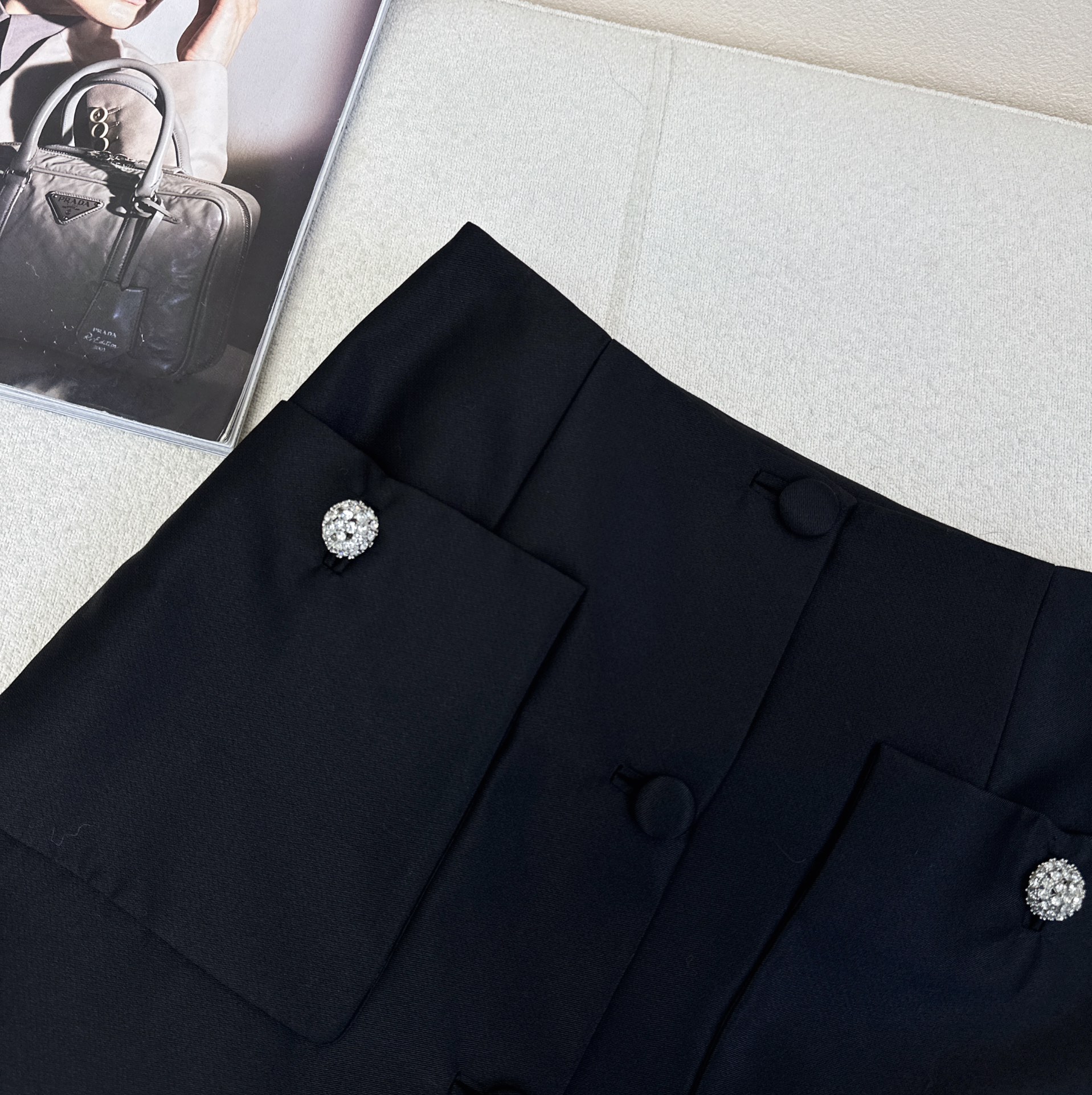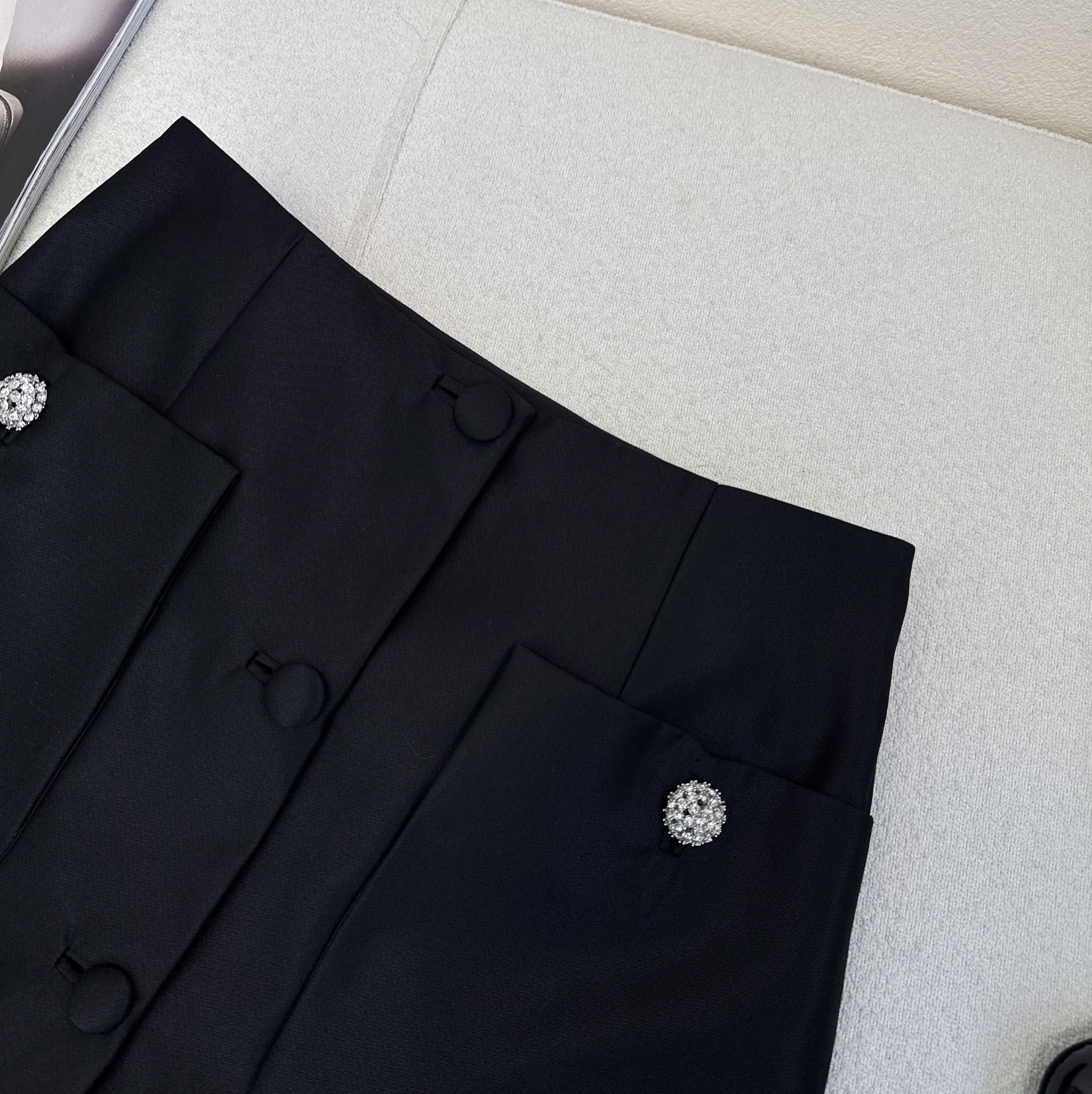 Details: Vintage suit with short jacket and A - line skirt, crafted from high - quality twill, well - tailored. High - end customization with fine workmanship and original quality.