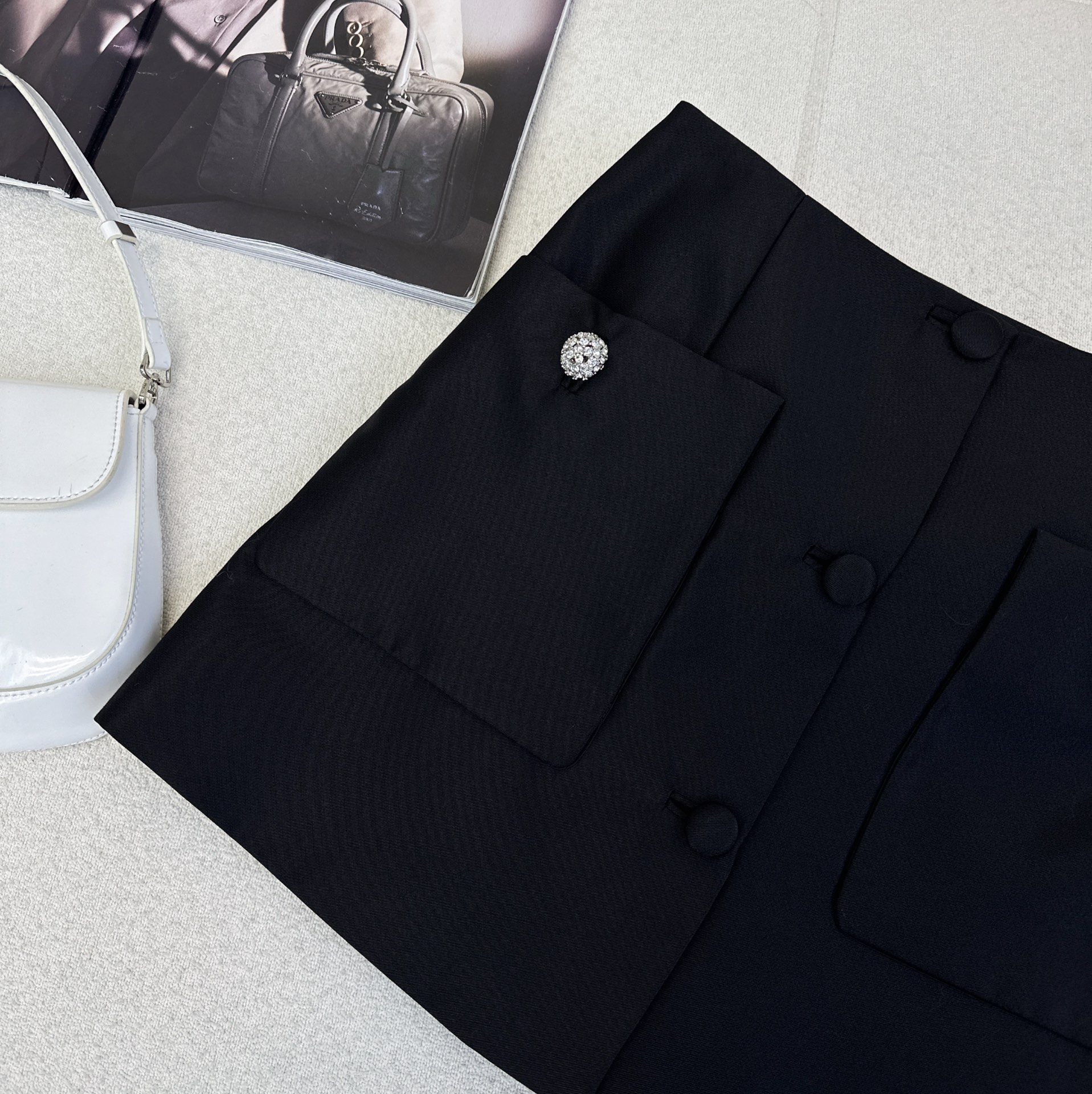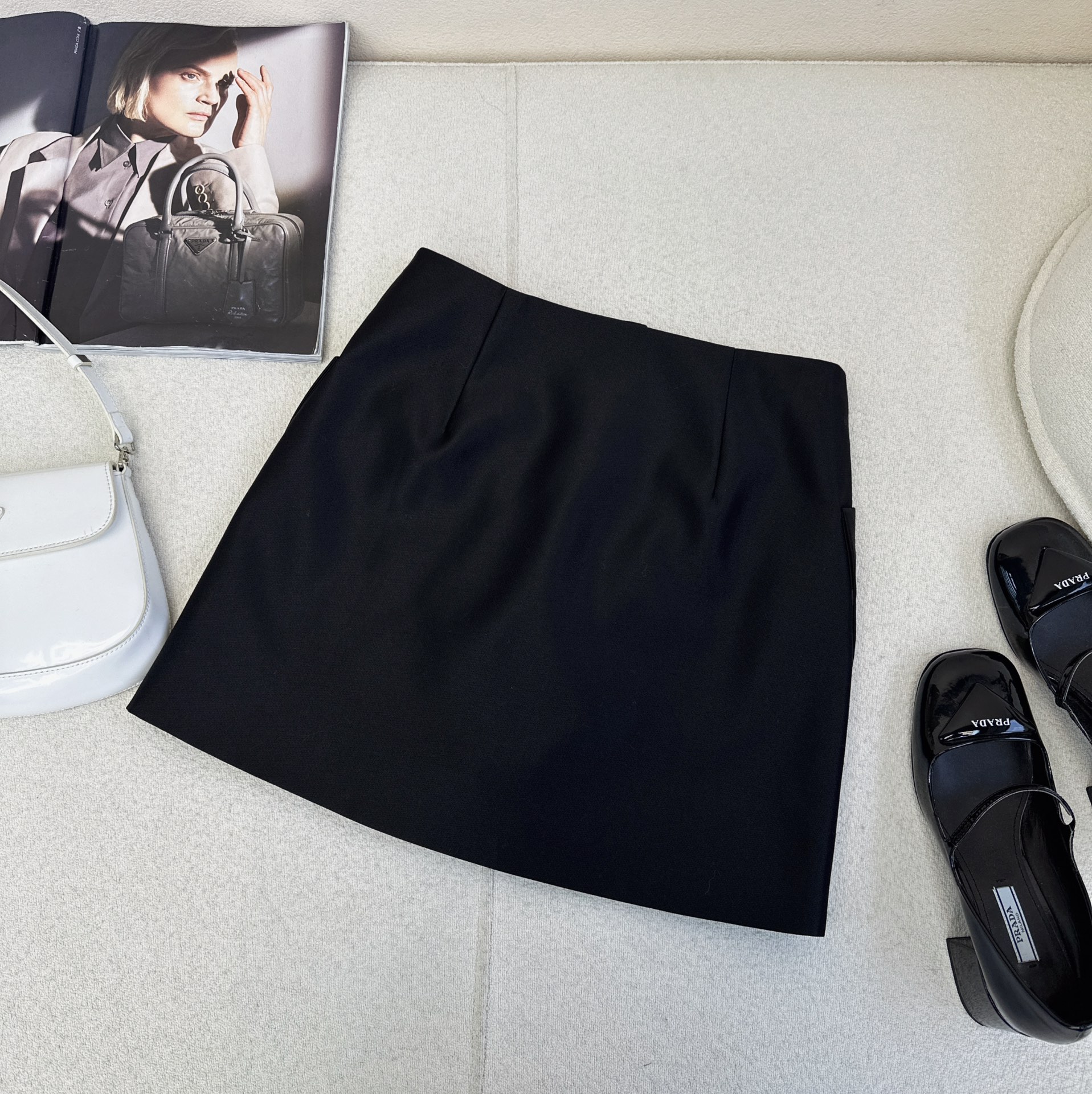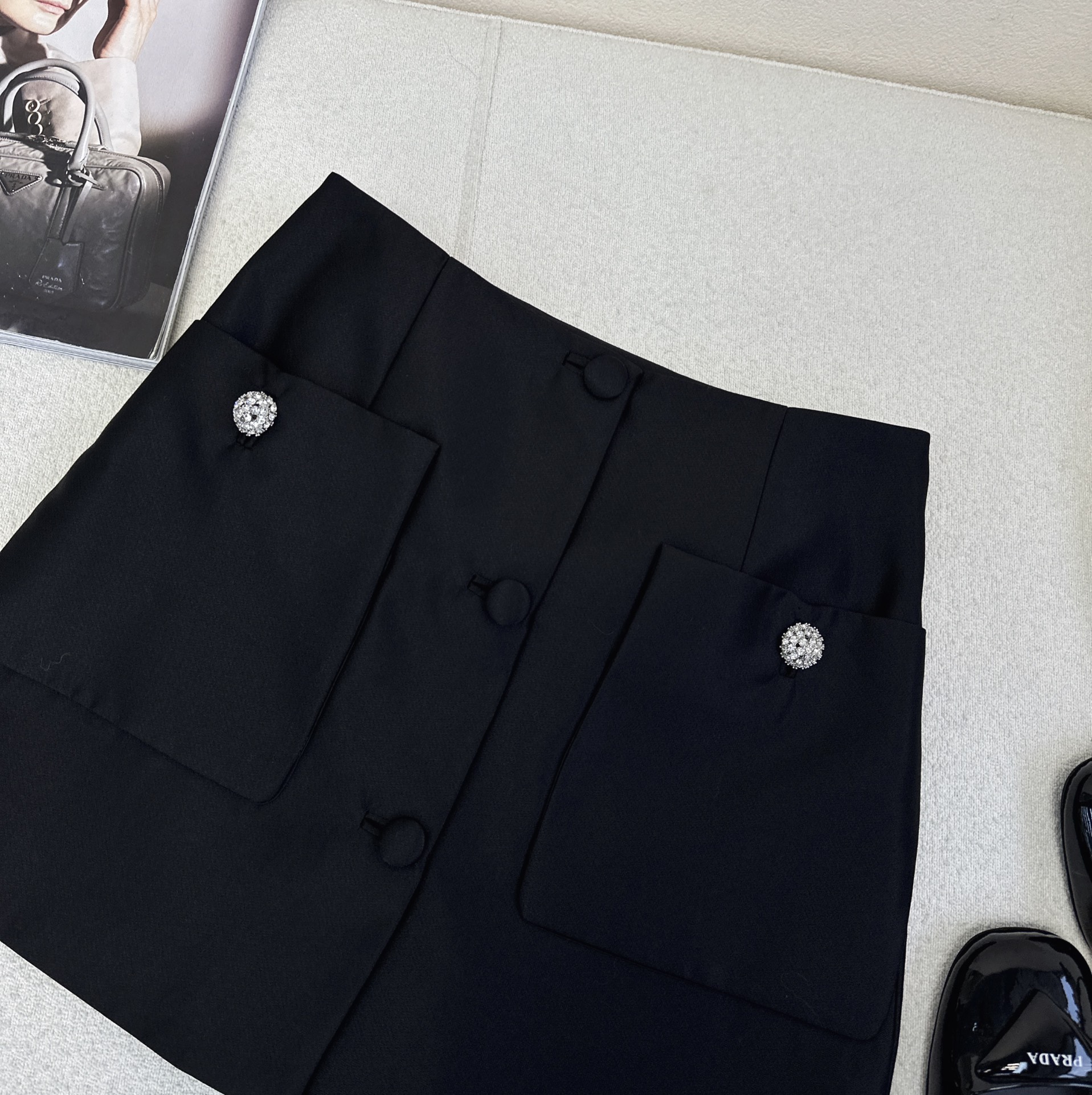 Details: Vintage suit with short jacket and A - line skirt, crafted from high - quality twill, well - tailored. High - end customization with fine workmanship and original quality.