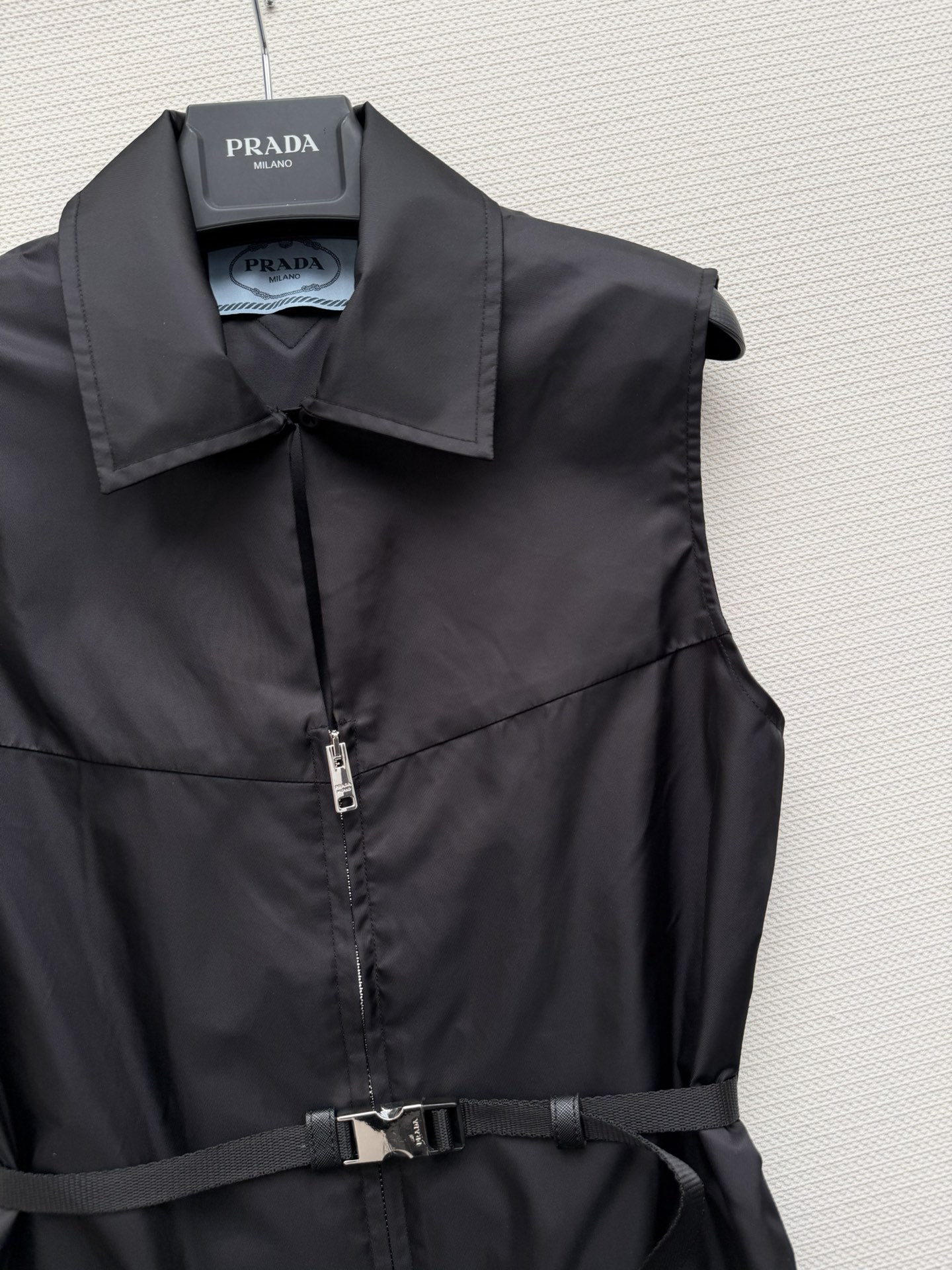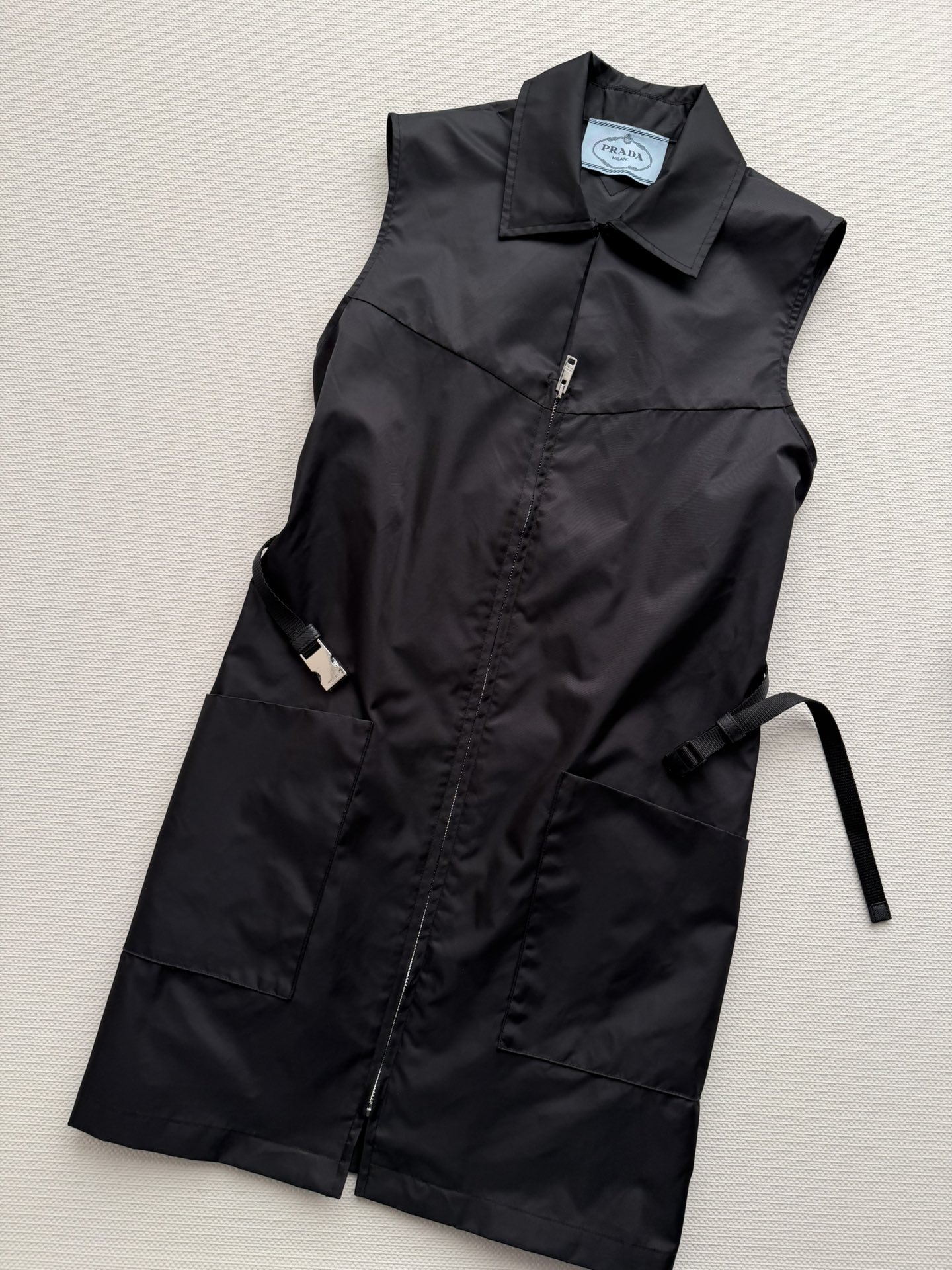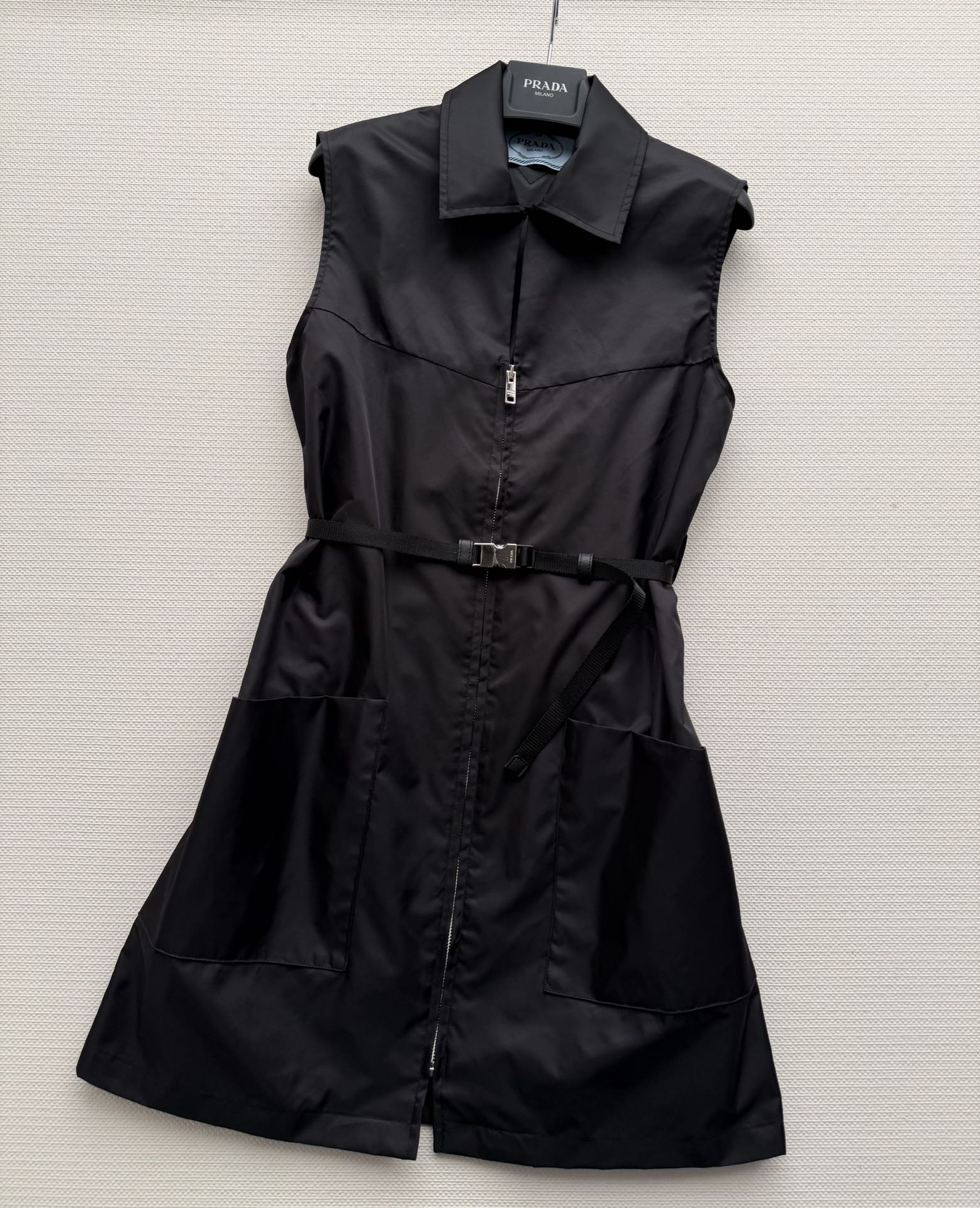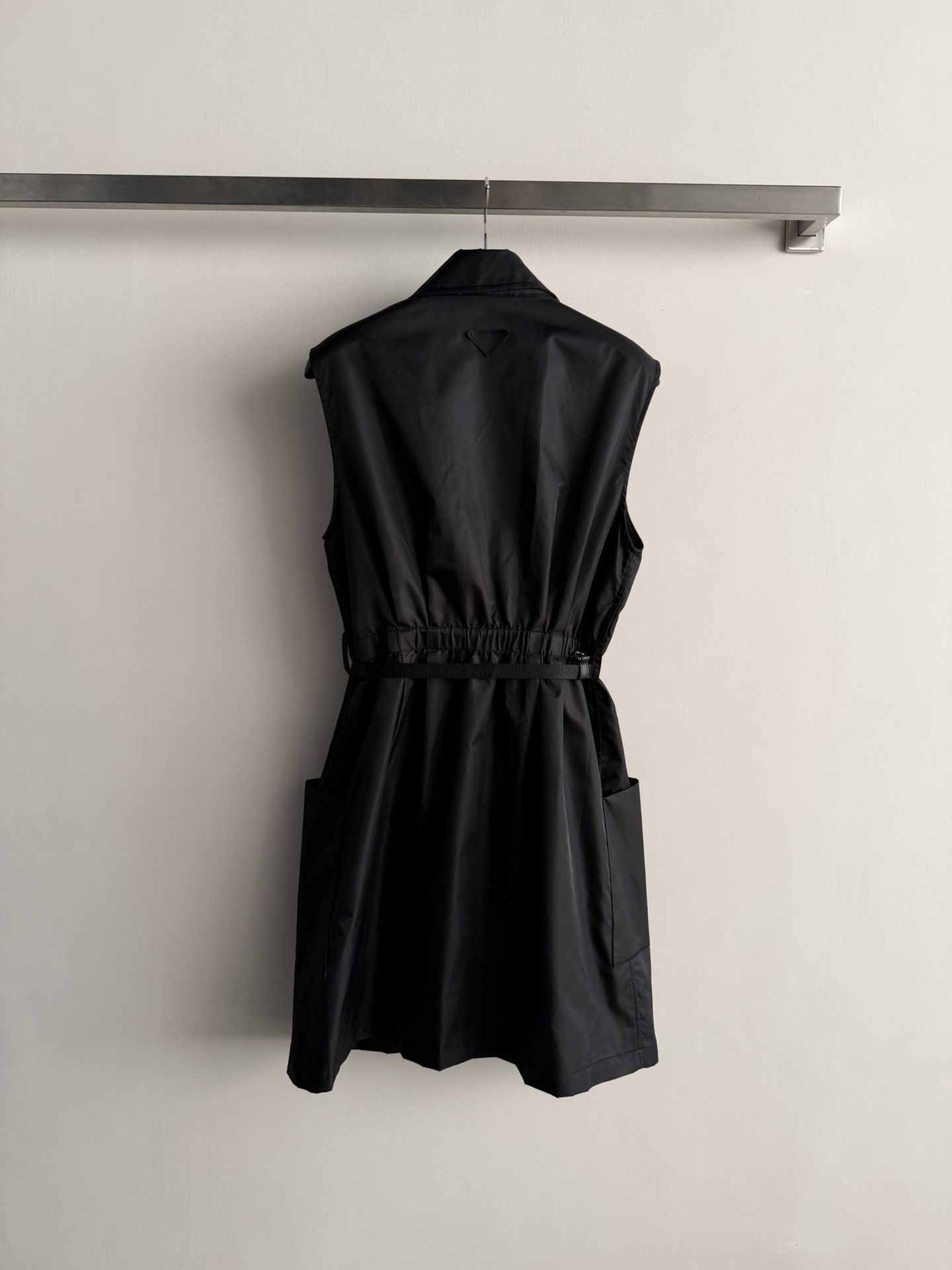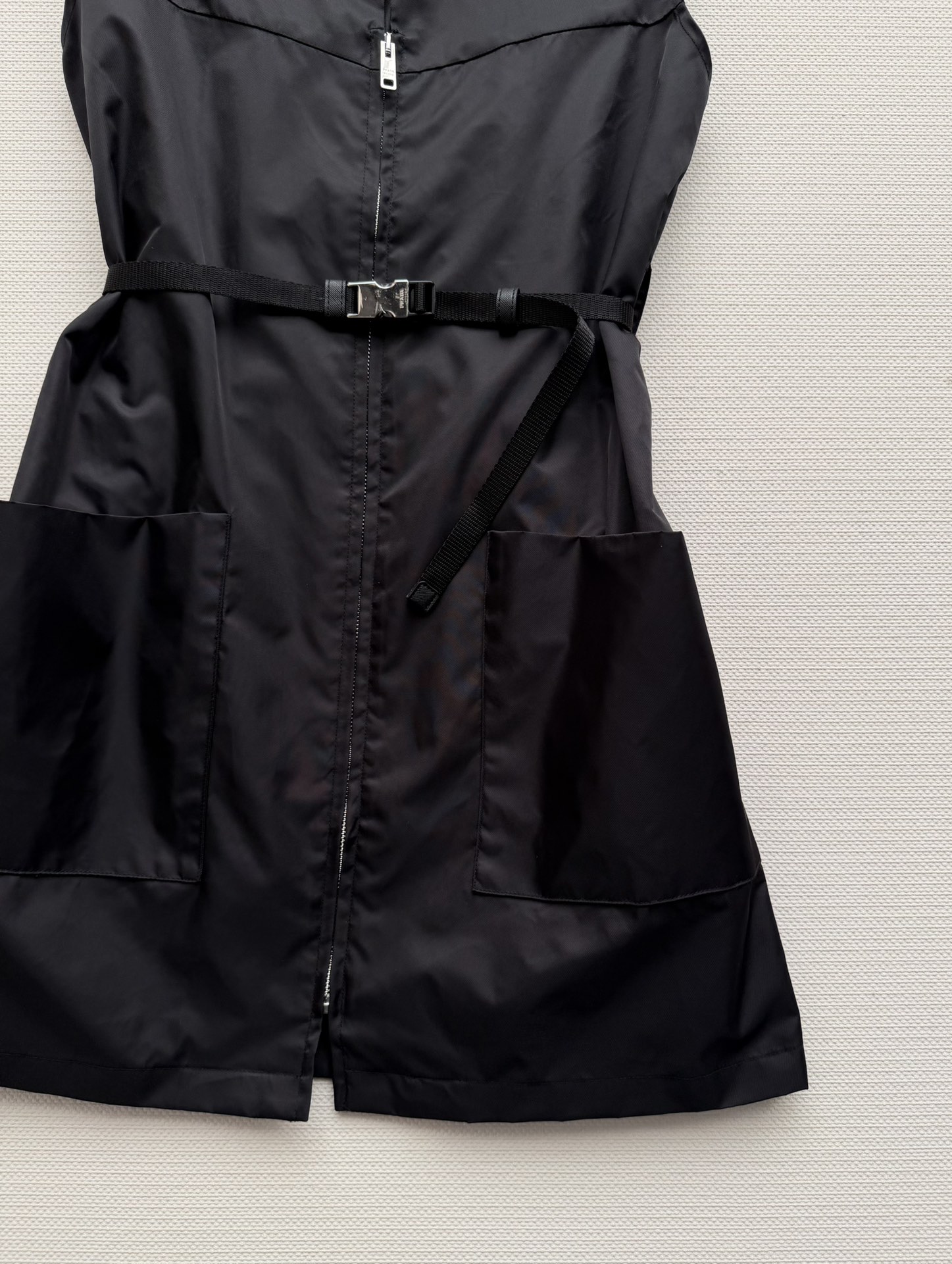 Details: Black sleeveless nylon dress with a zipper and adjustable belt. Large pockets add functionality, suitable for spring.