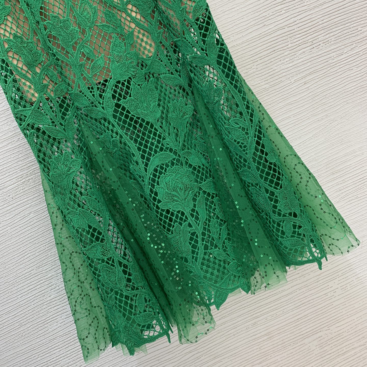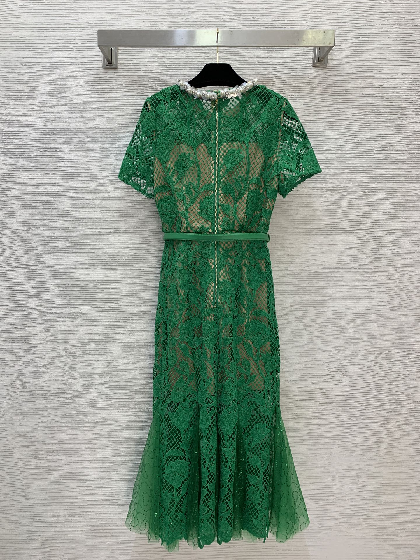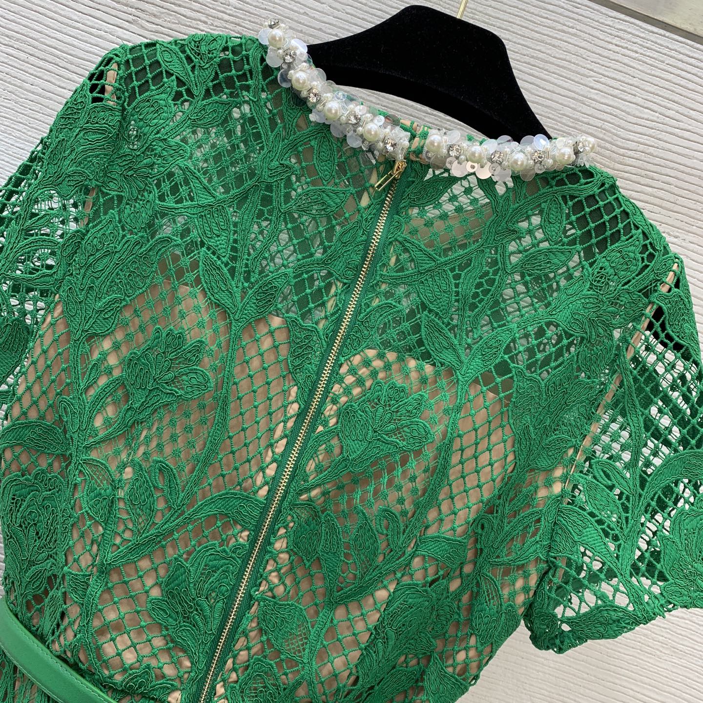 Details: new lace dress with cut-out design and beaded collar. Figure-hugging silhouette in green. High-end custom creation with meticulous craftsmanship, ensuring 1:1 original quality.