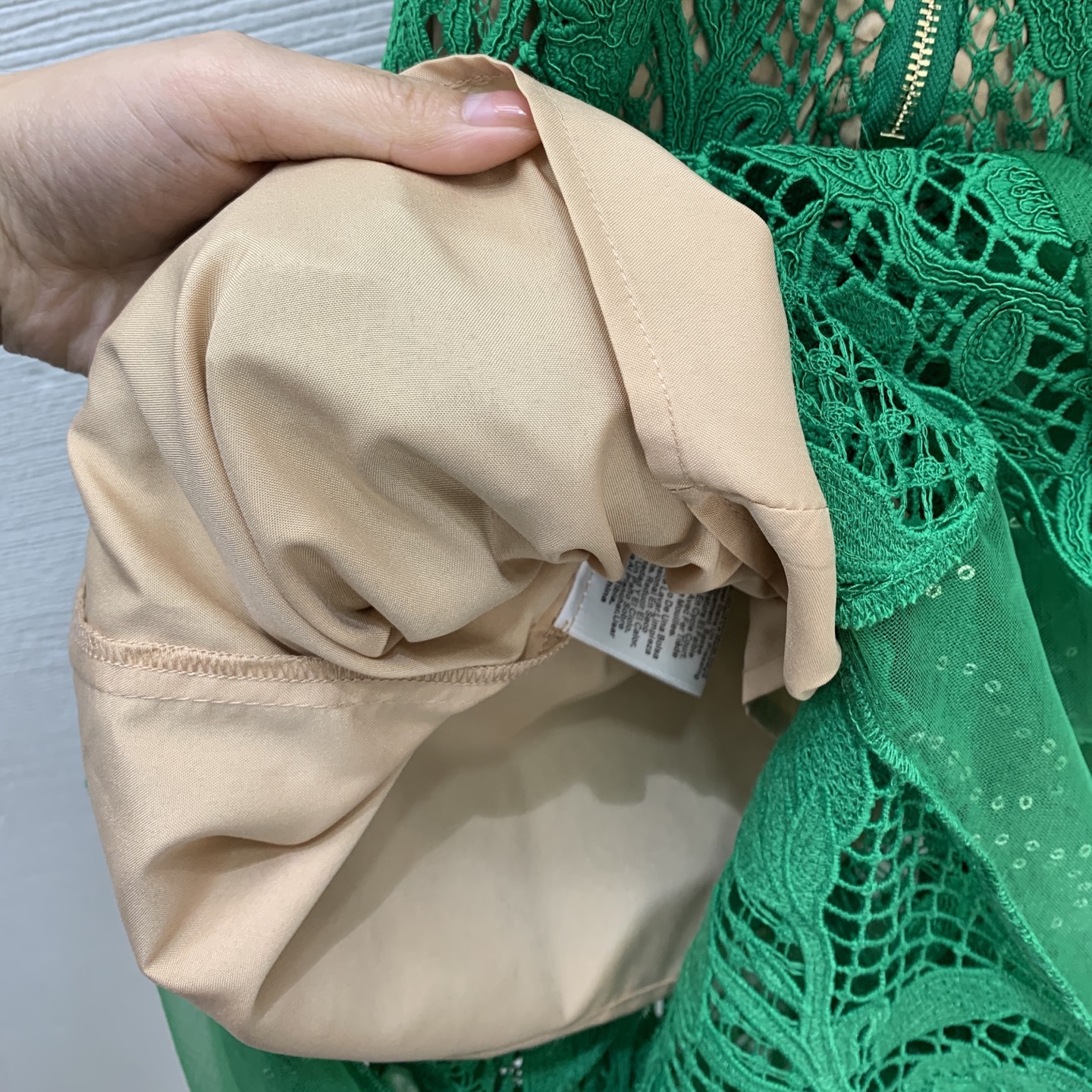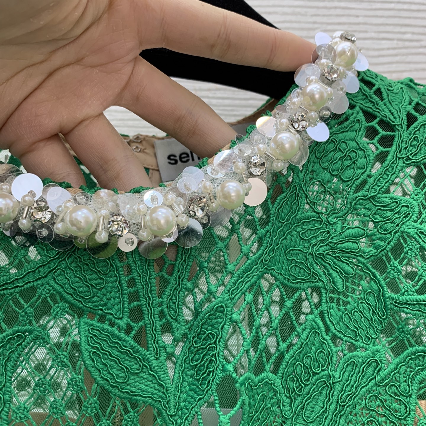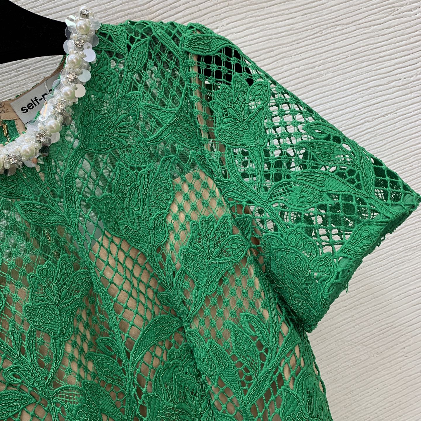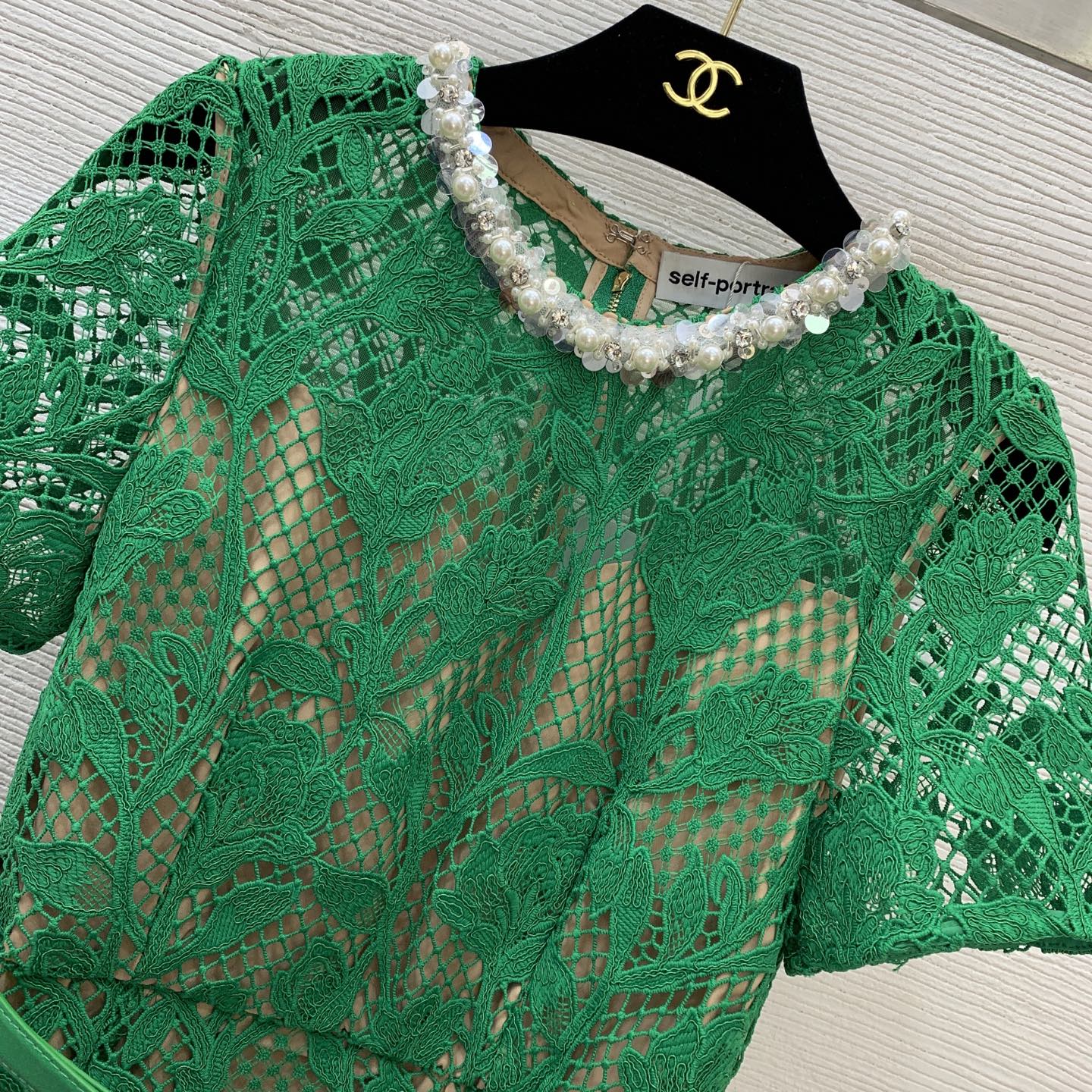 Details: new lace dress with cut-out design and beaded collar. Figure-hugging silhouette in green. High-end custom creation with meticulous craftsmanship, ensuring 1:1 original quality.