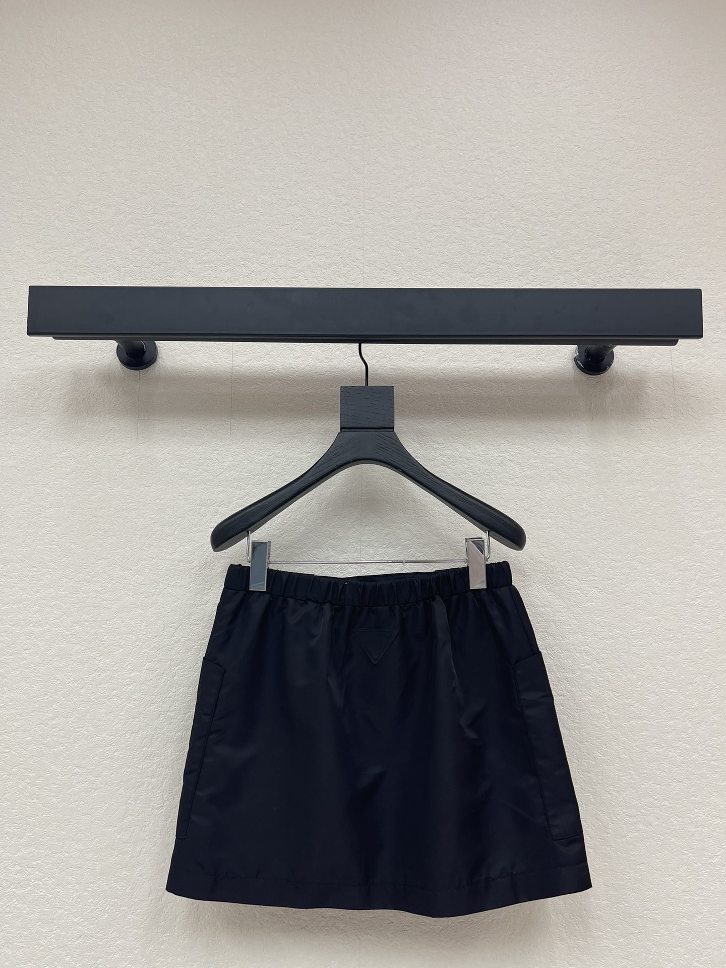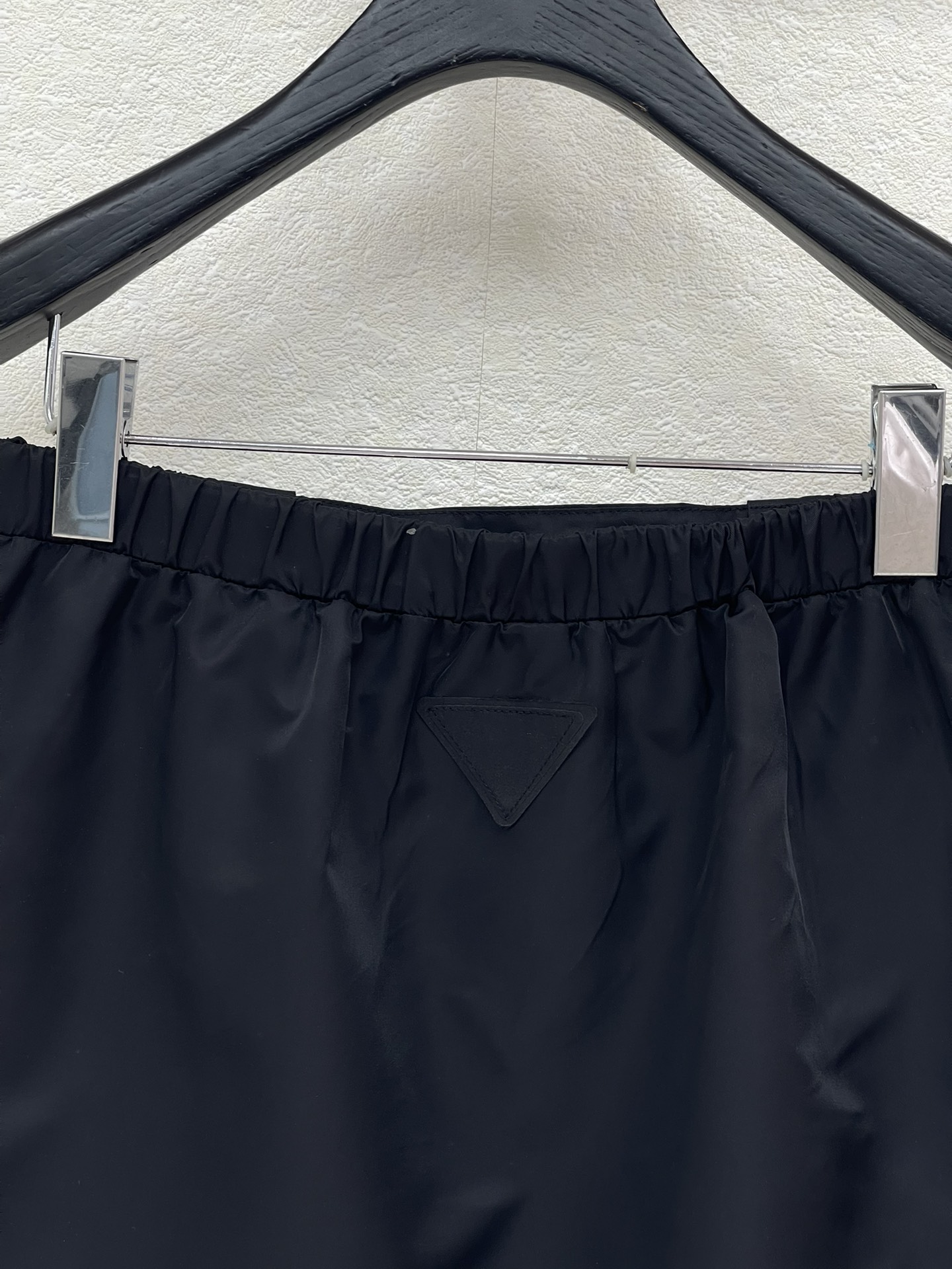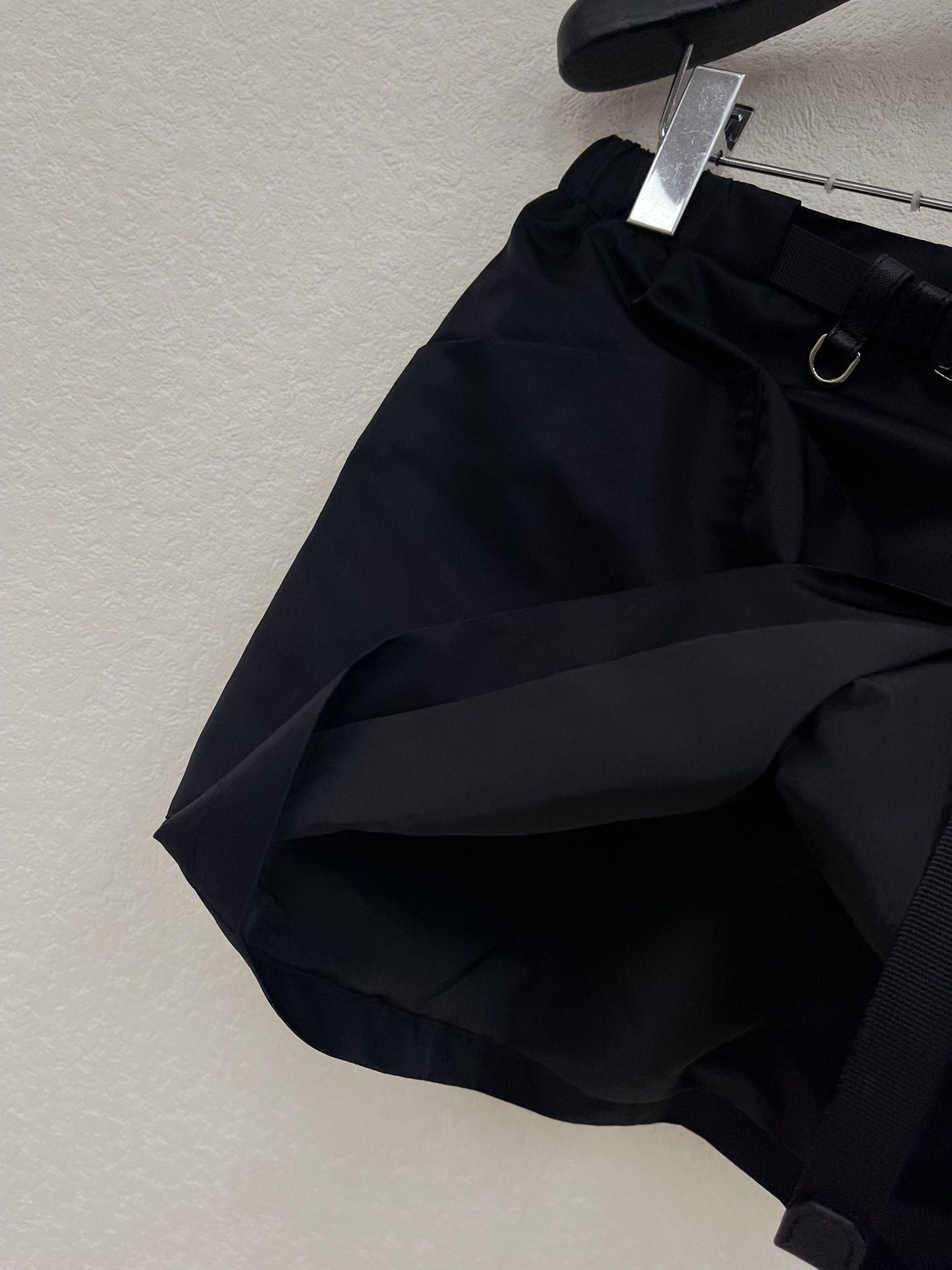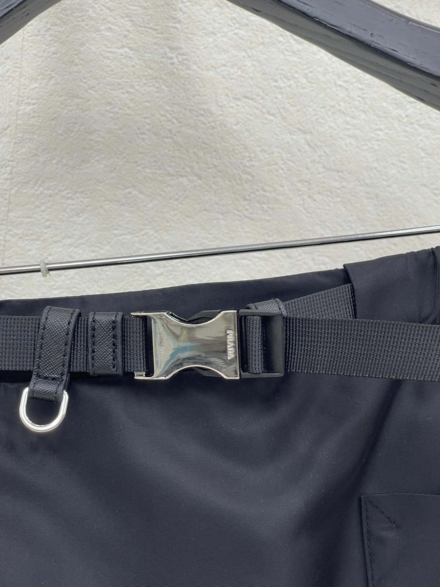 Details: Early spring black nylon skirt with iconic belt, A-line silhouette, fusing workwear and elegance.