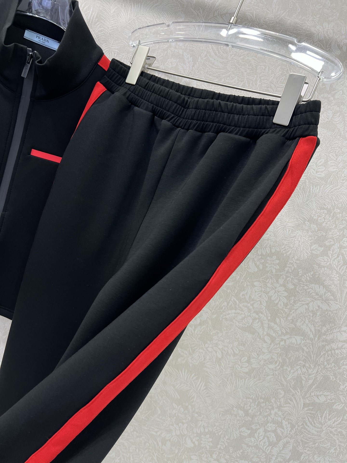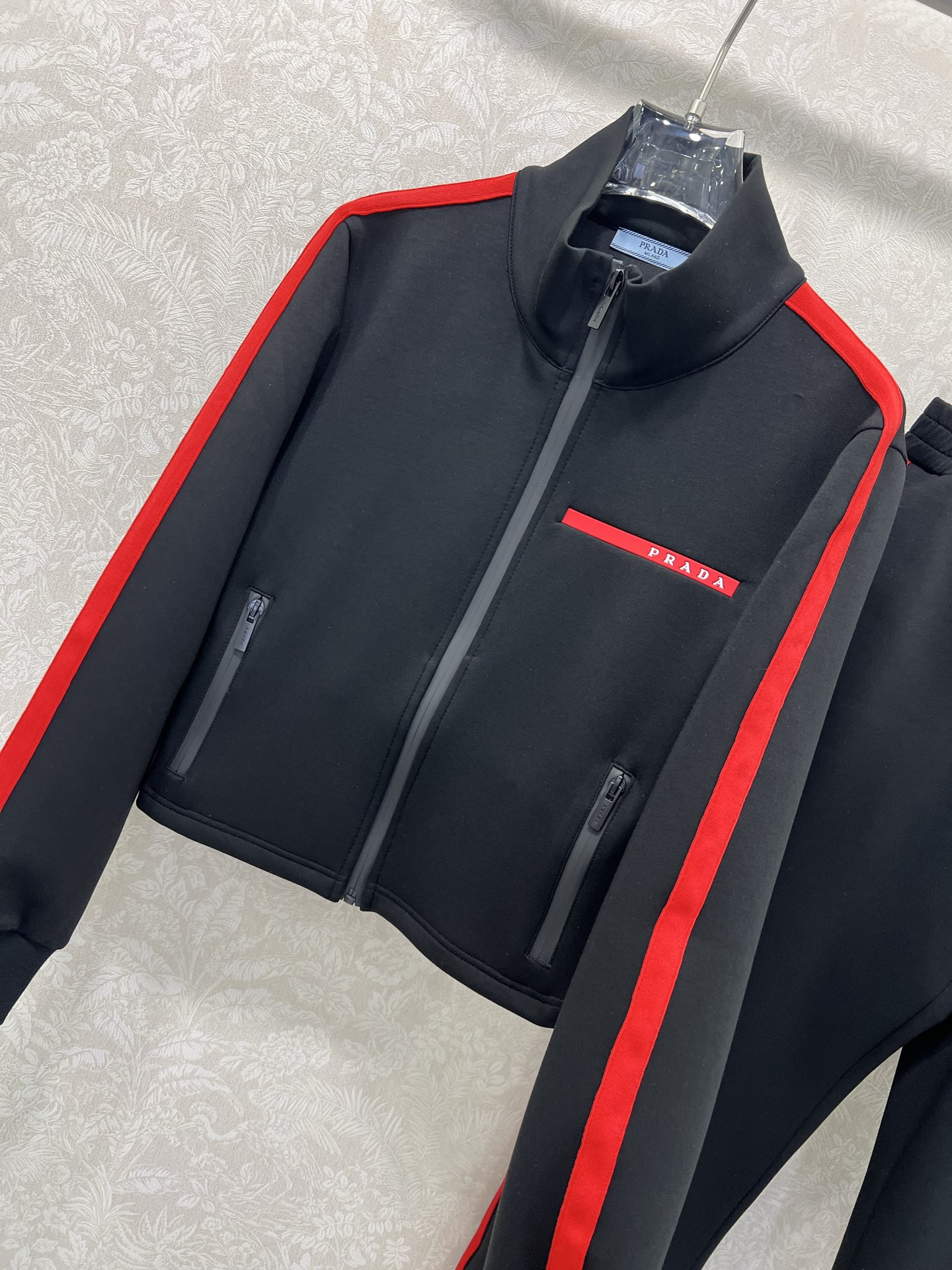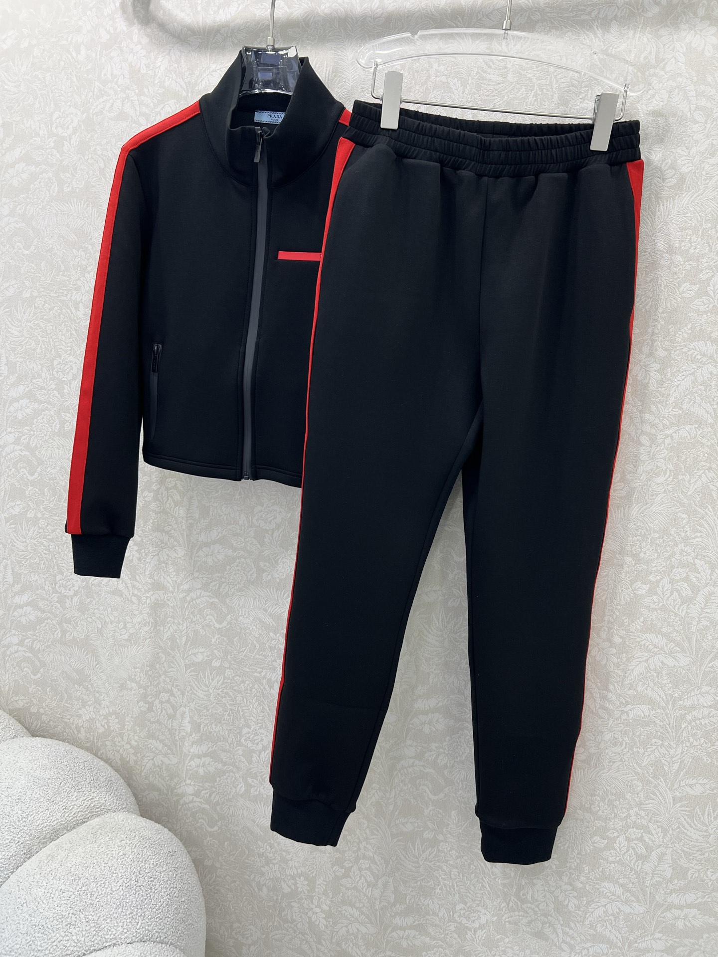 Details: Space cotton suit with red logo, featuring black and red color combination, fashionable and warm.