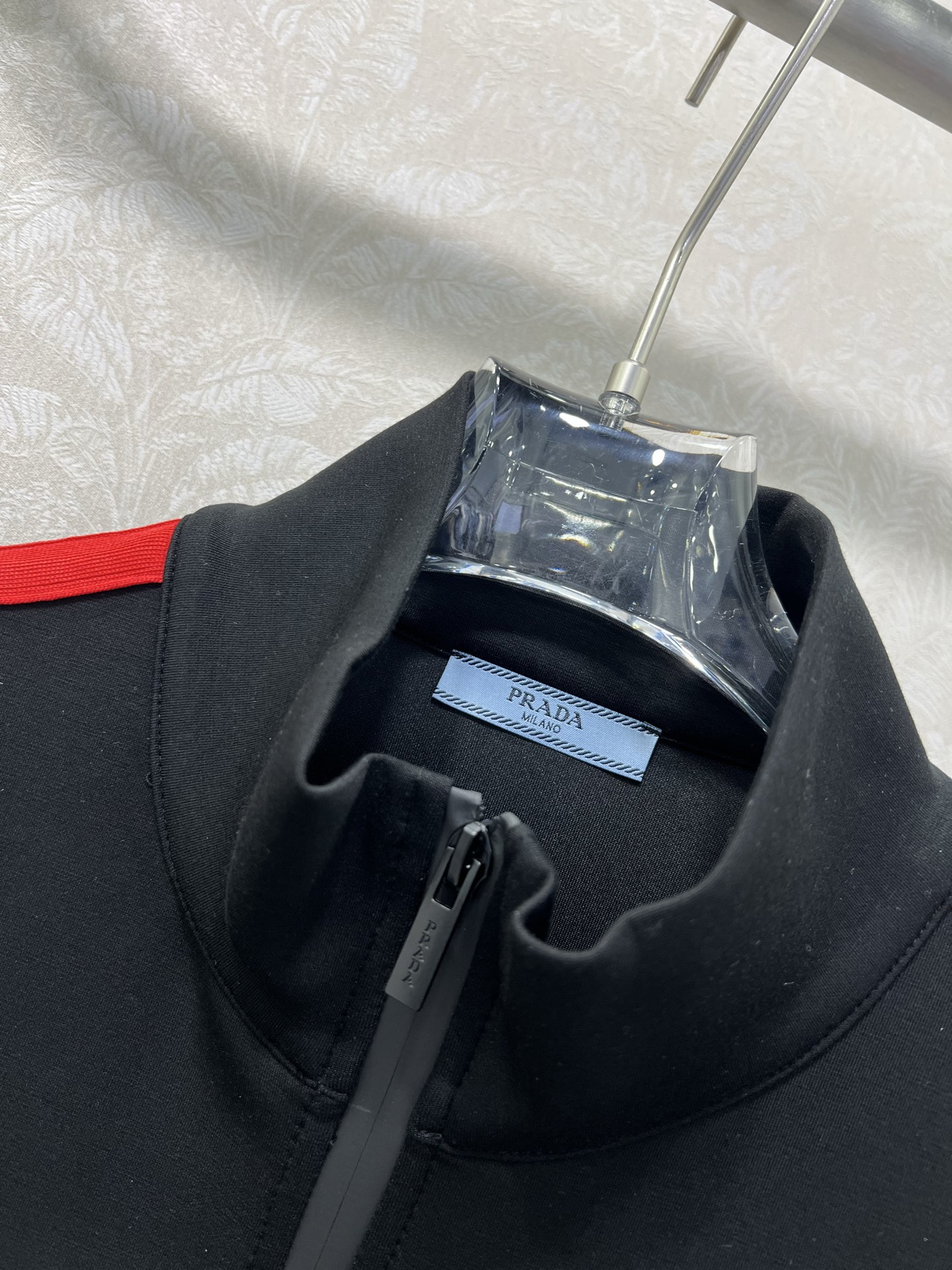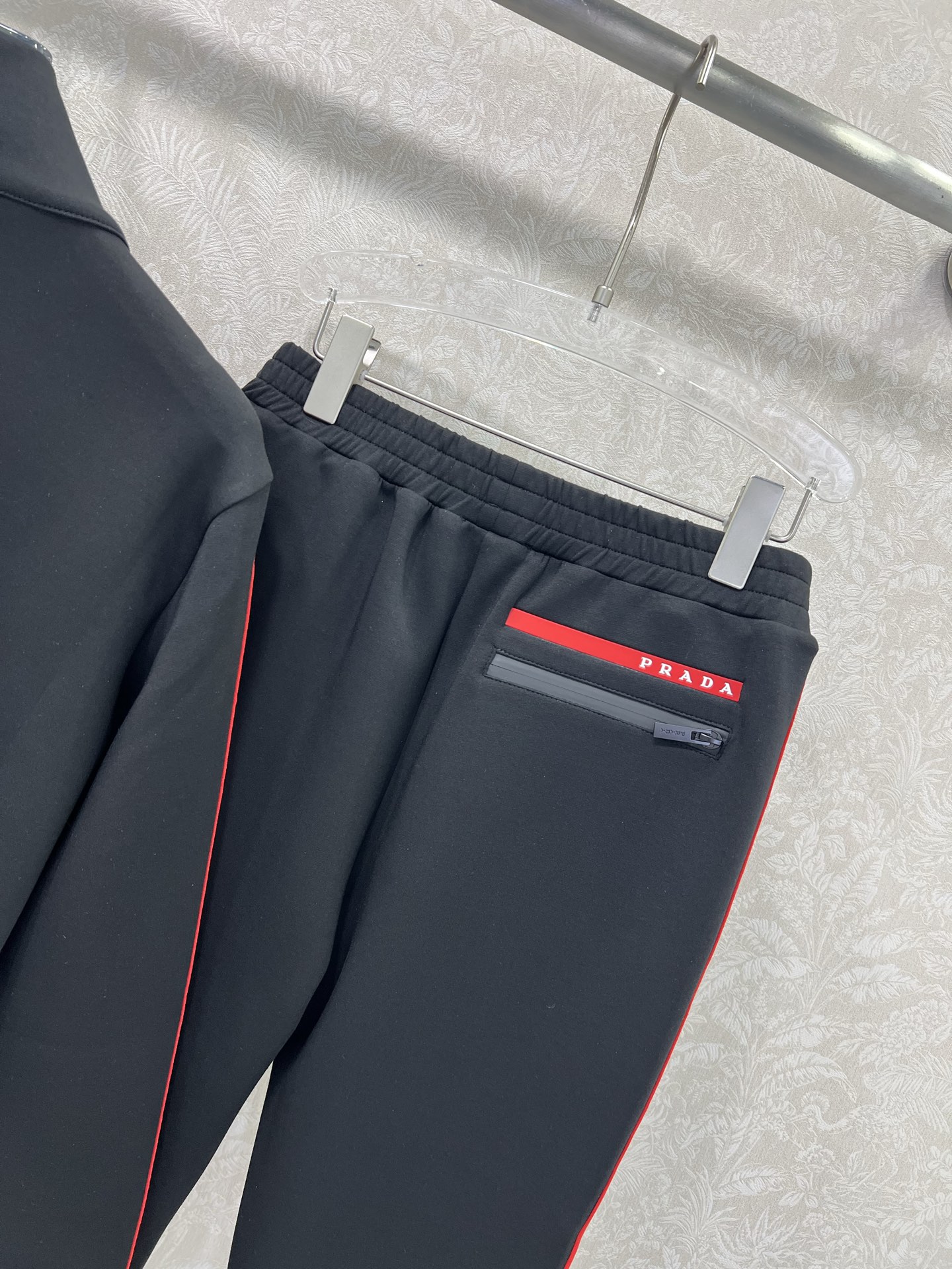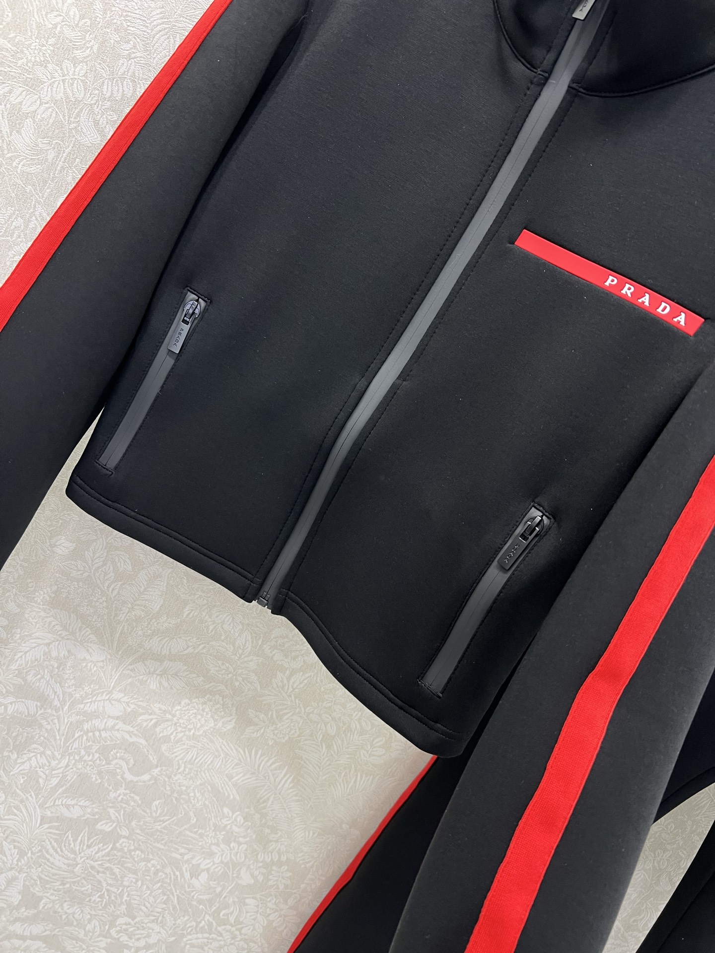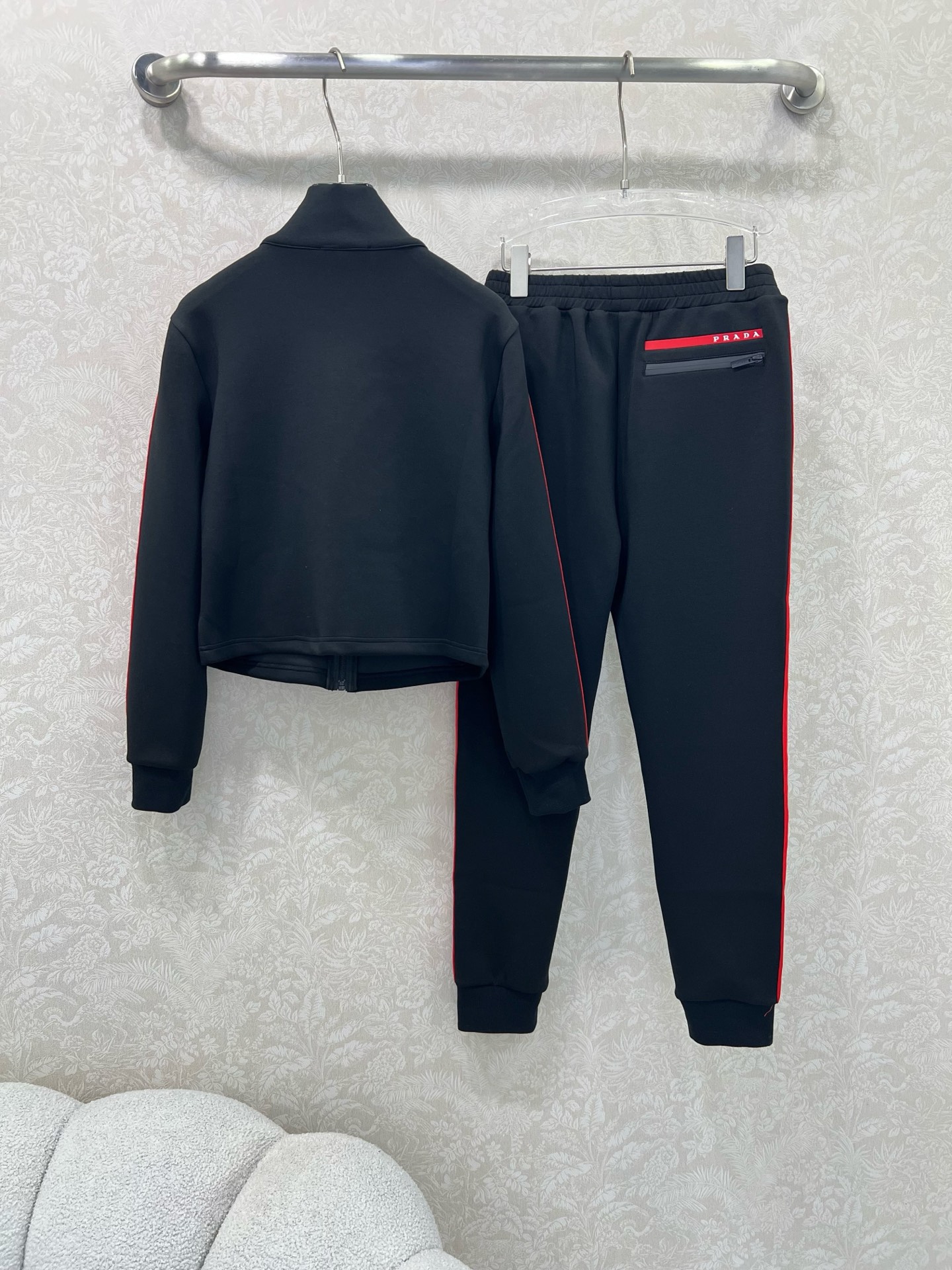 Details: Space cotton suit with red logo, featuring black and red color combination, fashionable and warm.