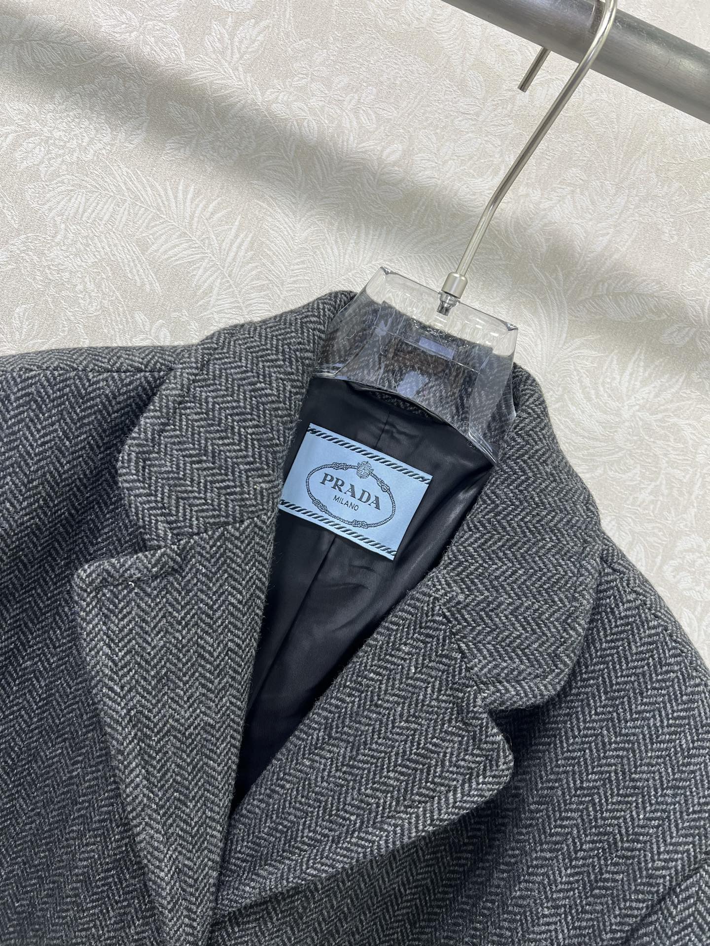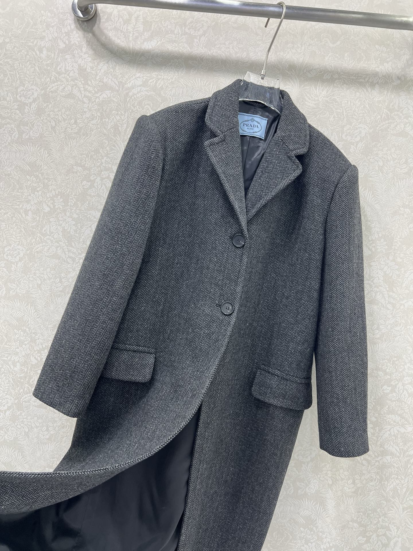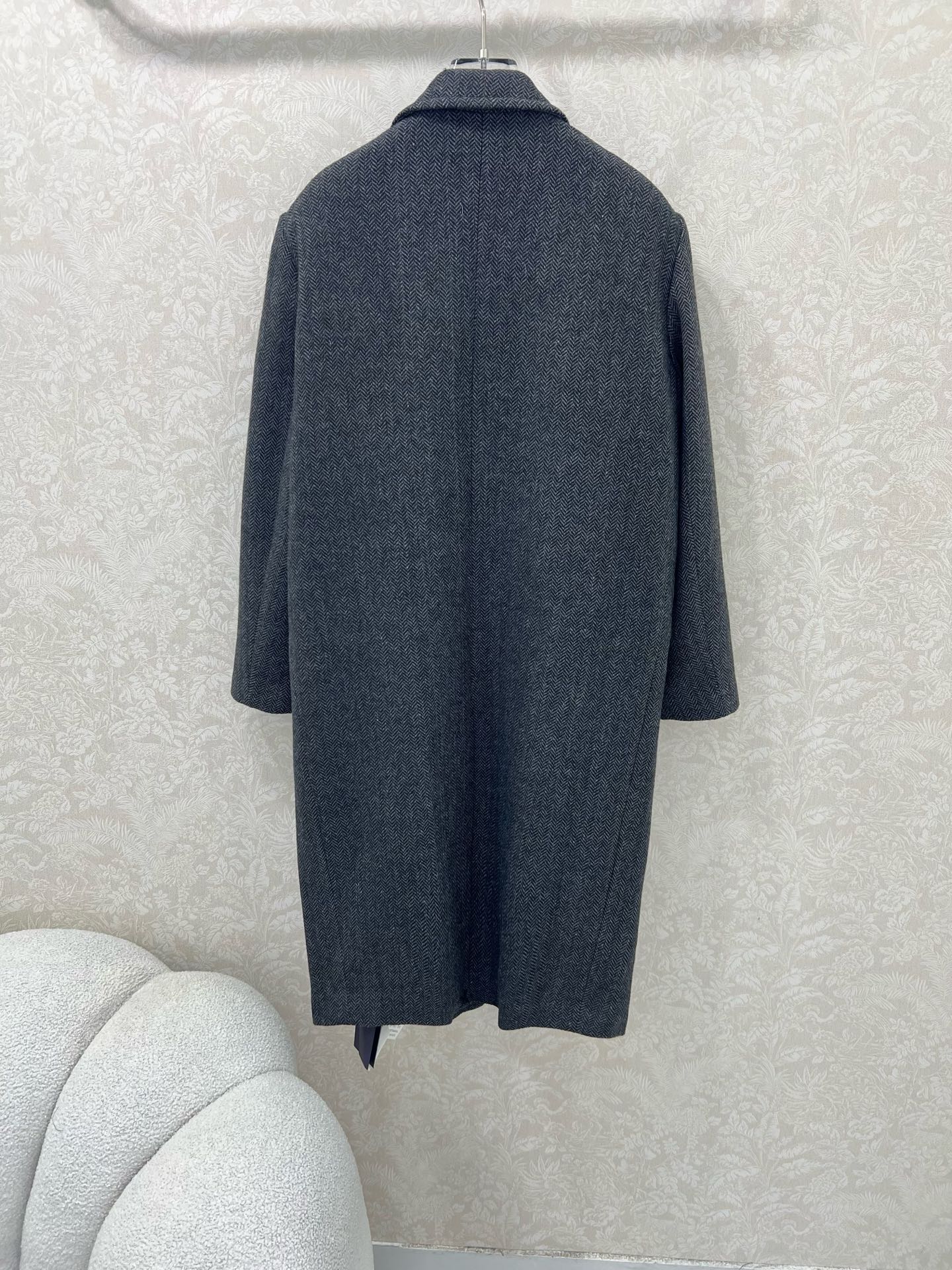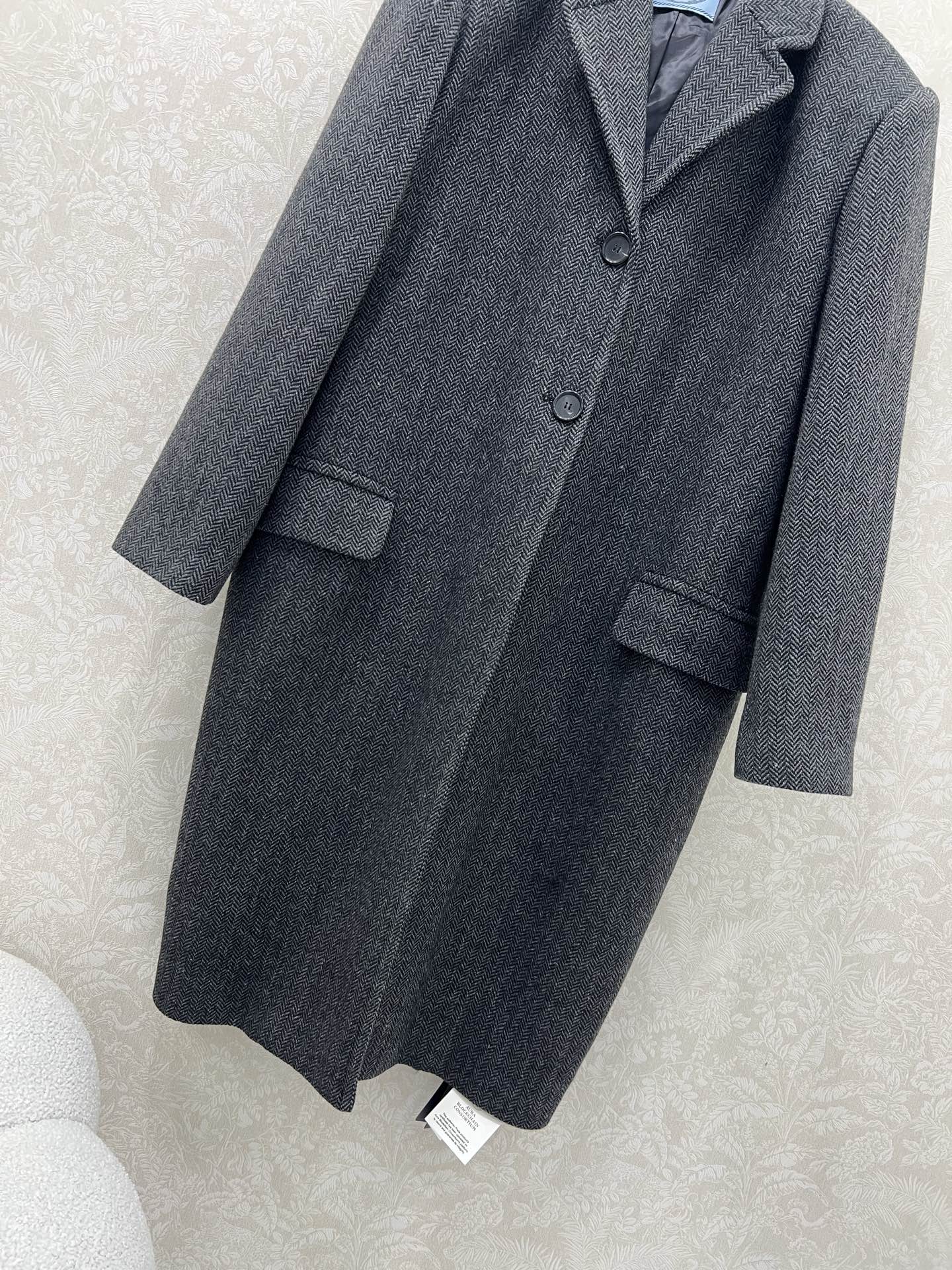 Details: Classic long woolen overcoat with single-row buttons and flap pockets, H-shaped, in classic gray-black. High-end customization, fine workmanship