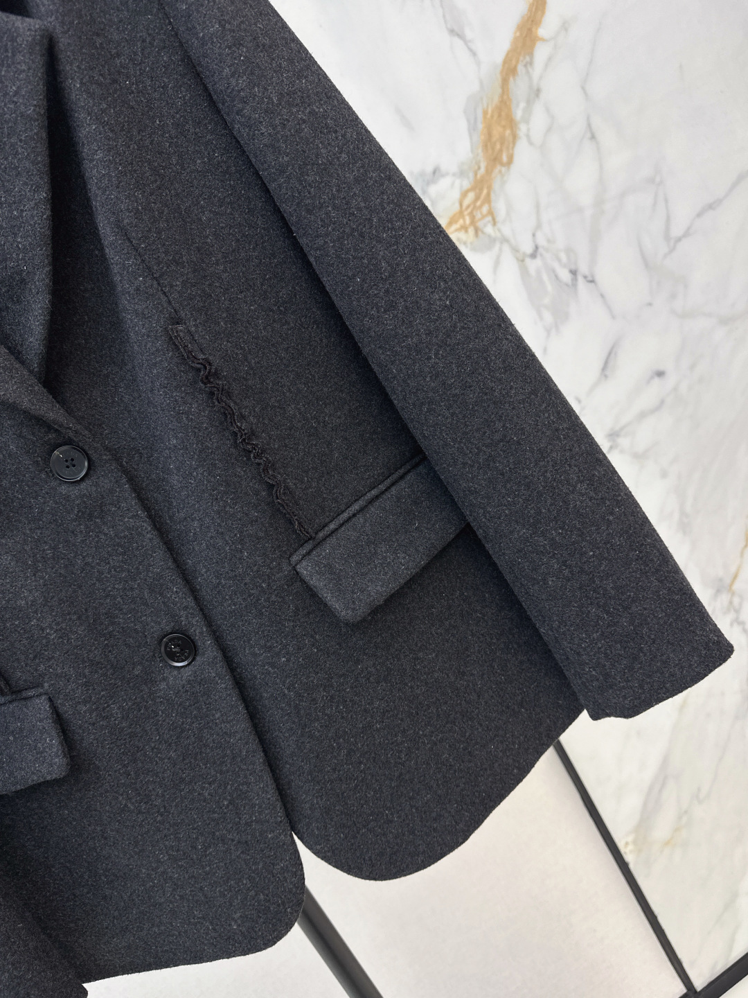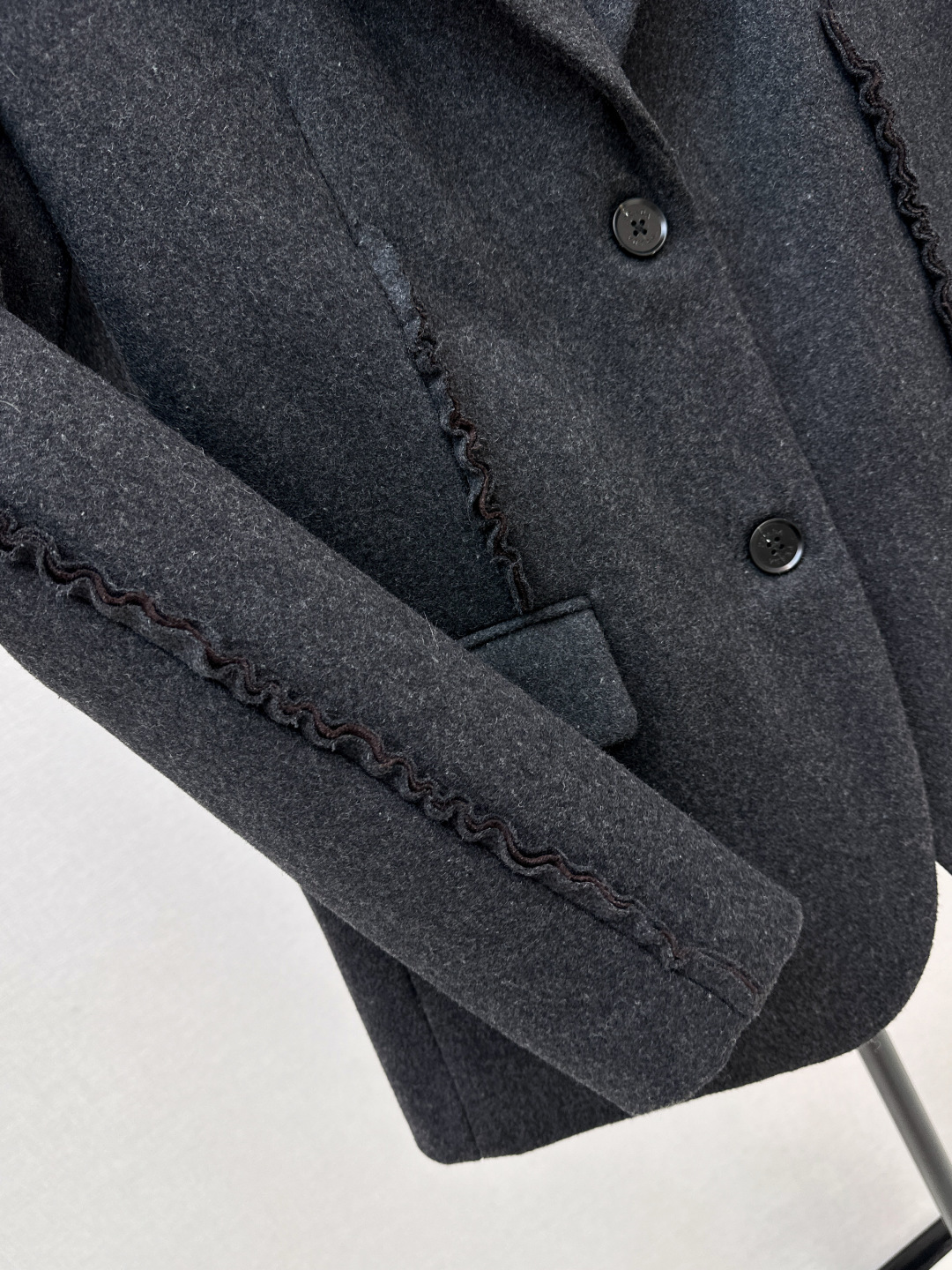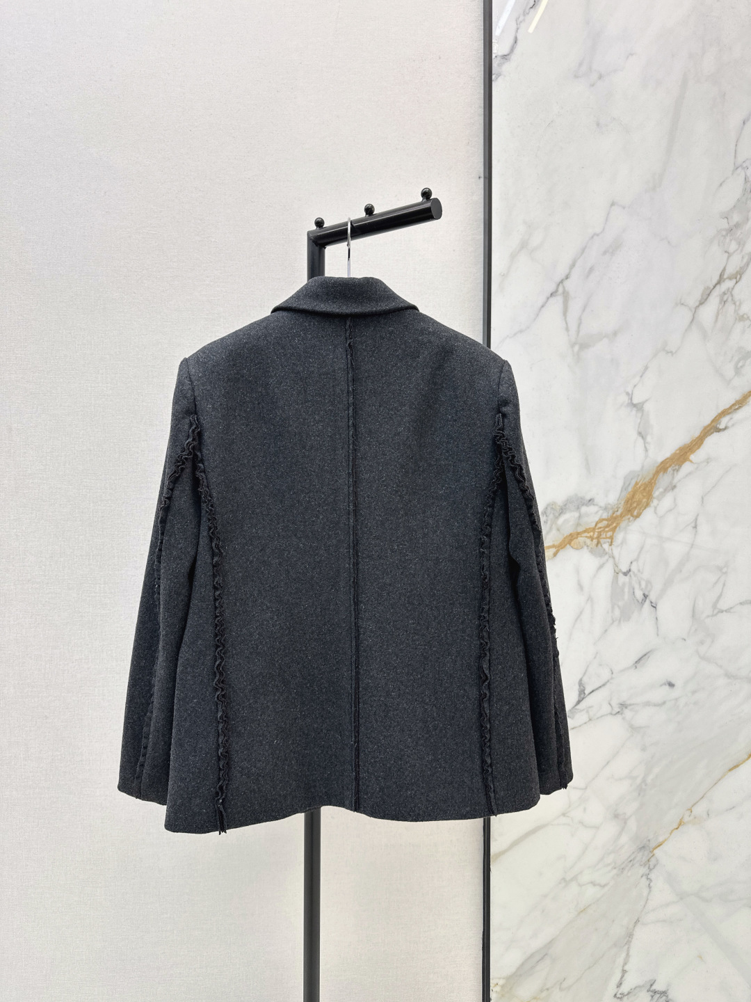 Details: Early spring wool suit with ruffled edges, casual style for layering. One color in stock.