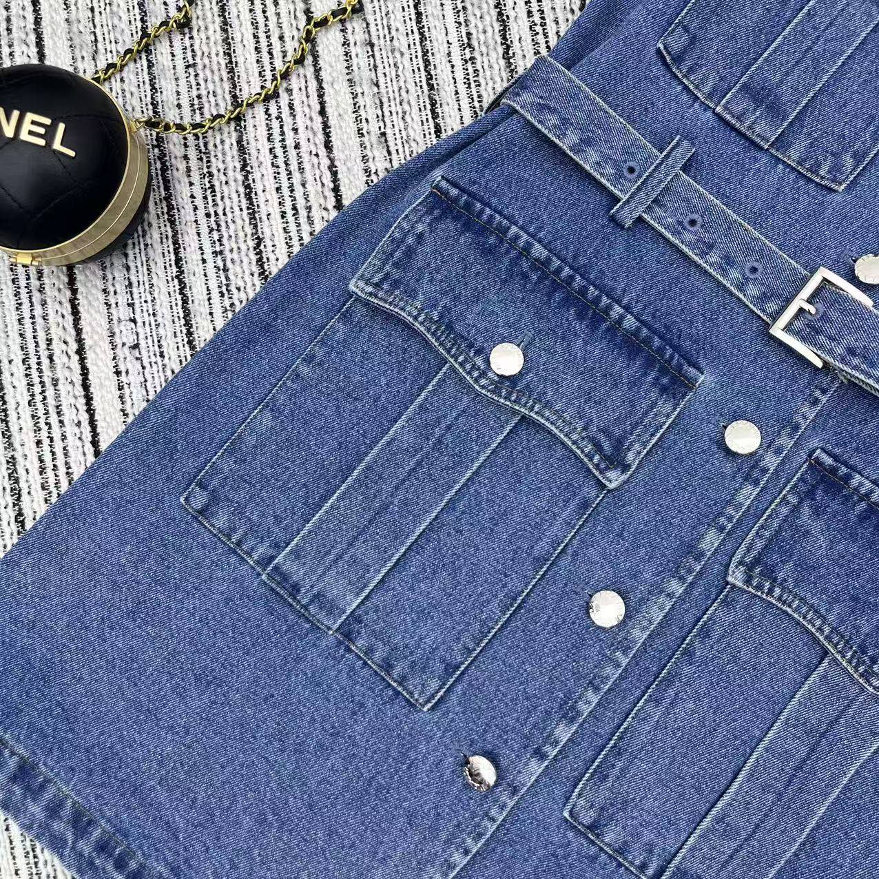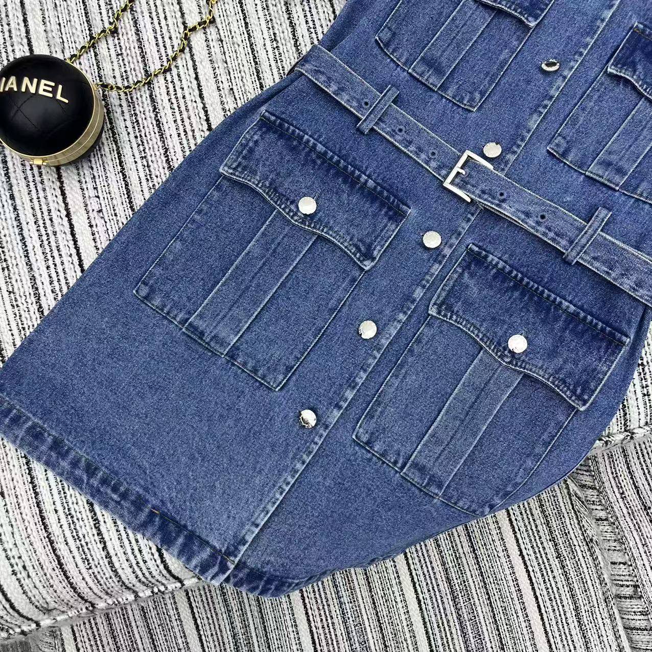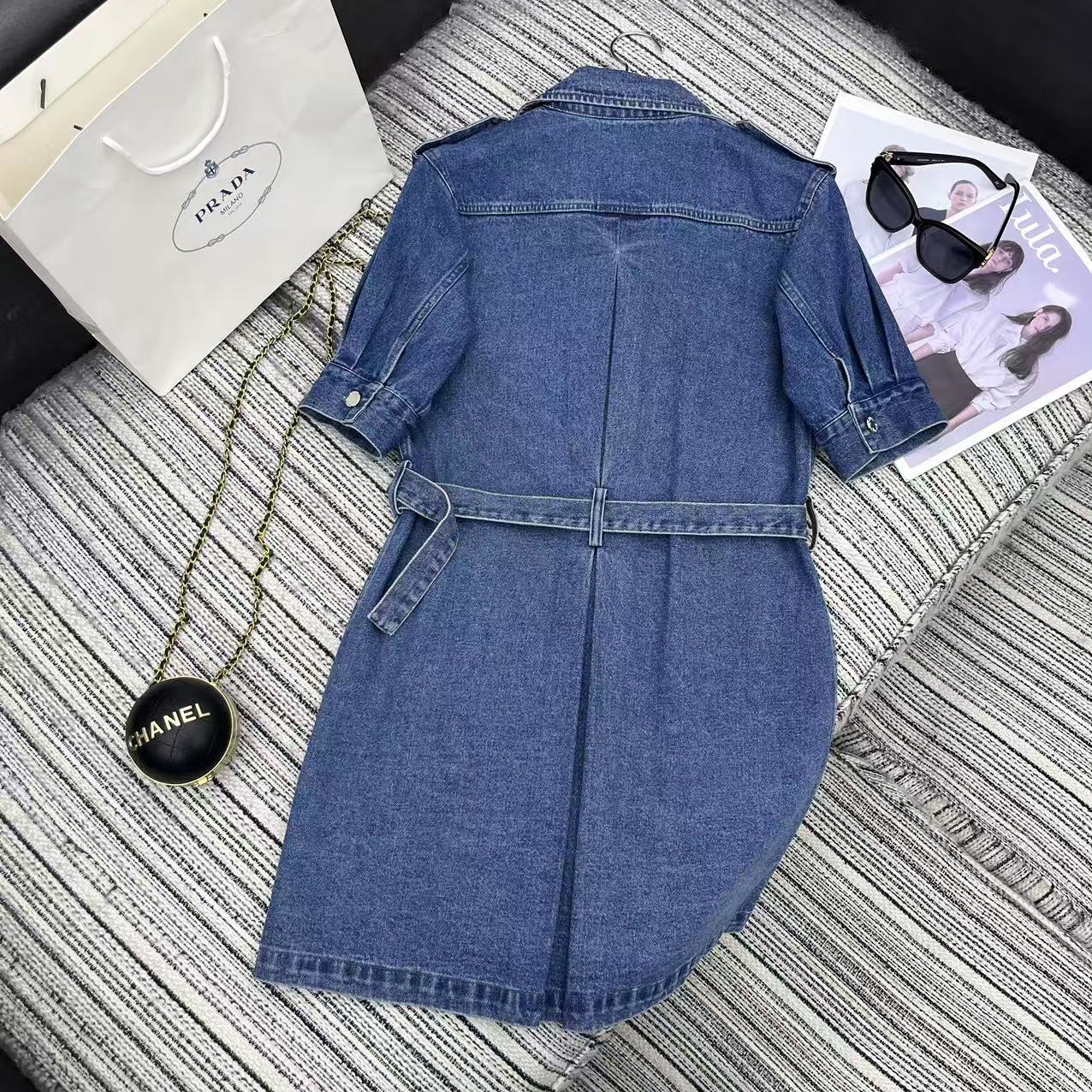 Details: Highly recommended early spring-summer work-style denim dress with classic inverted triangle logo, belted waist