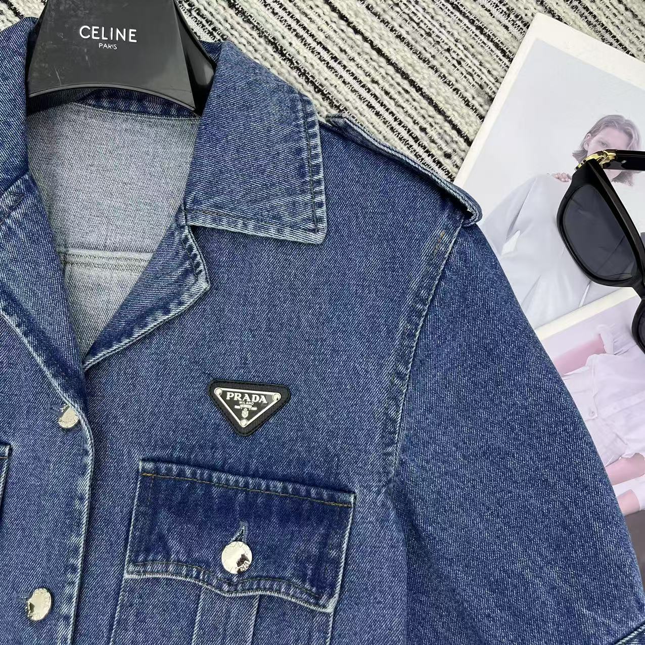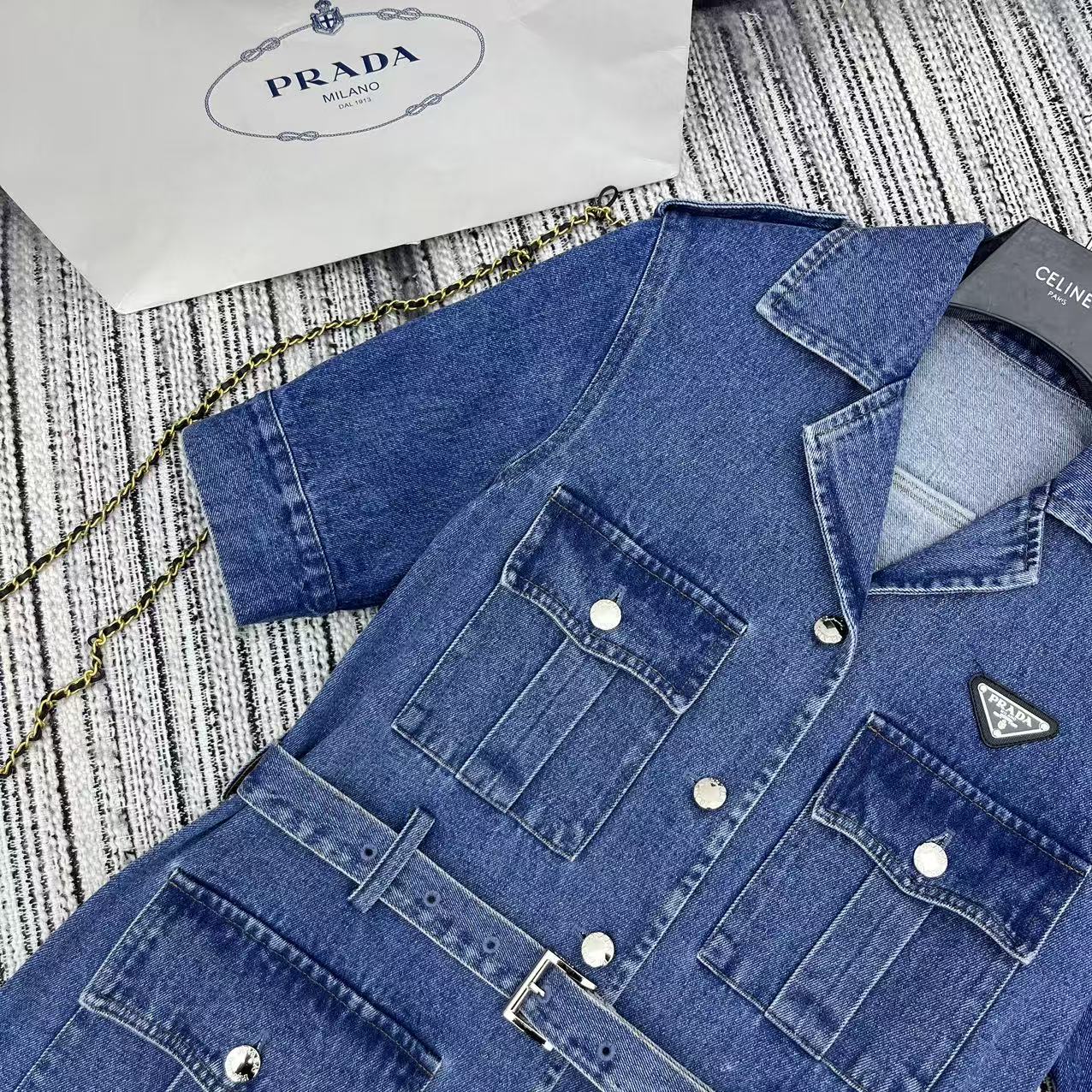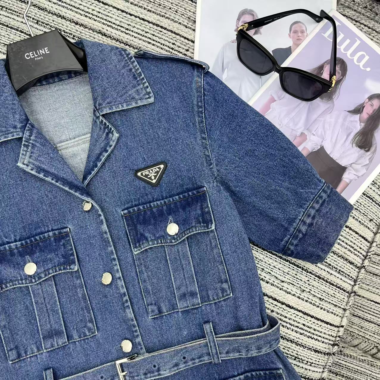 Details: Highly recommended early spring-summer work-style denim dress with classic inverted triangle logo, belted waist