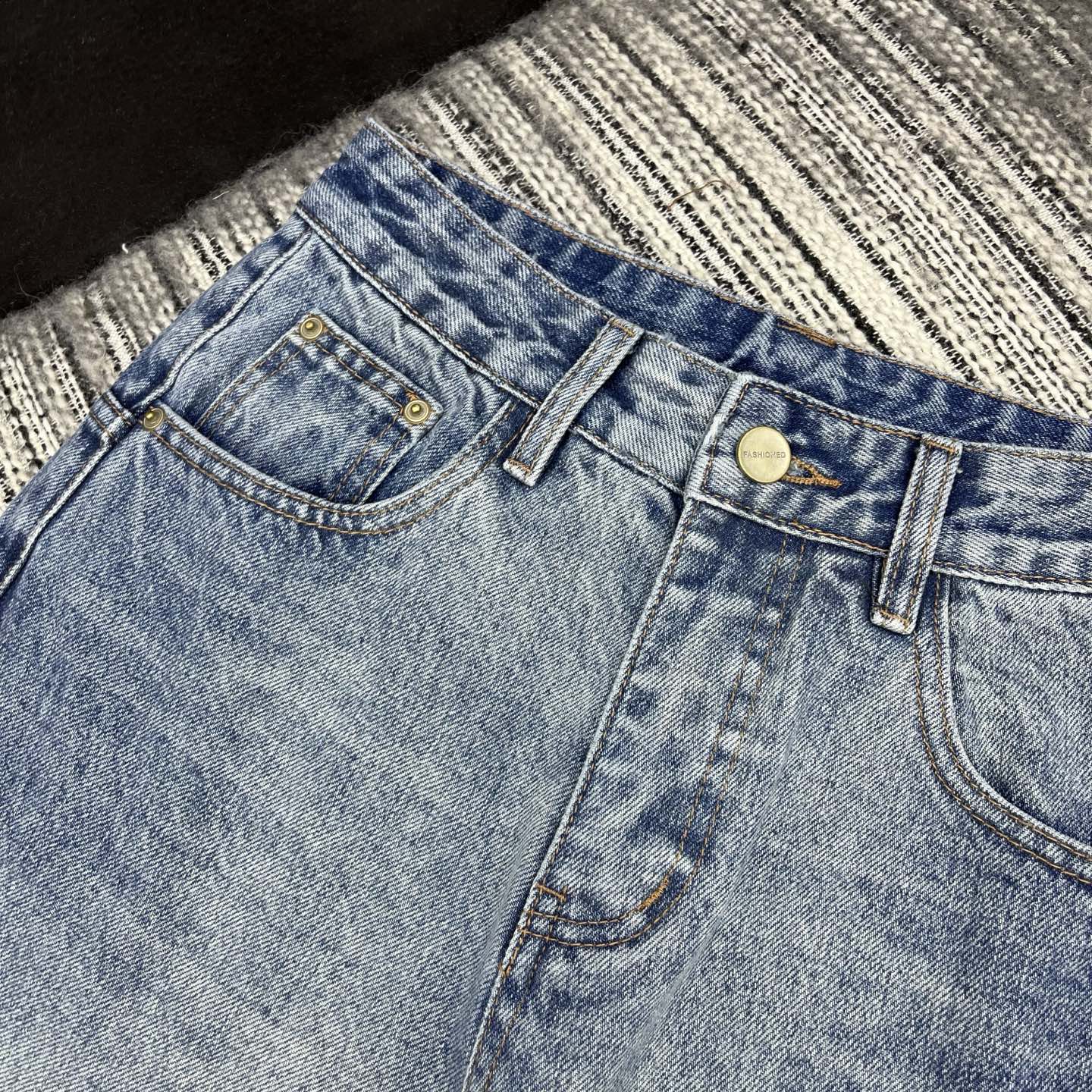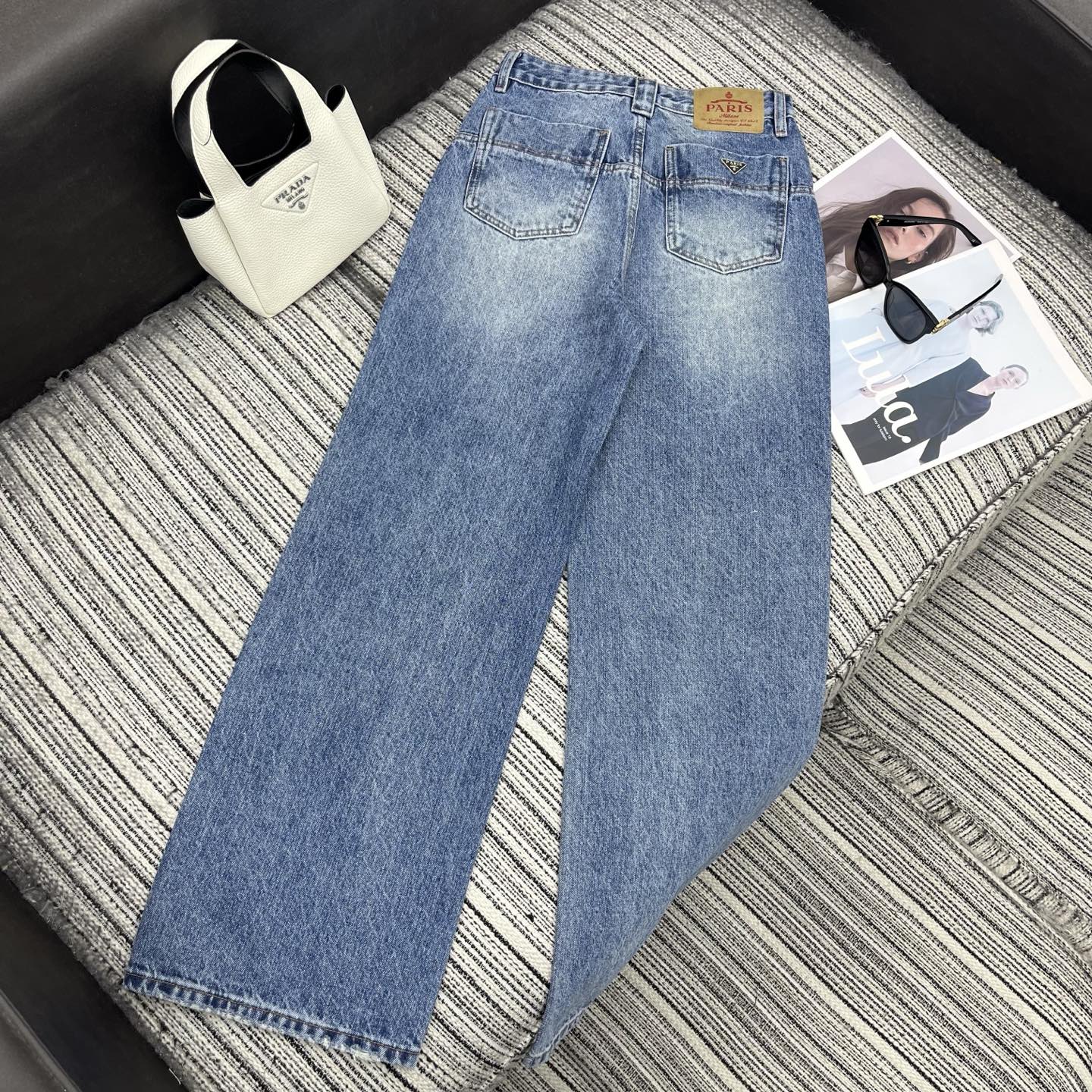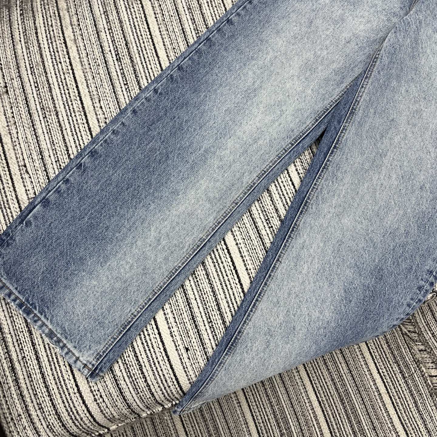Details: Highly recommended. New denim wide-leg pants with a classic inverted triangle logo pocket, having a great wash color.