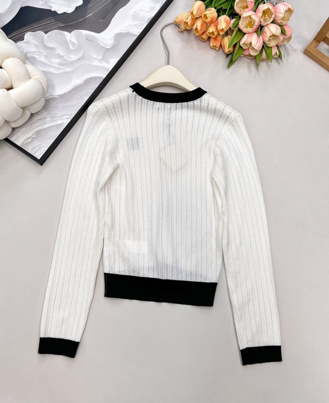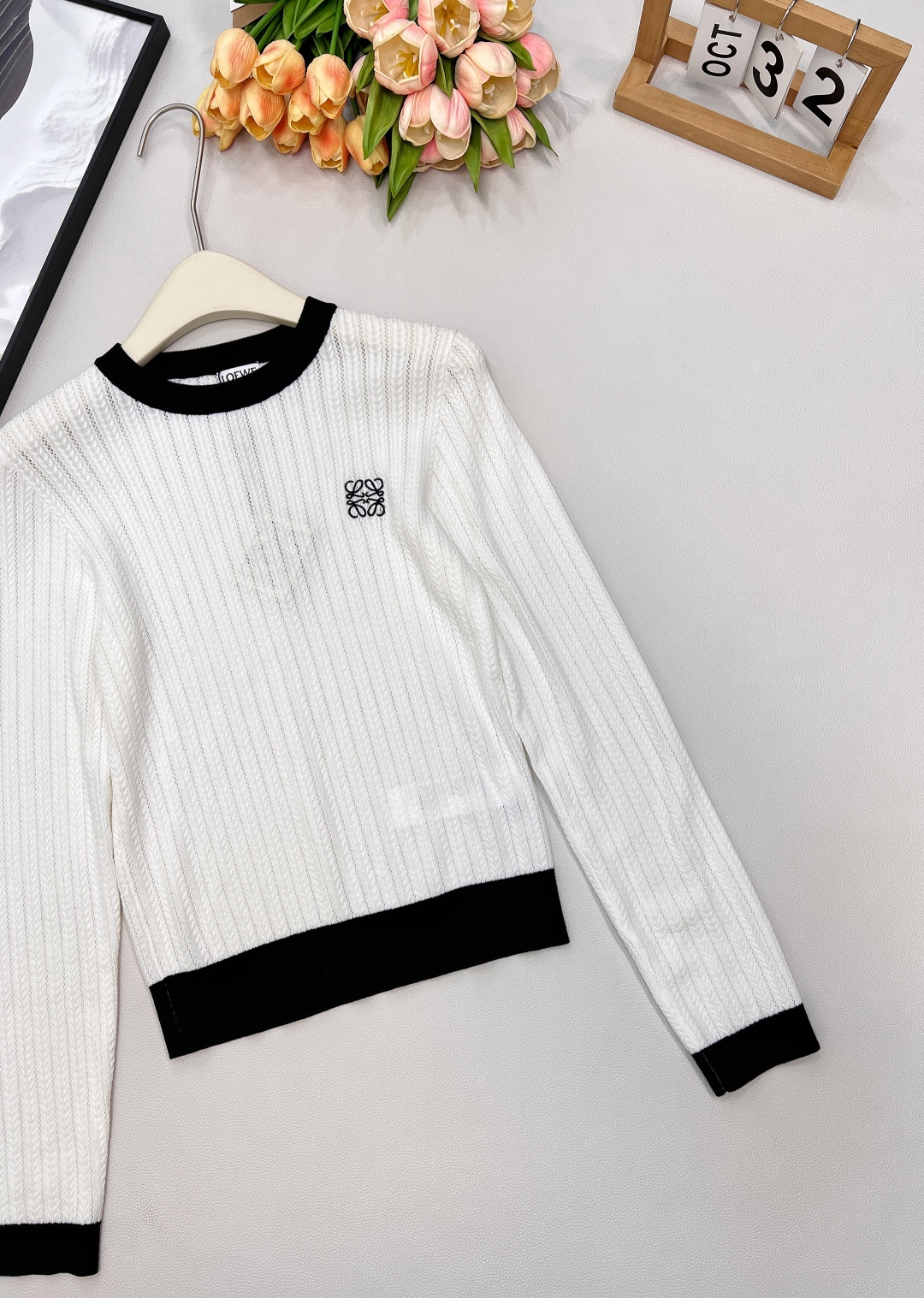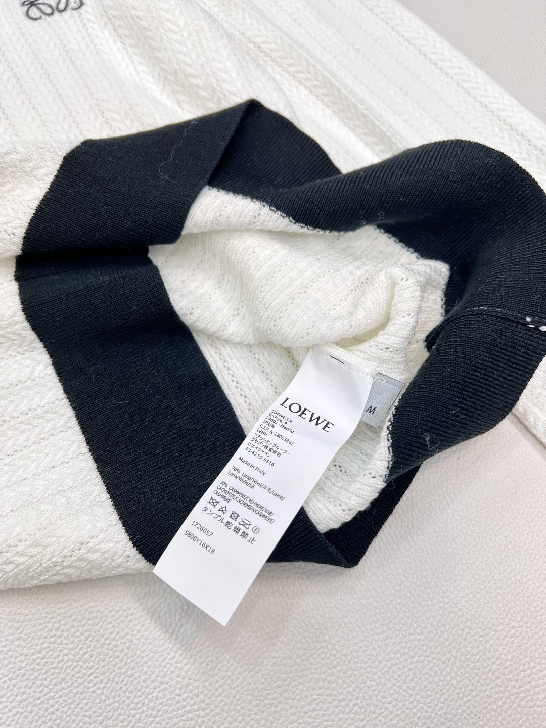 Details: Black and white color-blocked knitted sweater with logo, soft and adaptable for various styles.