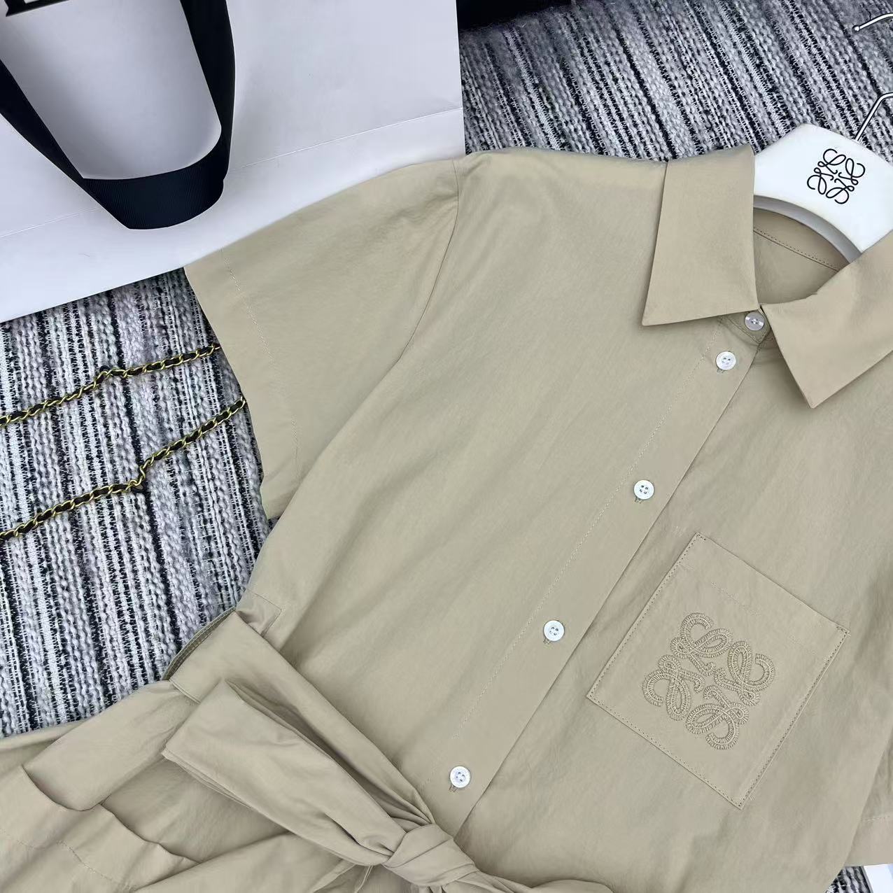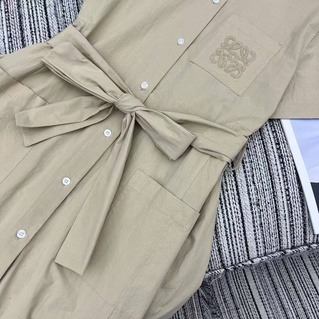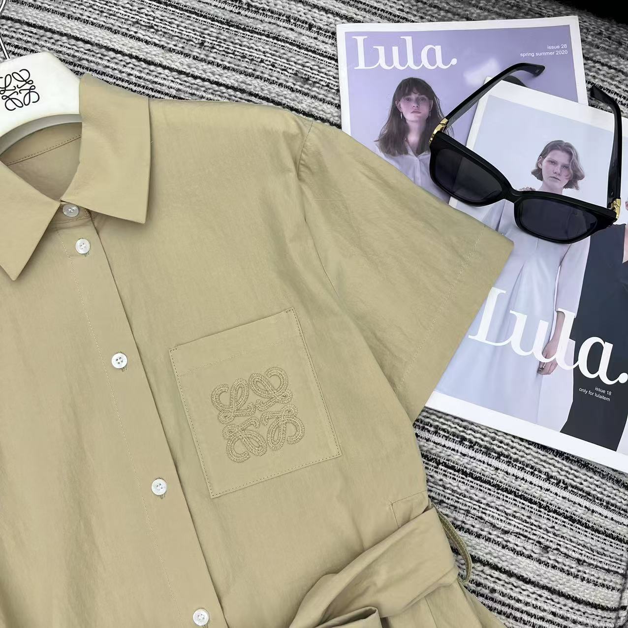 Details: Spring-summer collared short-sleeved shirt dress with irregular hem, embroidered logo pocket, belted waist, high-end customization, fine workmanship