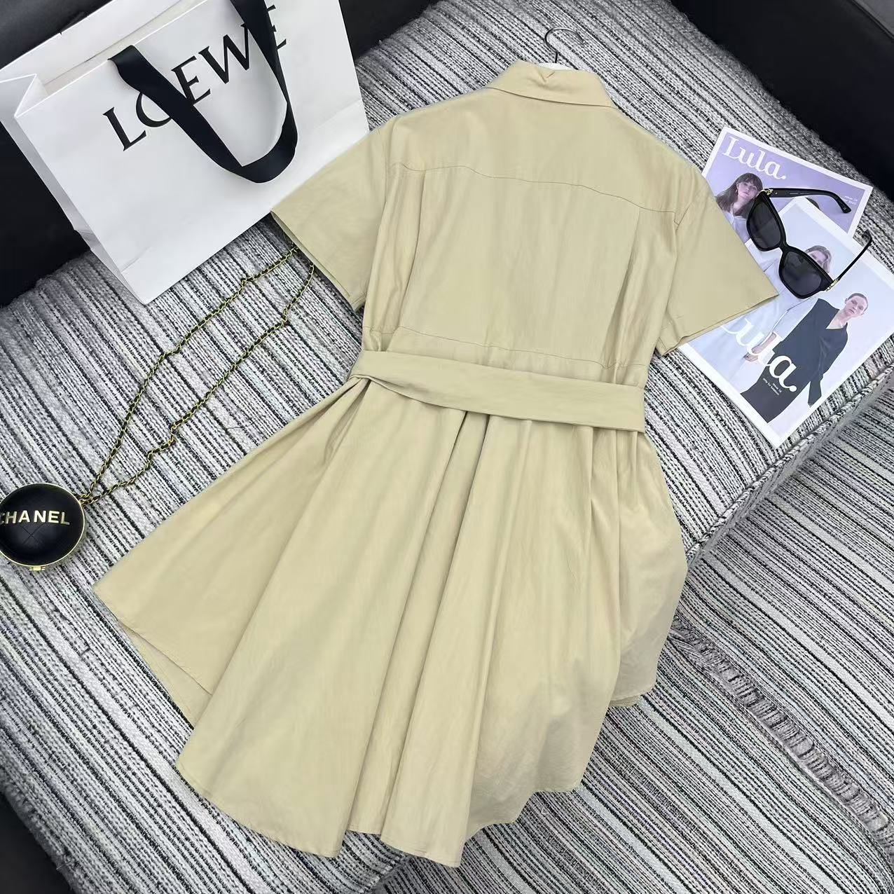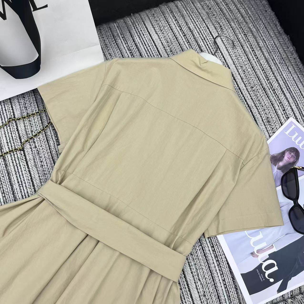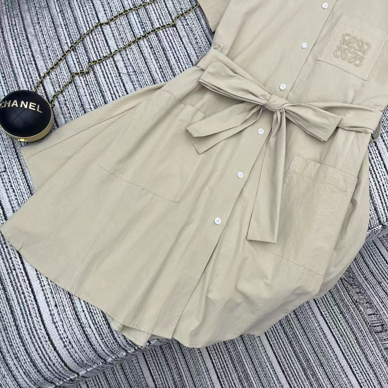 Details: Spring-summer collared short-sleeved shirt dress with irregular hem, embroidered logo pocket, belted waist, high-end customization, fine workmanship