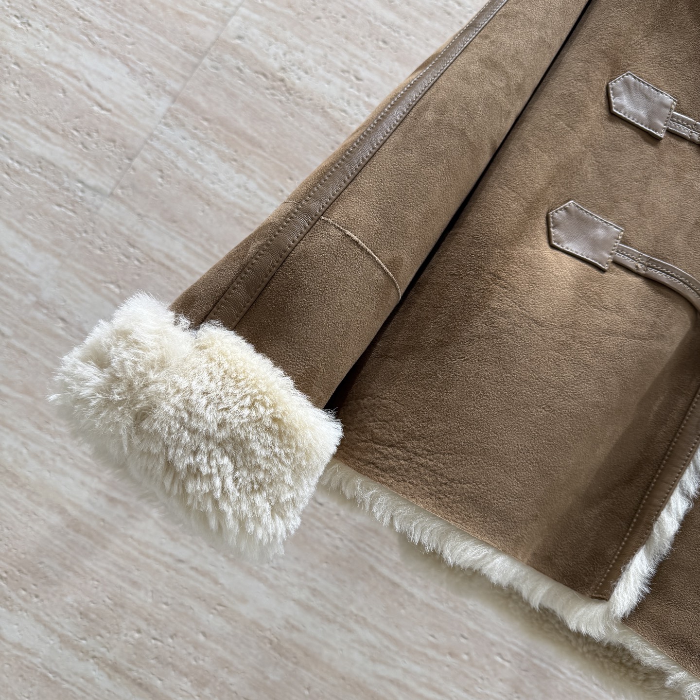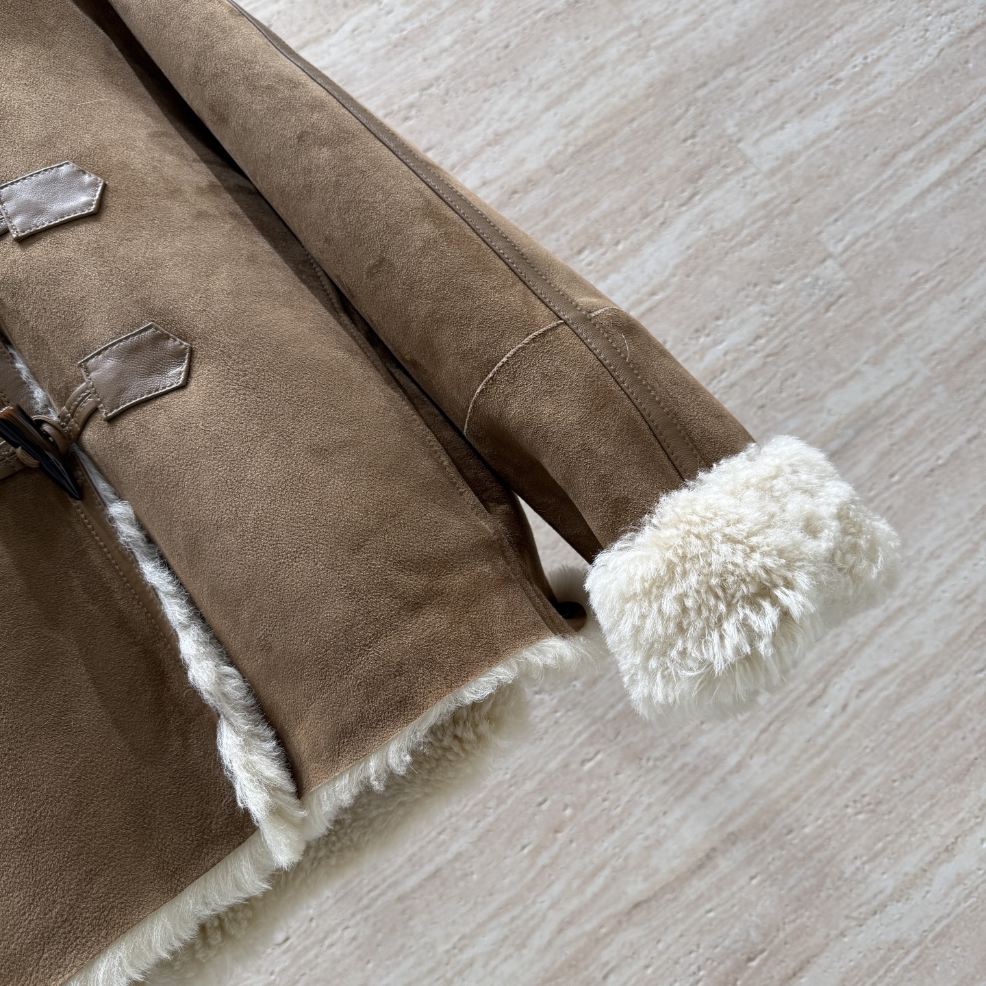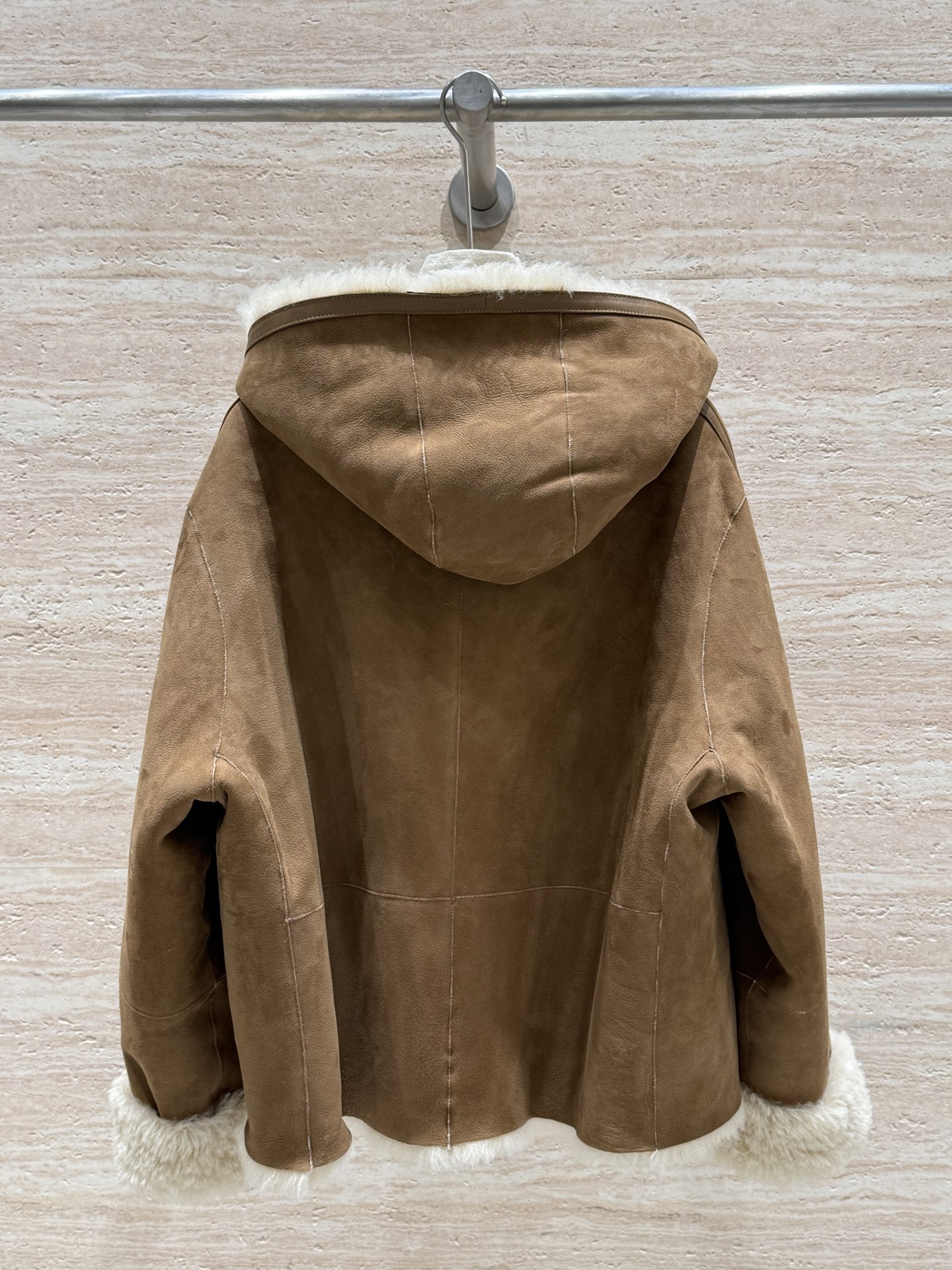 Details: Hooded fur coat with horn buttons, German imported suede, loose fit, size 36 - 42