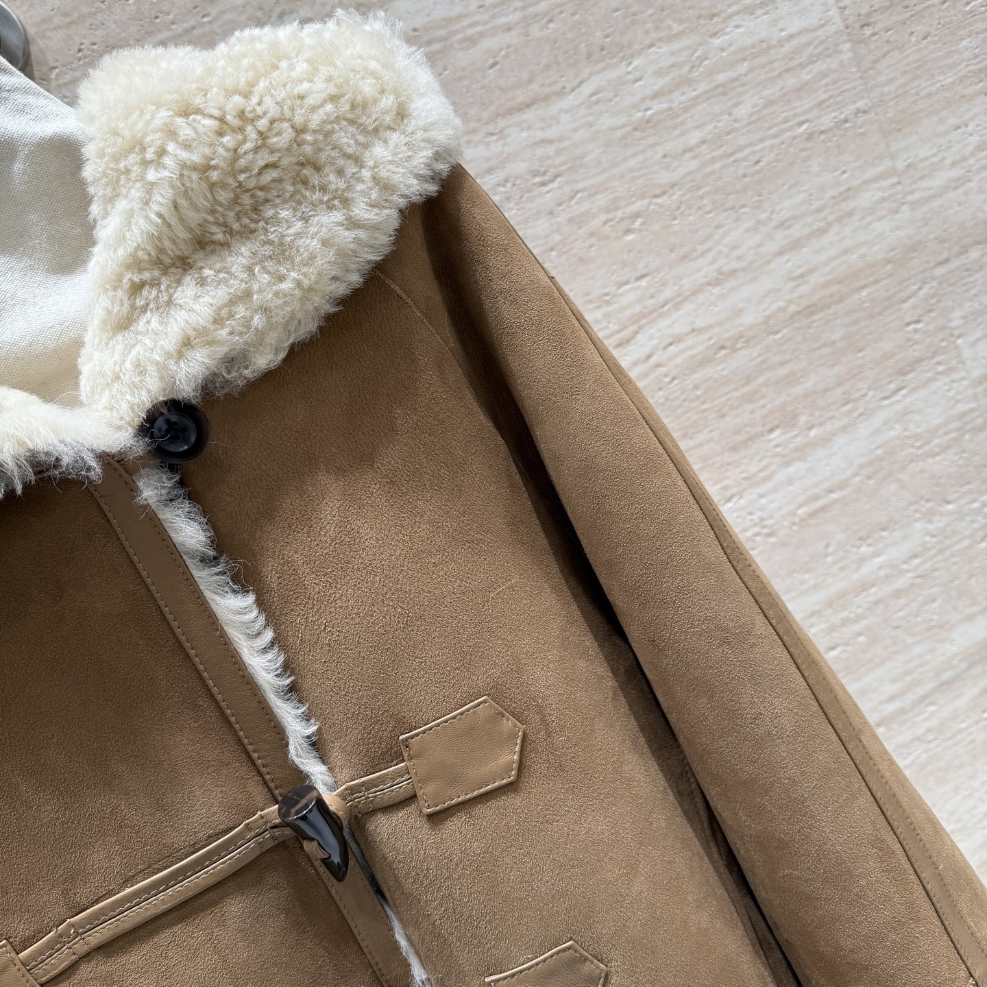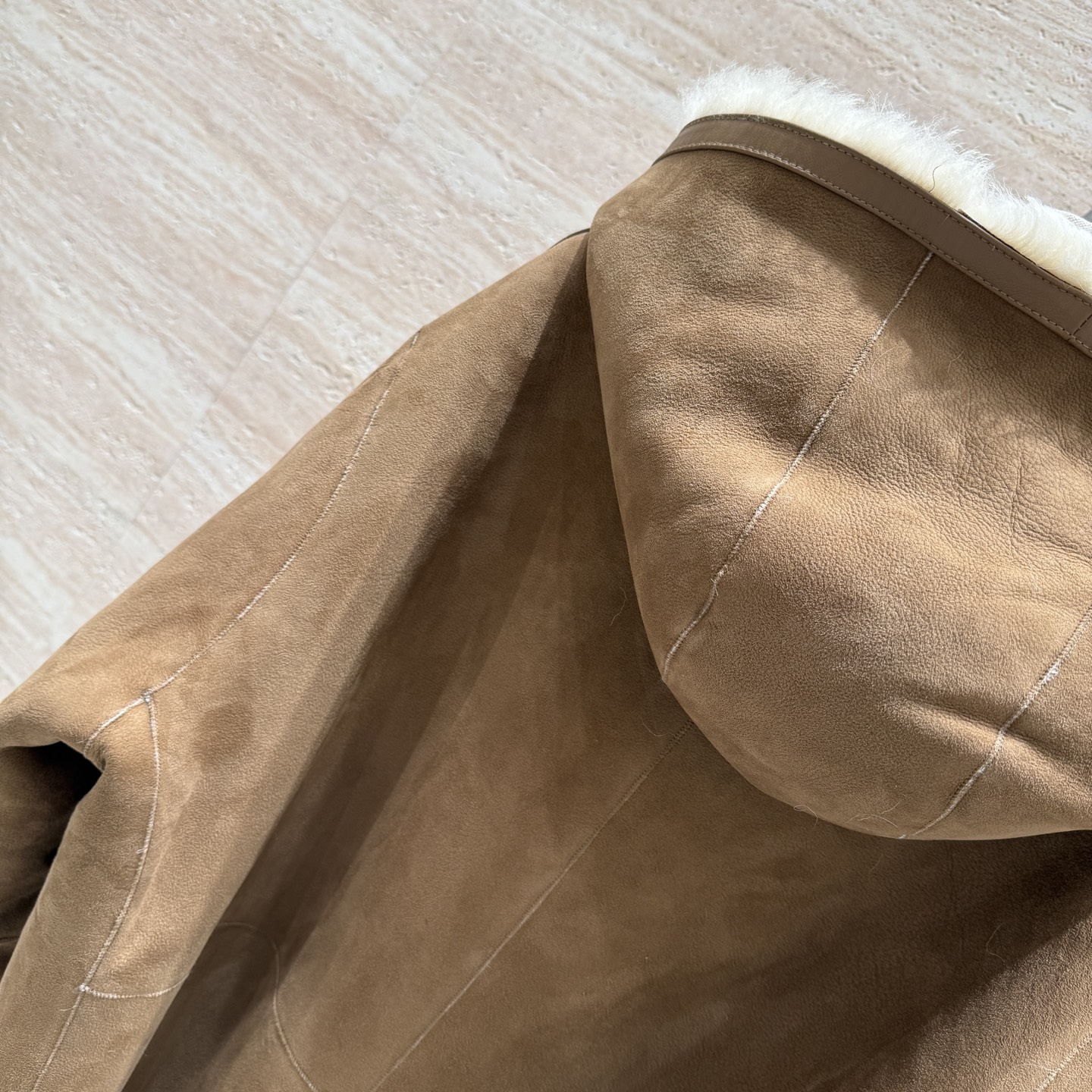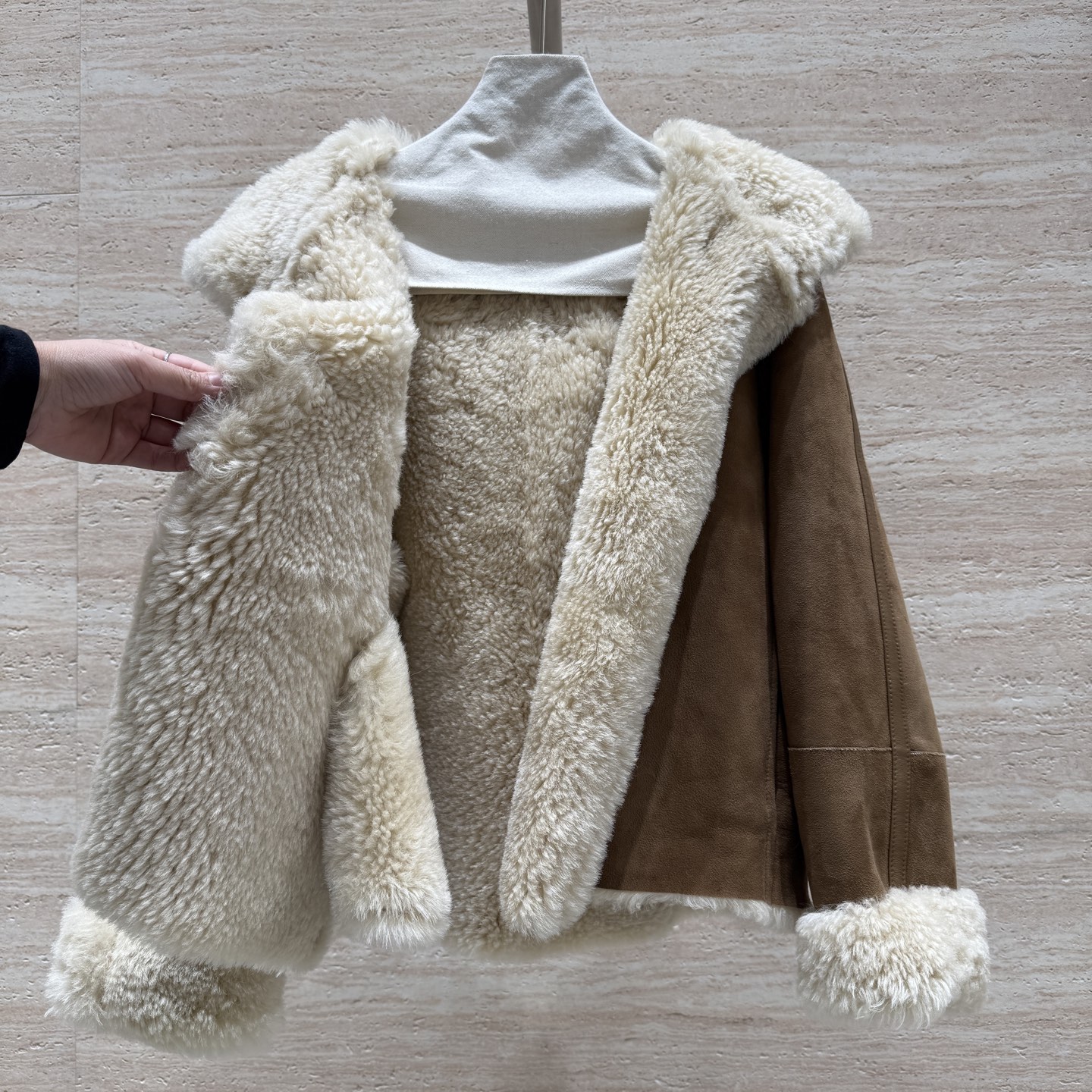 Details: Hooded fur coat with horn buttons, German imported suede, loose fit, size 36 - 42