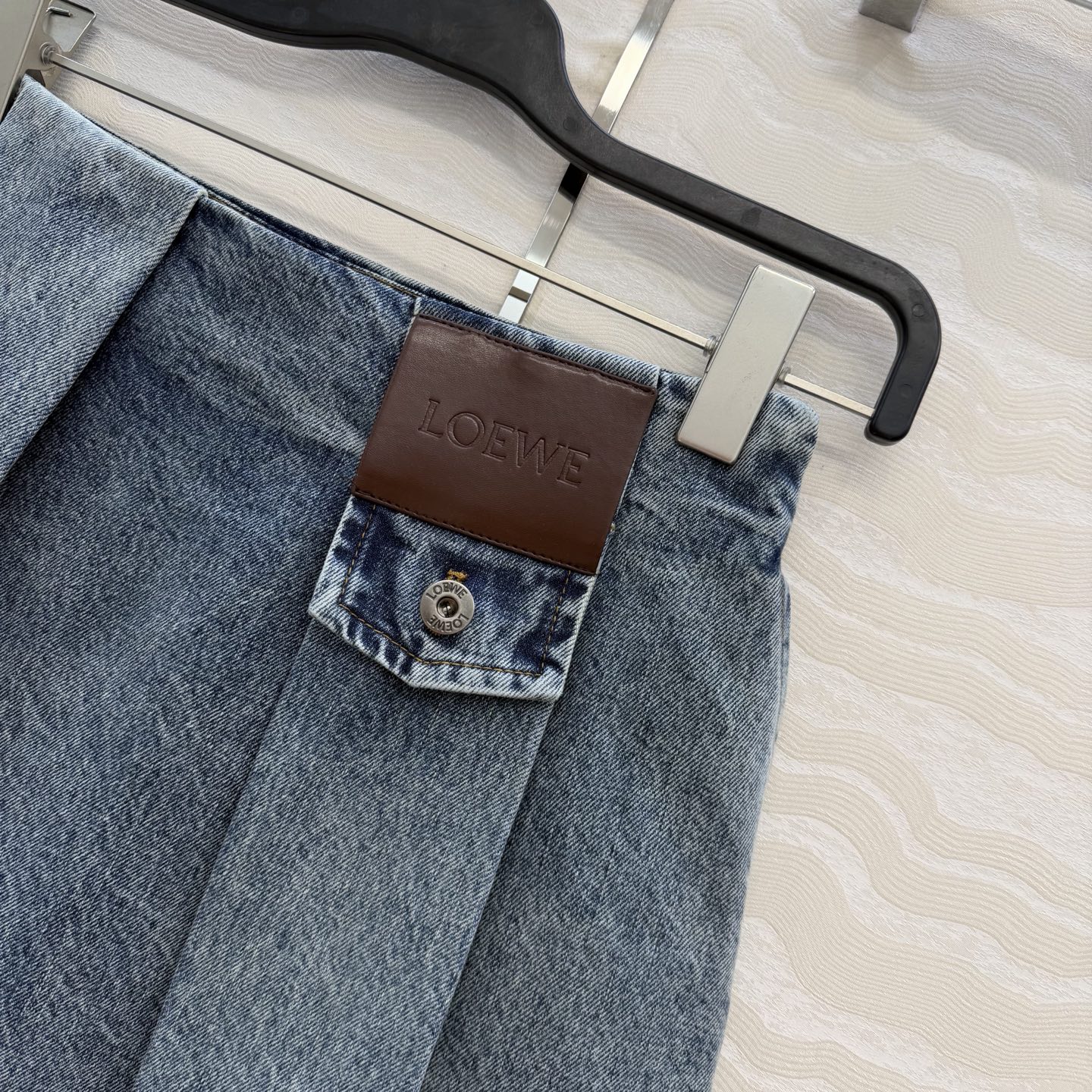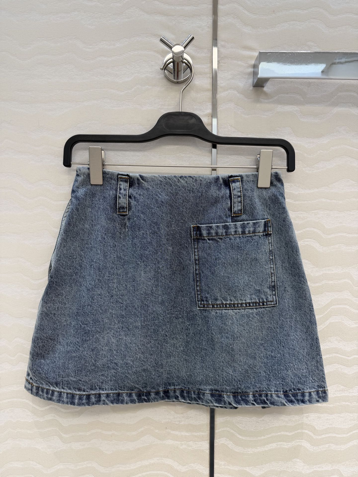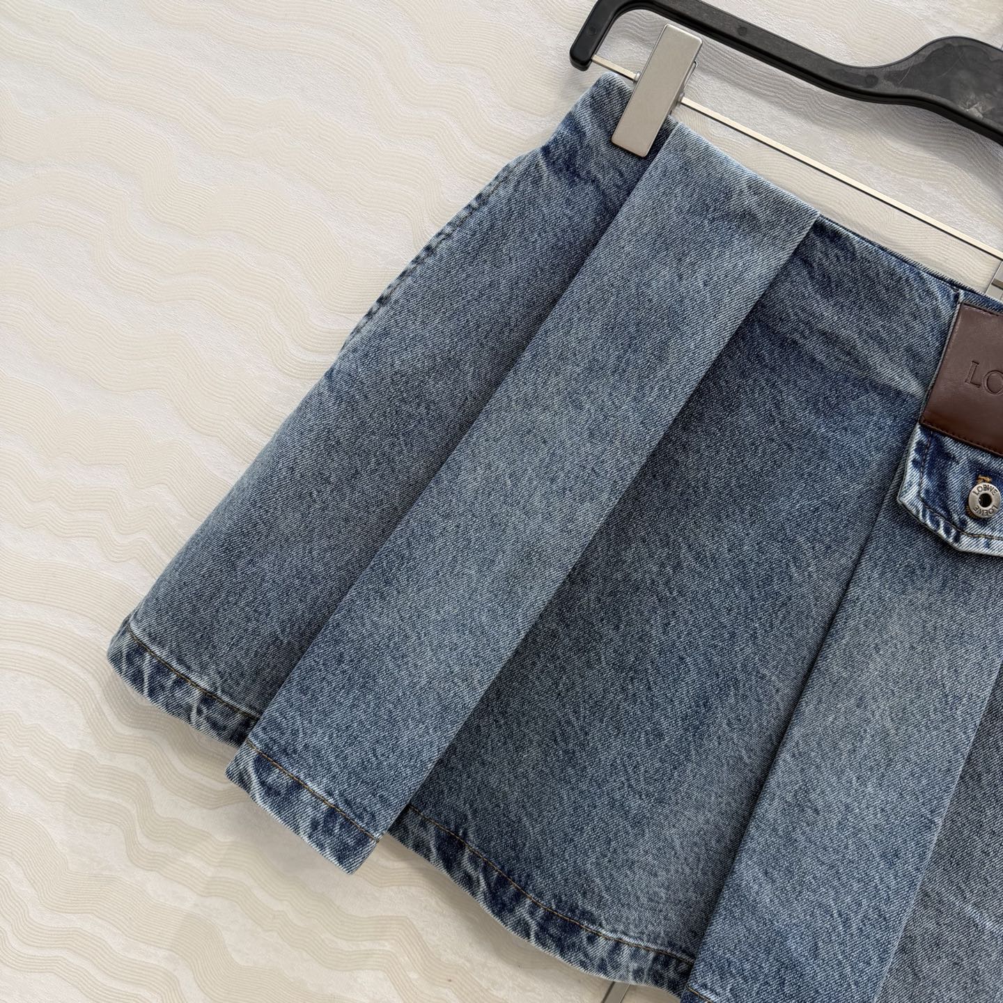 Details: Denim skirt with pleated leather label, enzyme wash, versatile and stylish, high-end customization, fine workmanship
