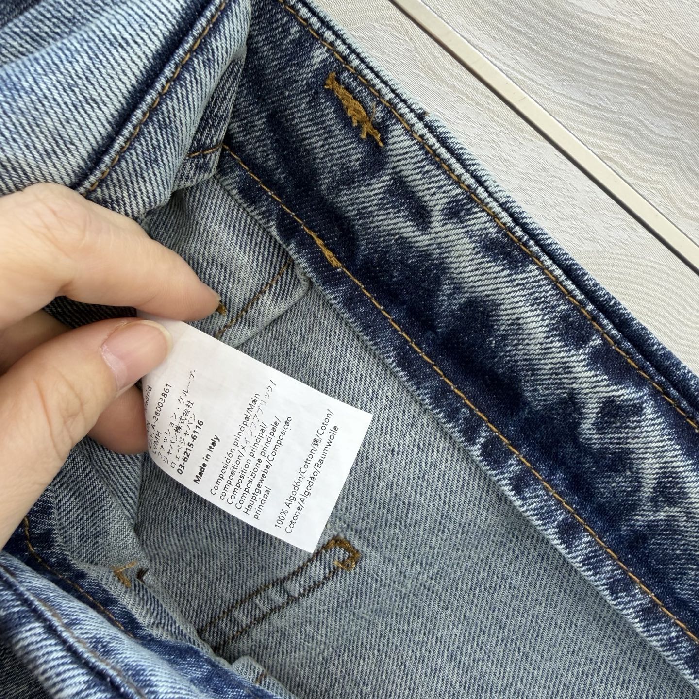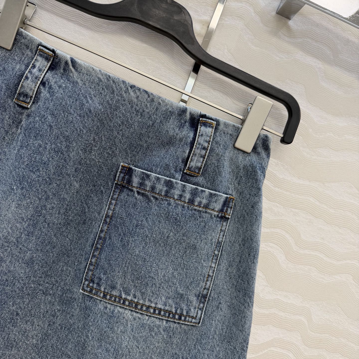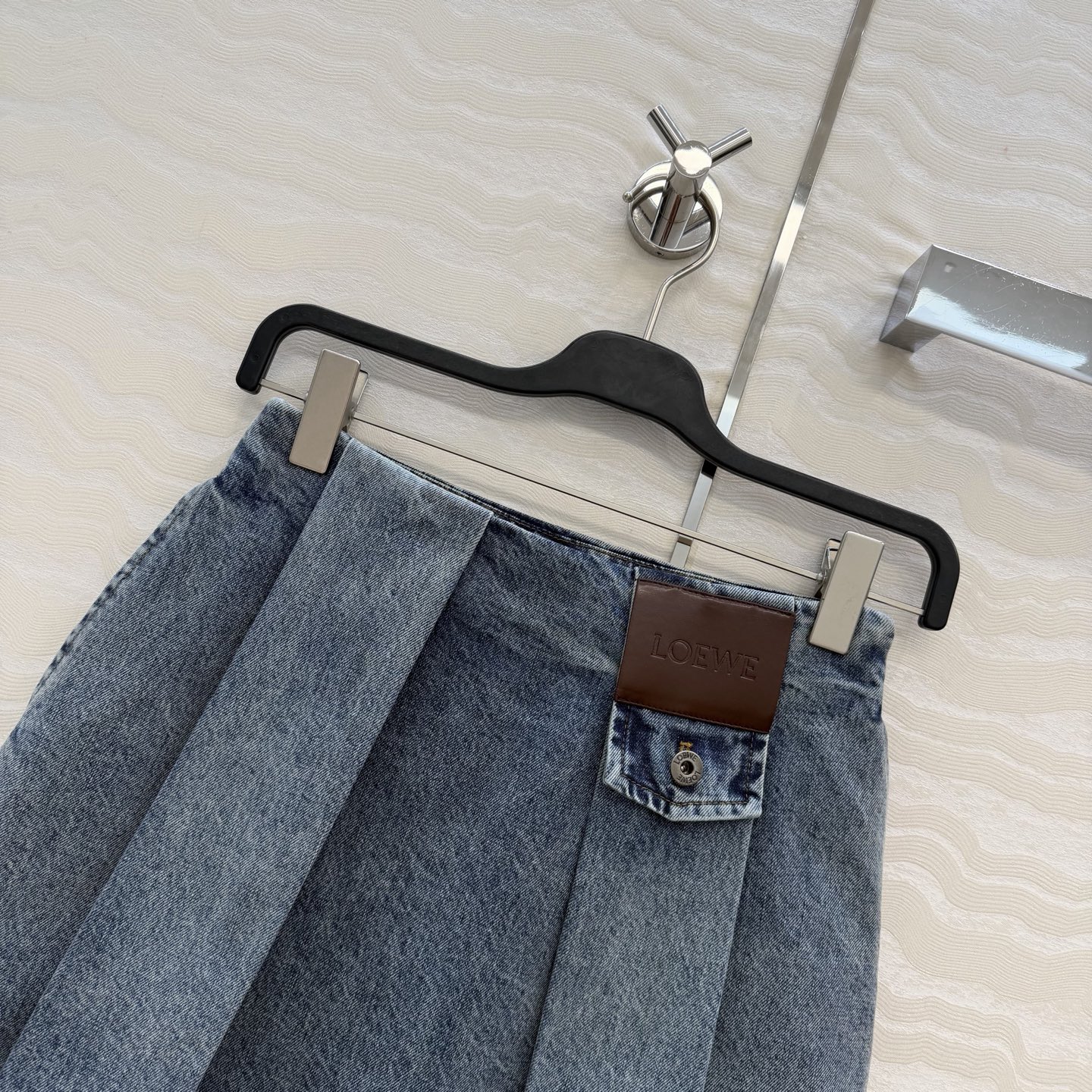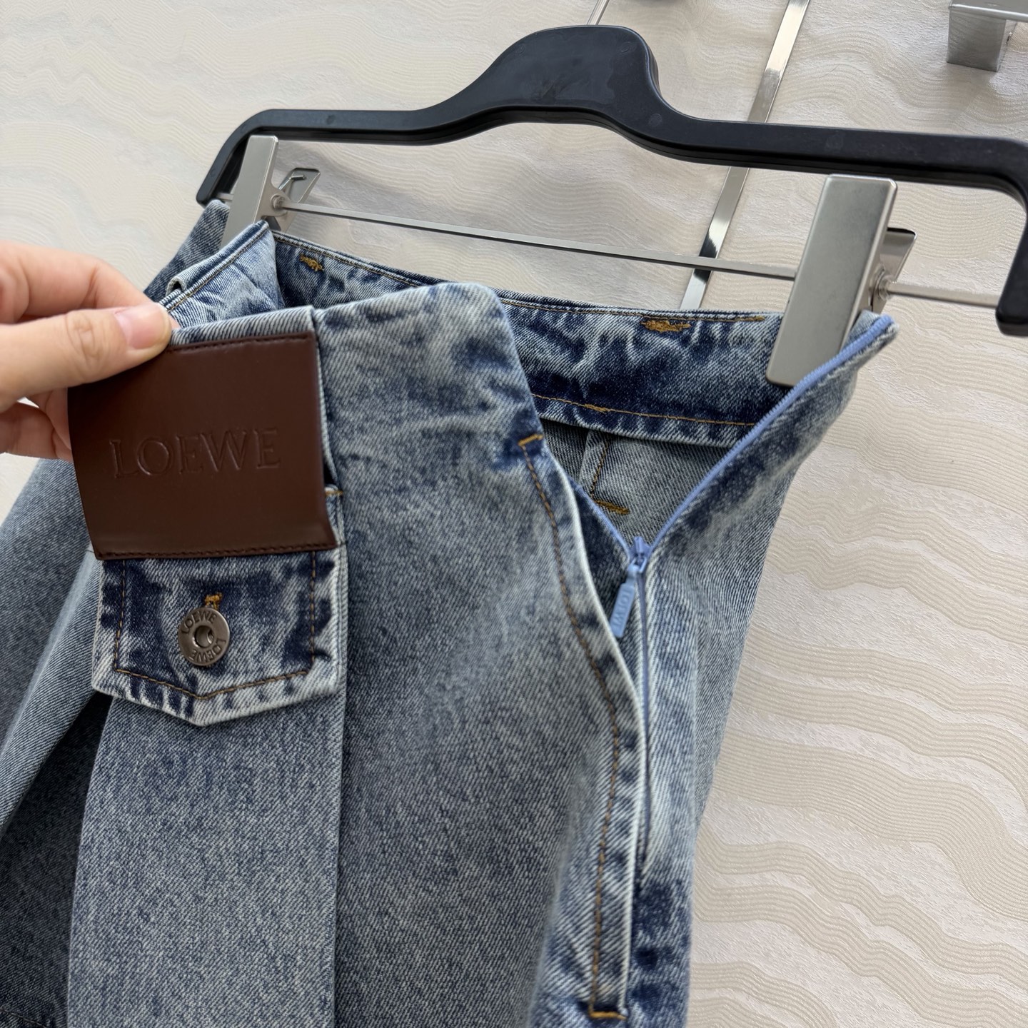 Details: Denim skirt with pleated leather label, enzyme wash, versatile and stylish, high-end customization, fine workmanship