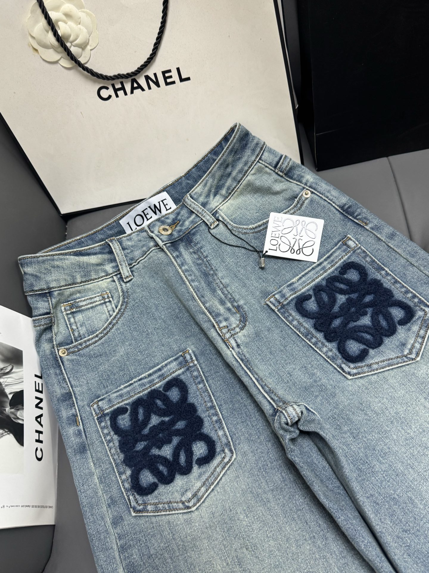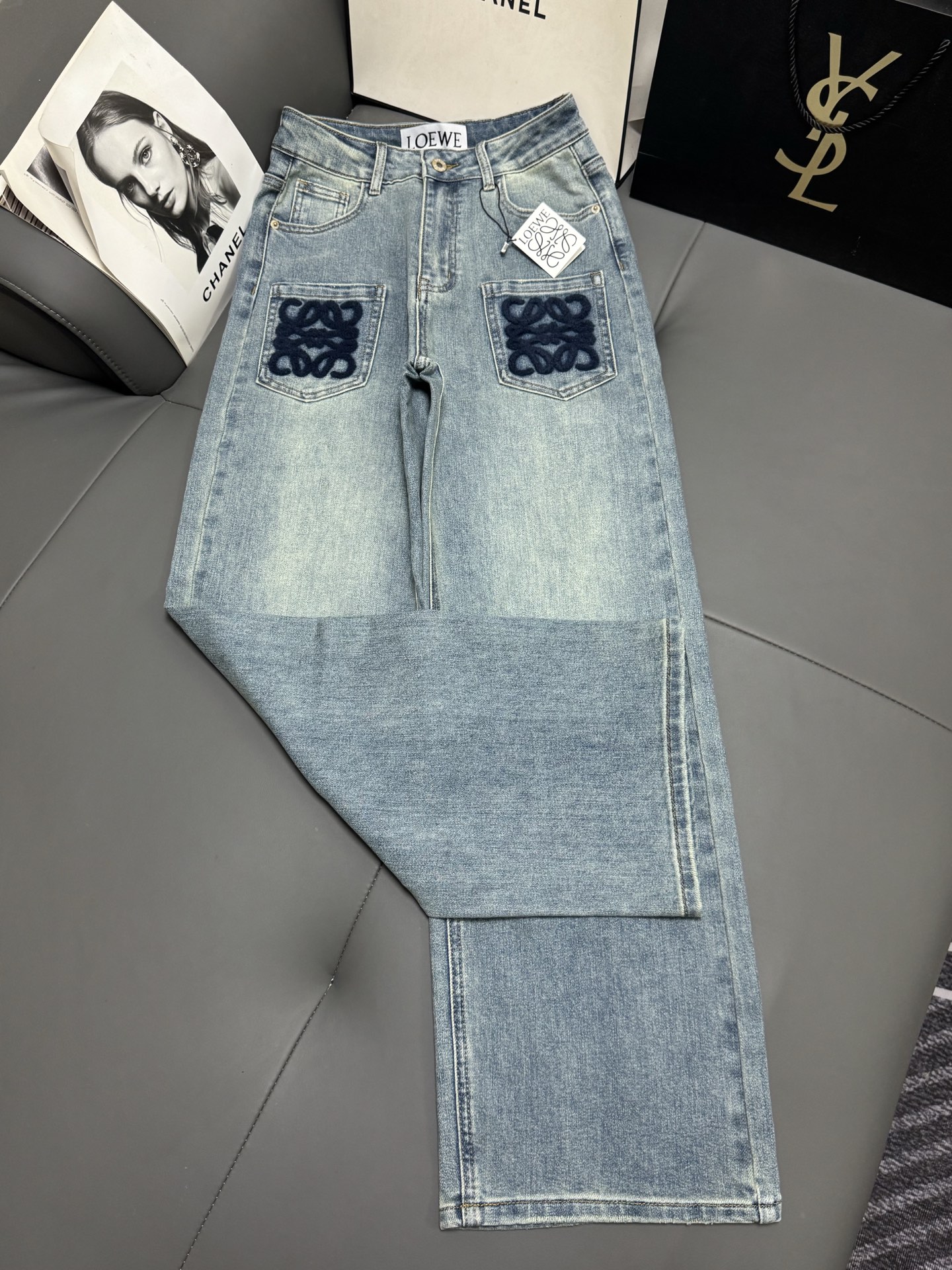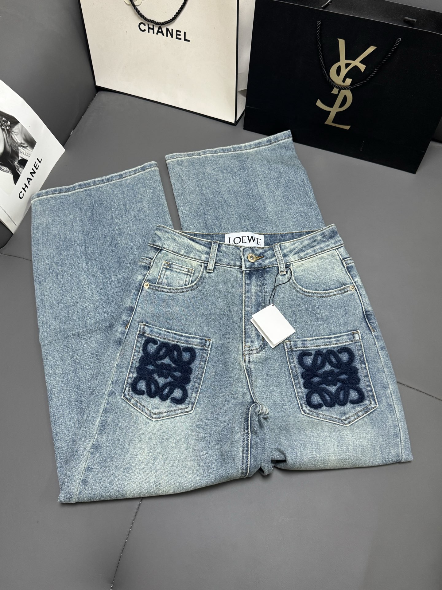 Details: Mid-high waist elastic straight-leg jeans, light wash, with embroidery.