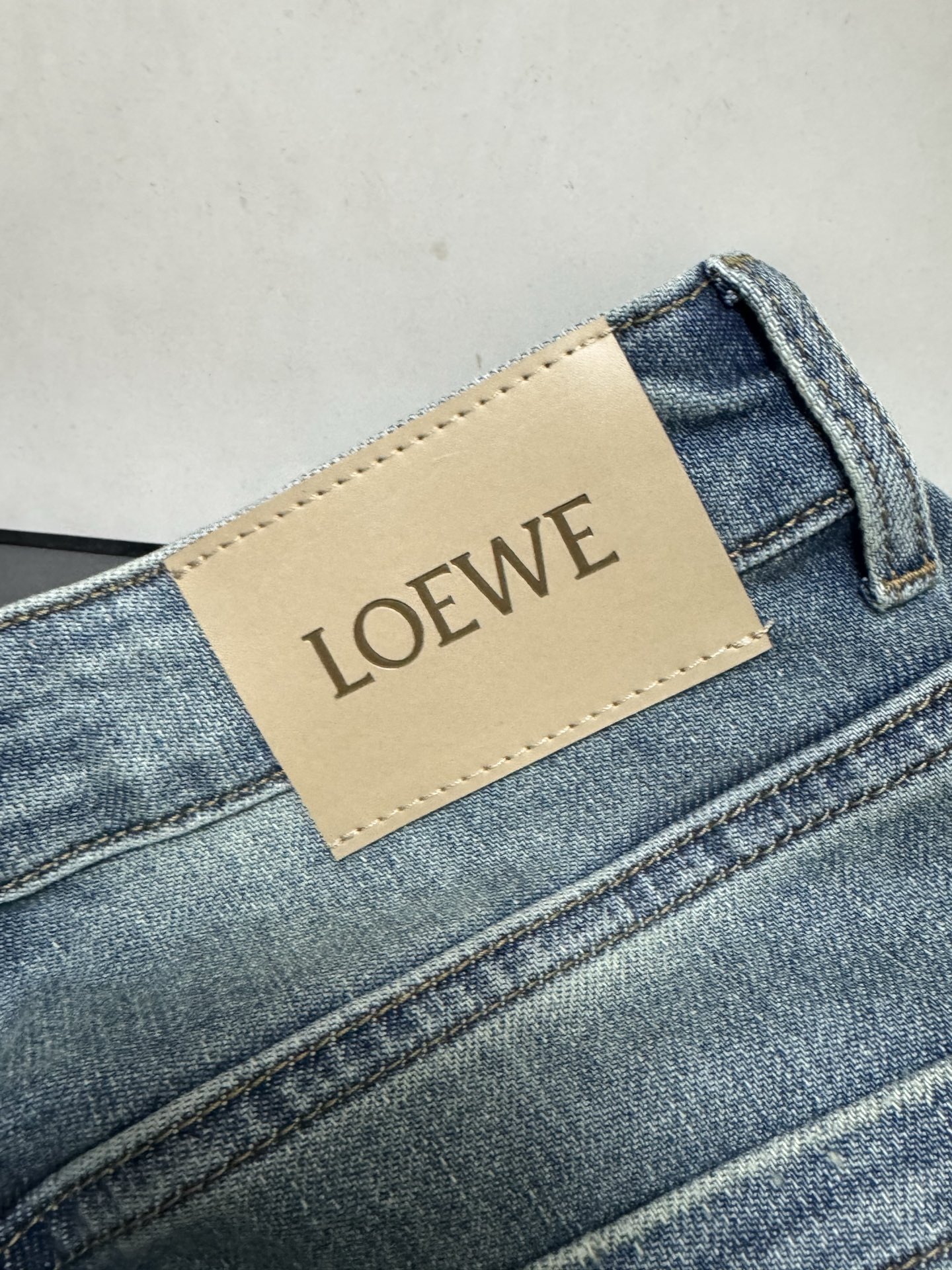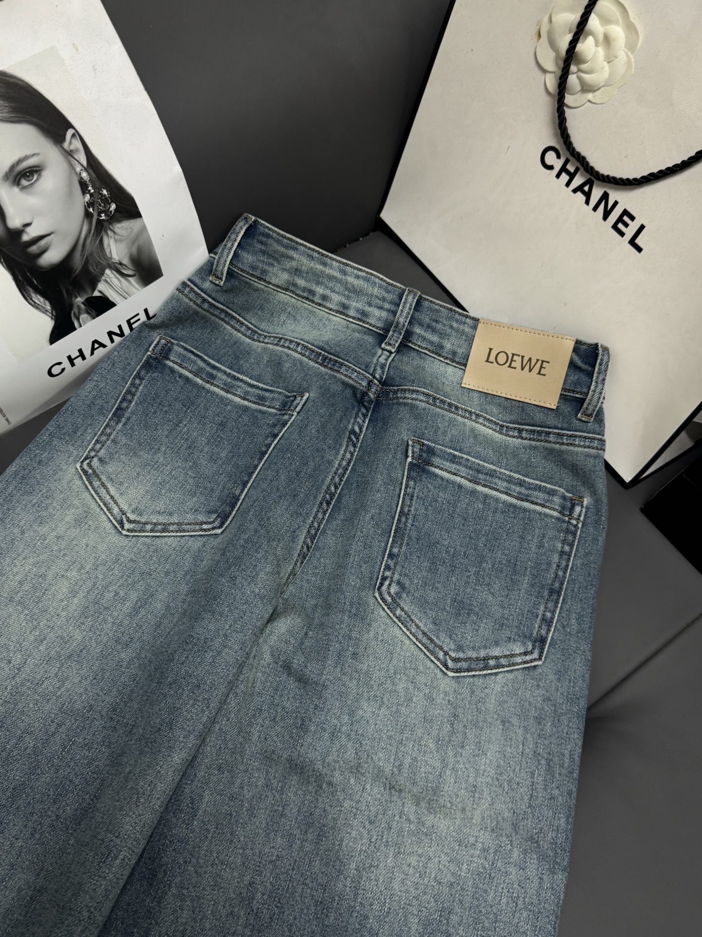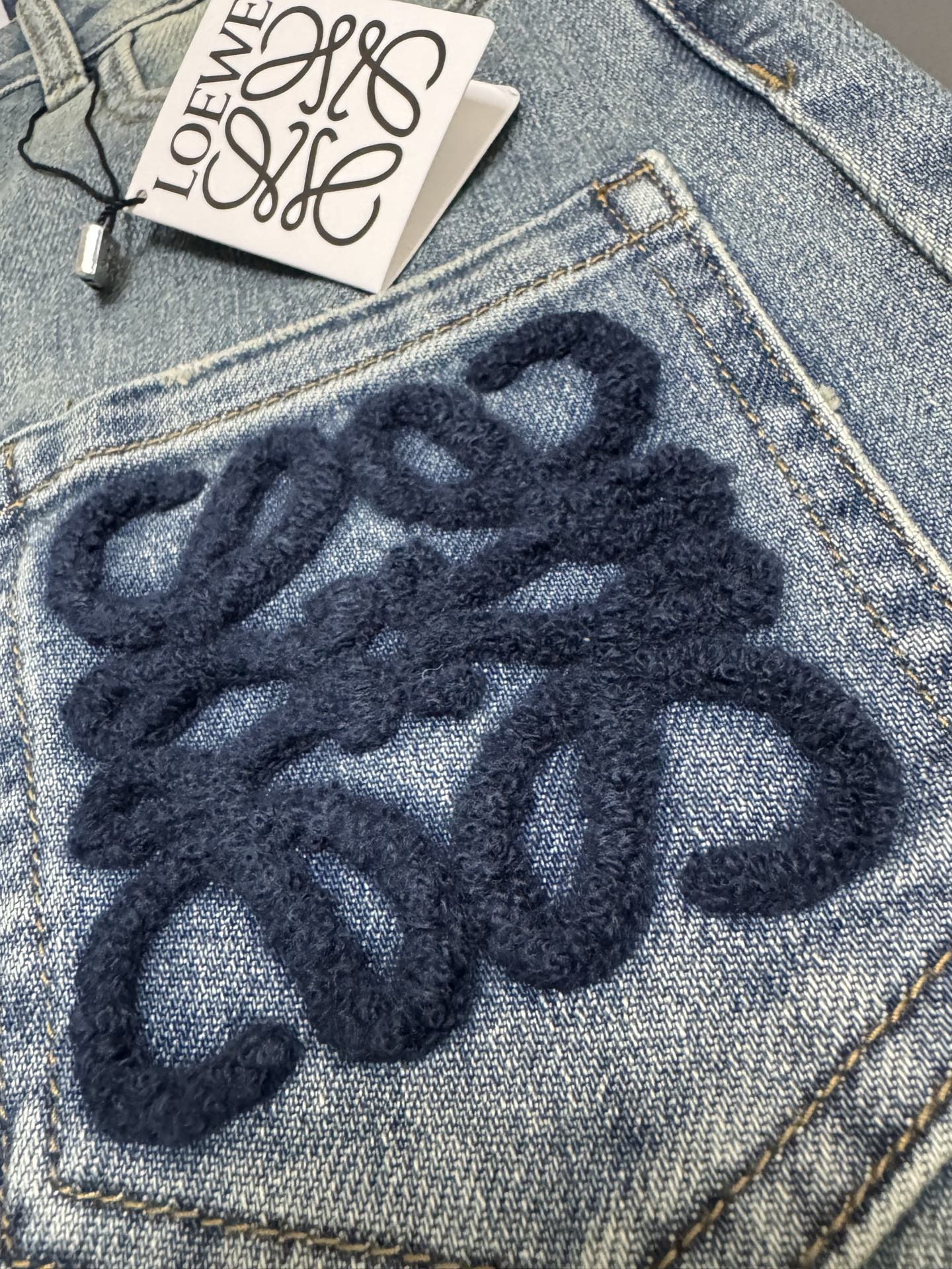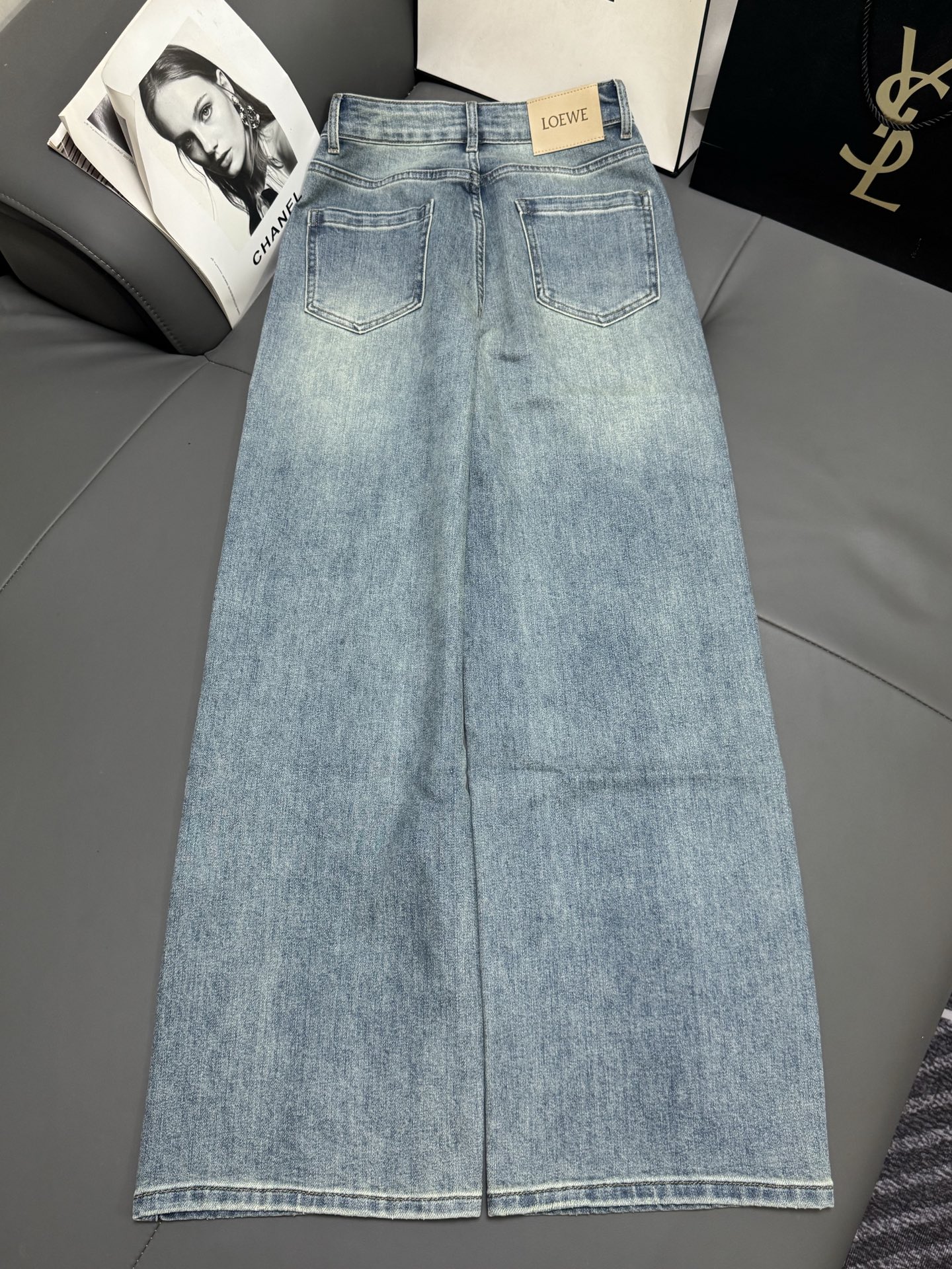 Details: Mid-high waist elastic straight-leg jeans, light wash, with embroidery.